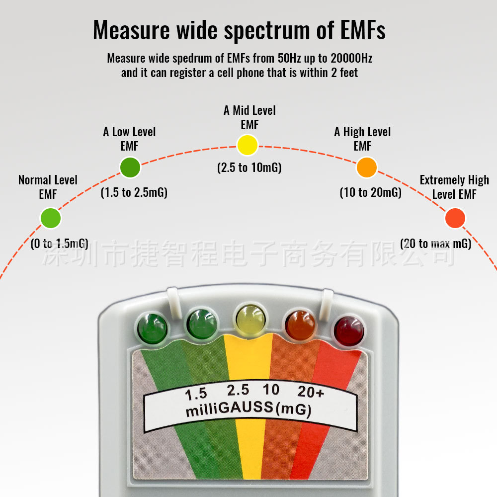深绿色0 1.5毫高斯;绿光1.5至2.5毫高斯;黄2.5至10毫高斯;橙10至20毫高斯;红20 +毫高斯;