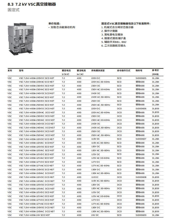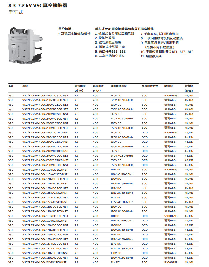 Контактор ABB VSC/P 7,2 кВ-400 А 220 В/230 В/240 В/250 В переменного тока DCO SCO NST