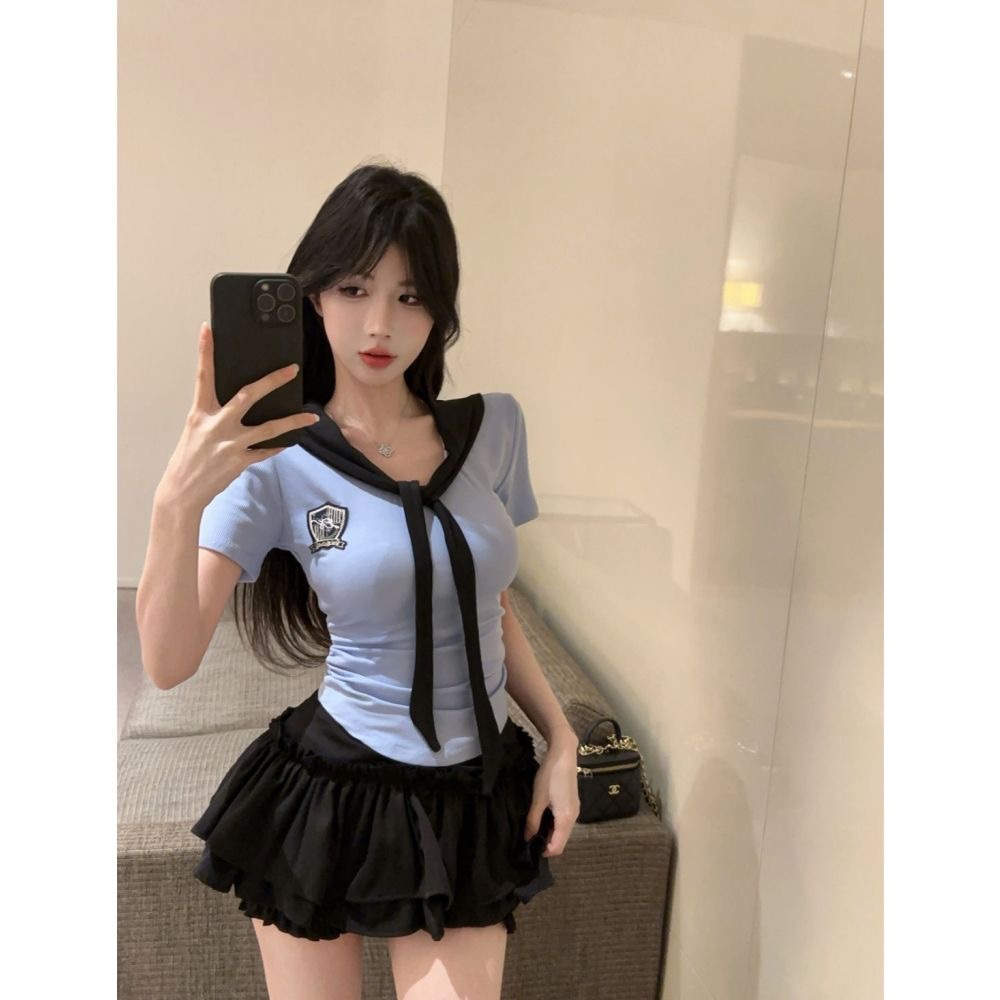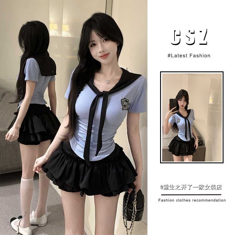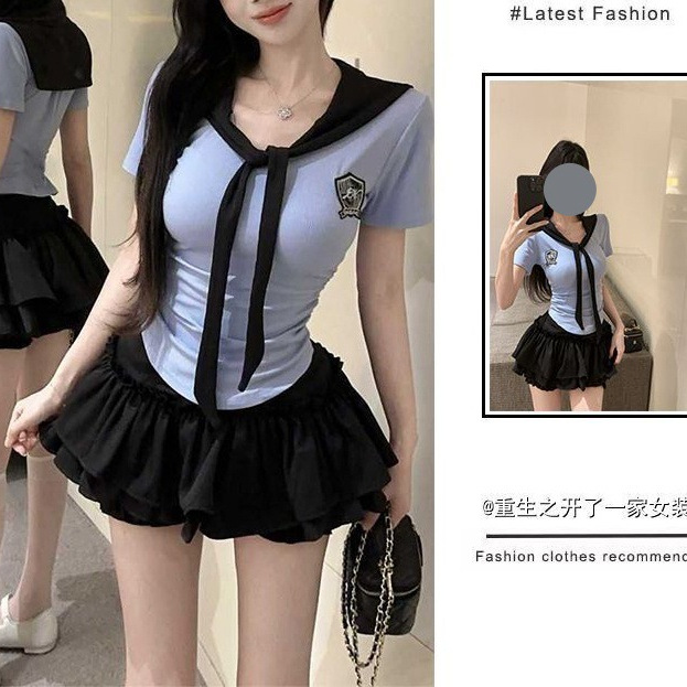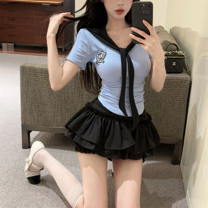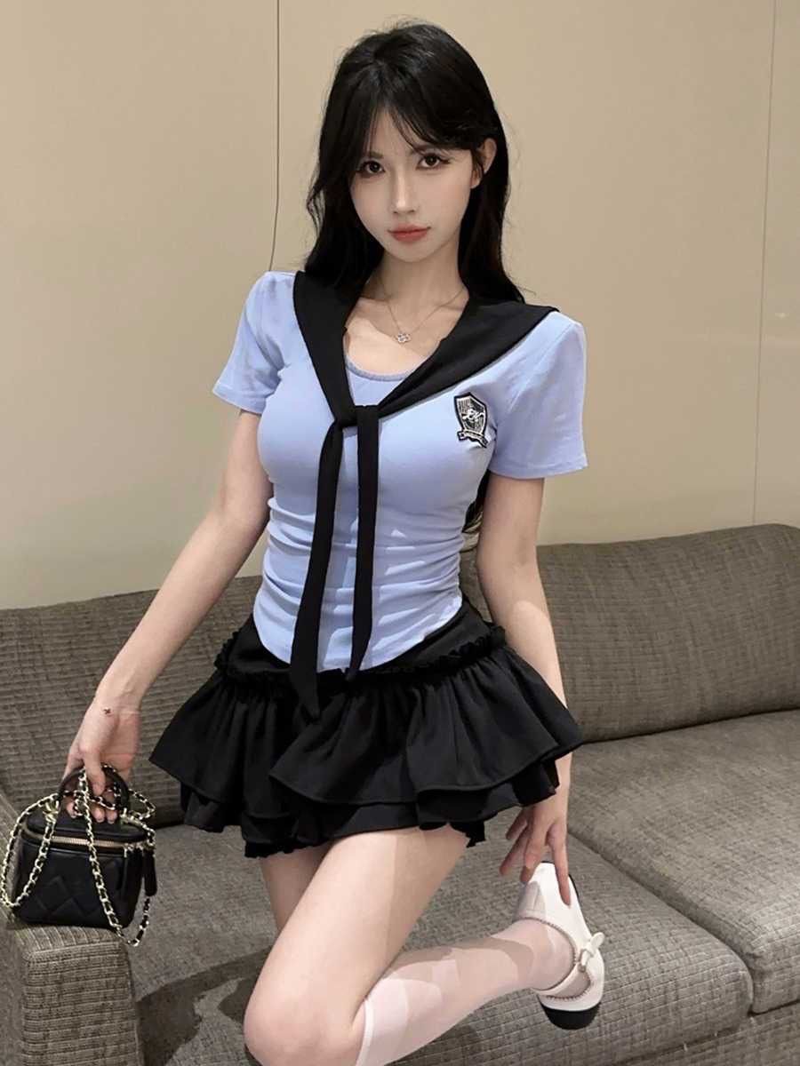 Летний комплект униформы JK для женщин, сладкий и пряный стиль интернет-знаменитостей, высококачественный комплект из двух предметов с короткими рукавами и облегающей юбкой с высокой талией.