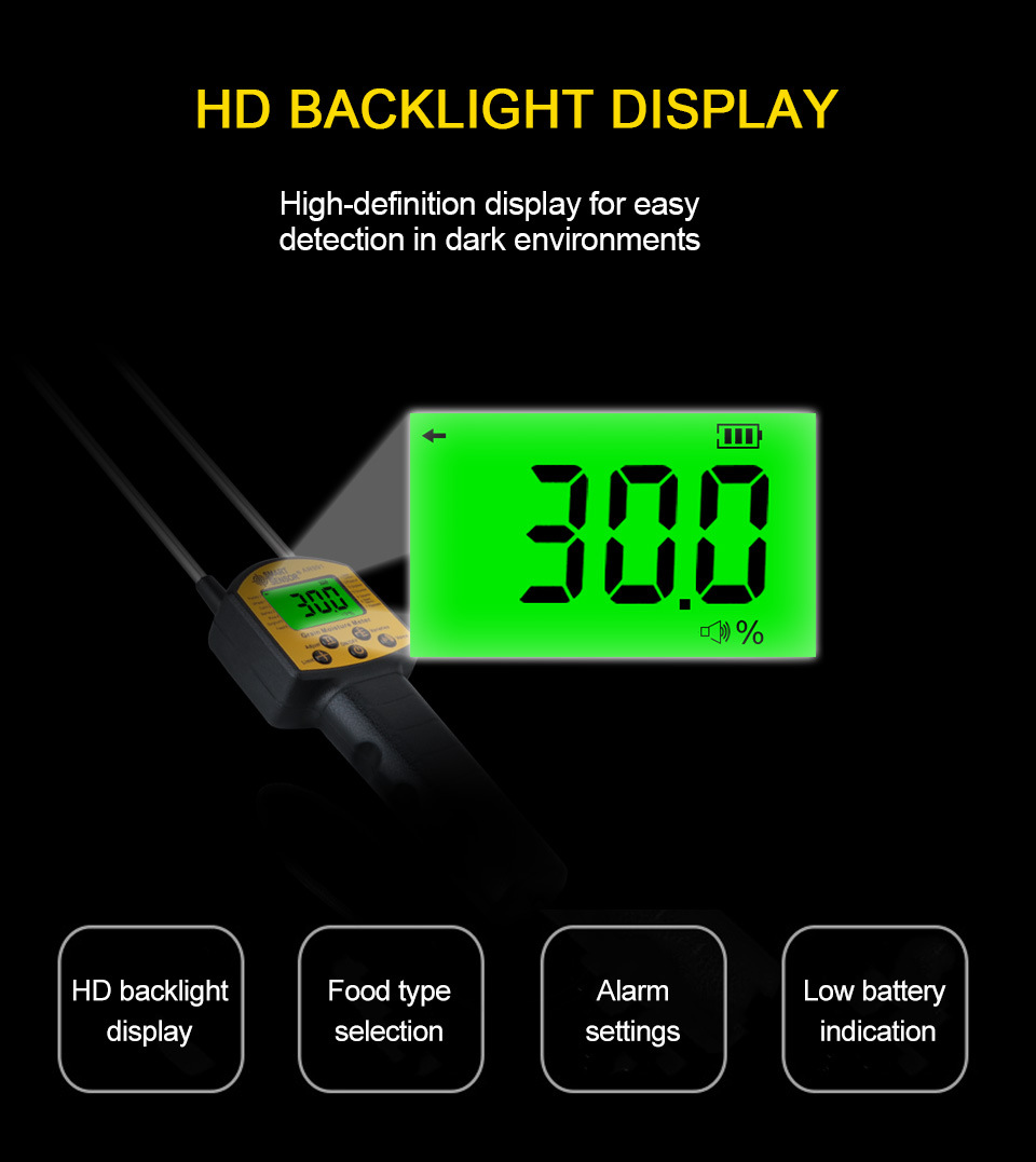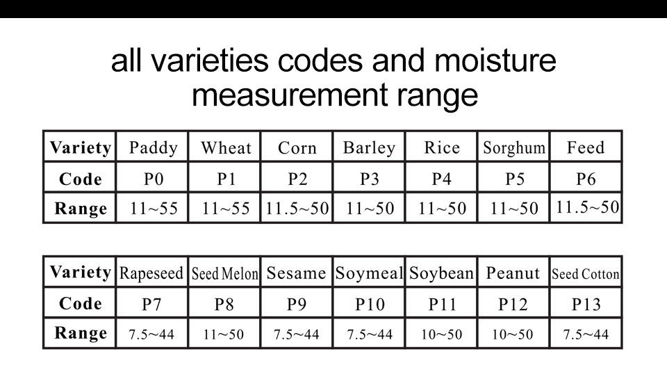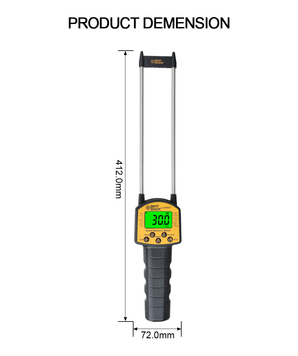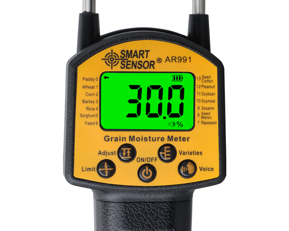 Smart Sensor Moisture meters are used to measure the percentage of water in a given substance. This information can be used to determine if the material is ready for use, unexpectedly wet or dry, or otherwise in need of further inspection. Grain Can Be Measured: rapeseed, sesame, soybean meal, cotton, soybean, peanut,barley, rice, sorghum, watermelon seed, paddy, wheat, maize, fodder
