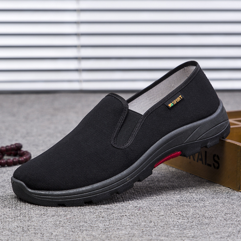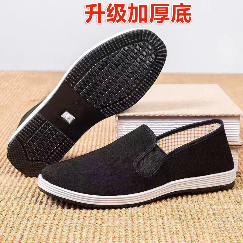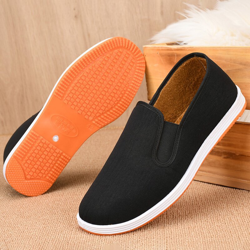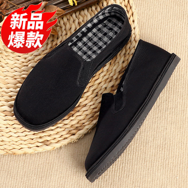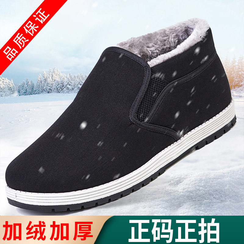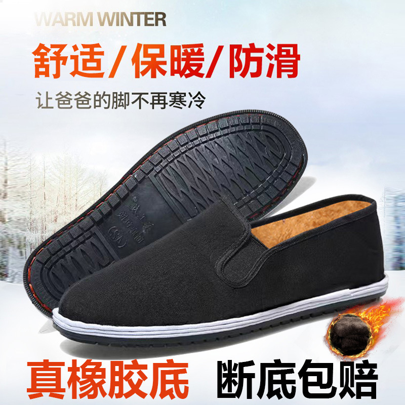 Зимняя мужская обувь, старая пекинская тканевая обувь, мужские туфли без шнуровки, дышащая сухожильная подошва, оптовая продажа высоких сезонных черных хлопчатобумажных туфель на флисовой подкладке.