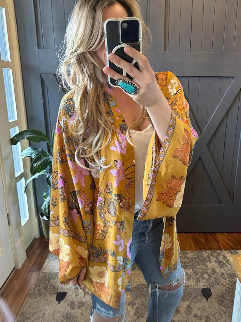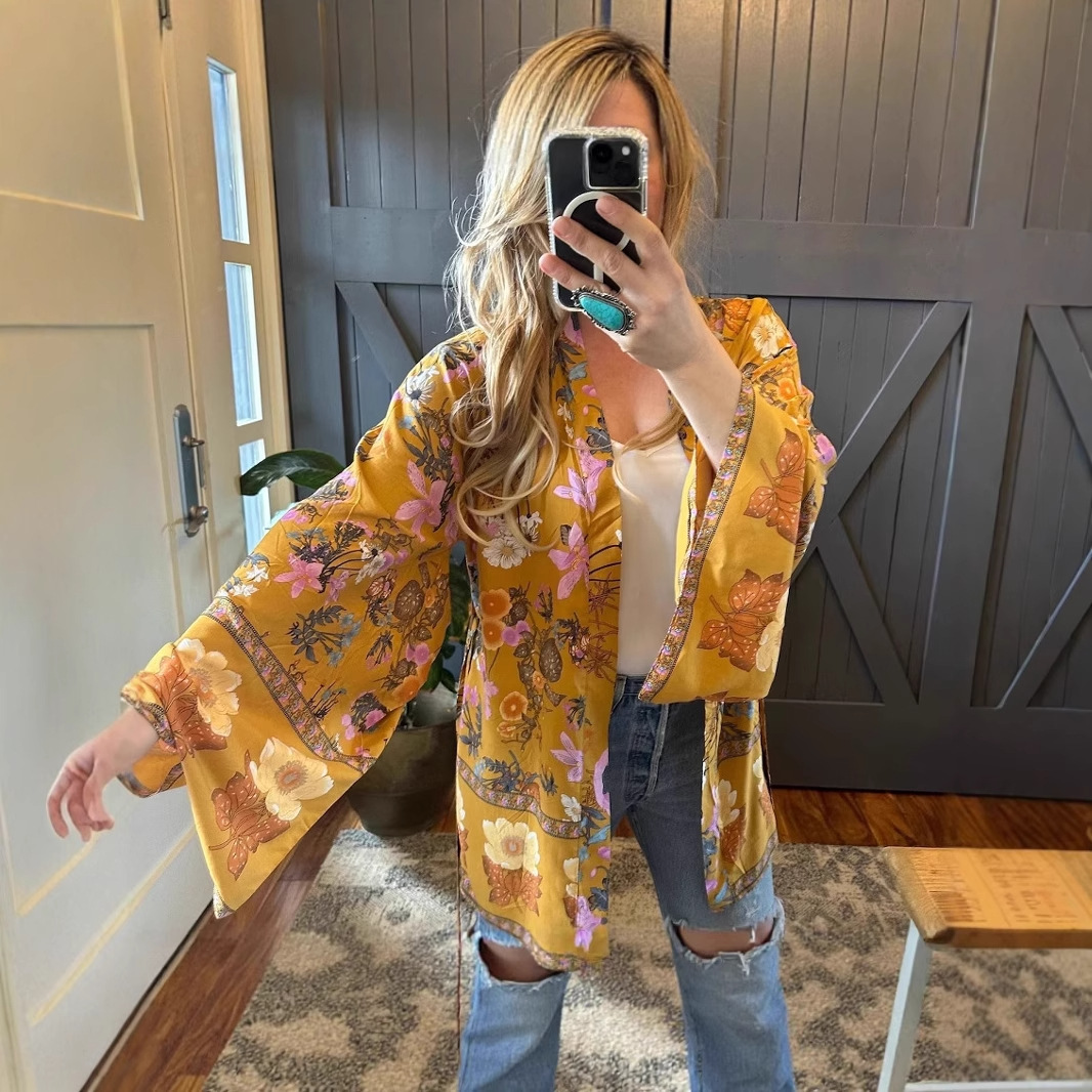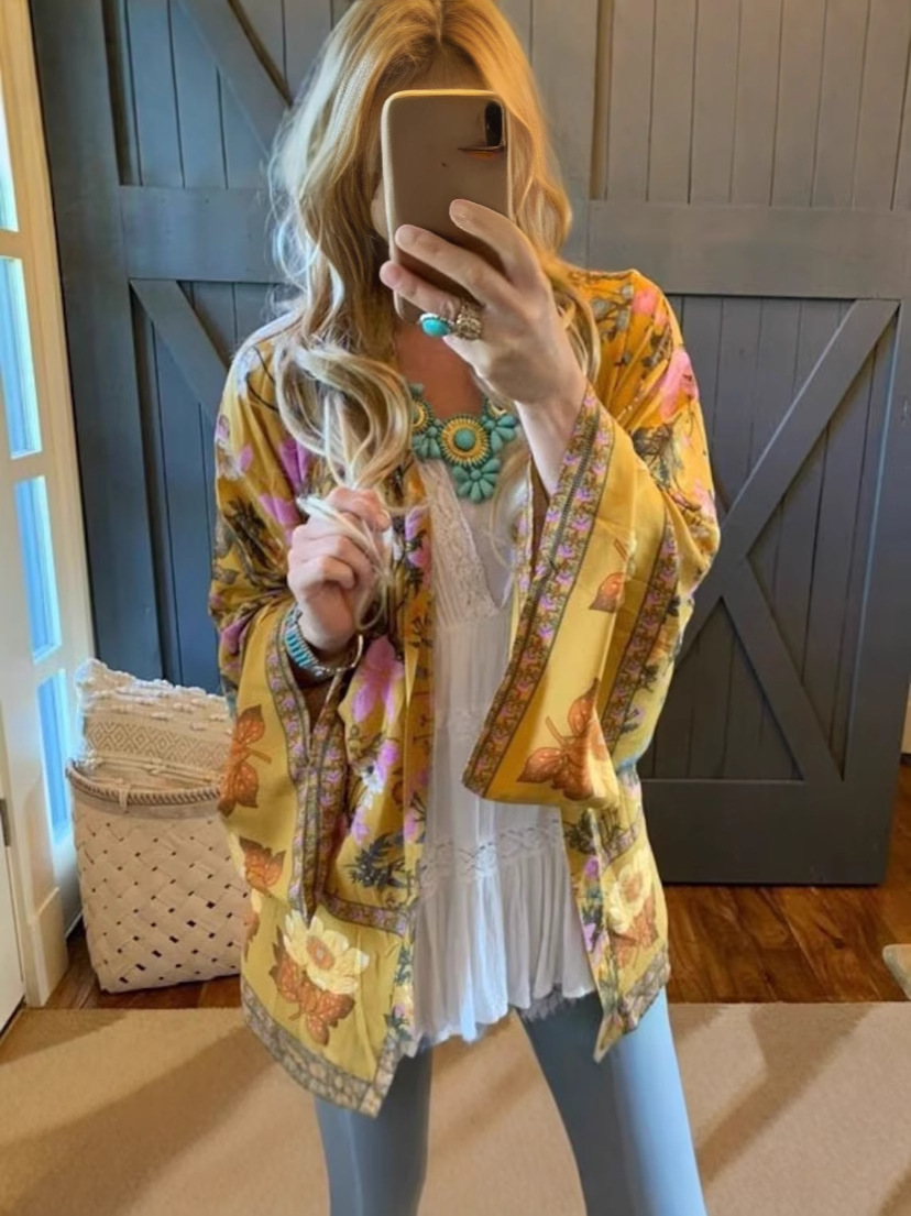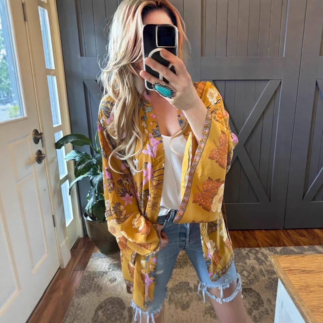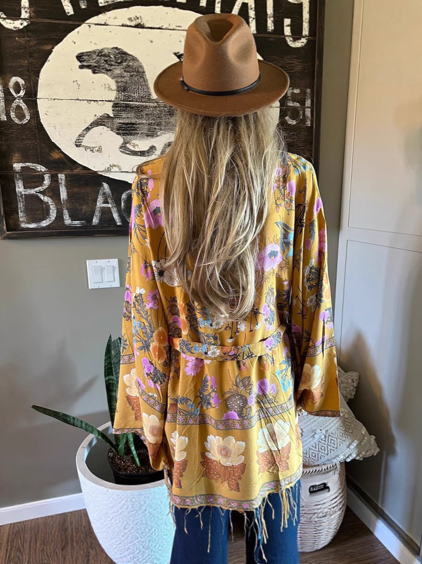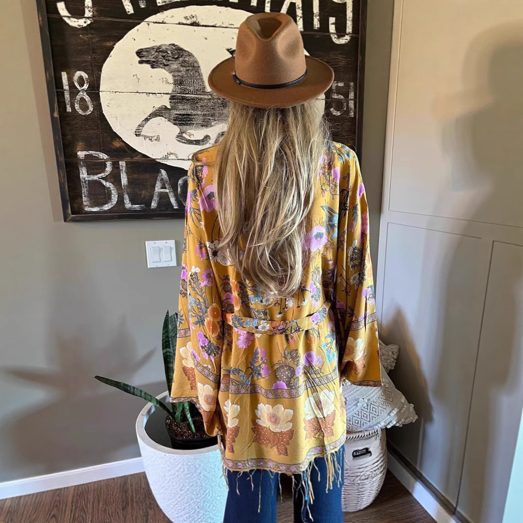 Европейский и американский лавандовый богемный стиль, цветочное кимоно, кардиган без рукавов, топ с перьями, куртка, купальник, блузка в стиле хиппи