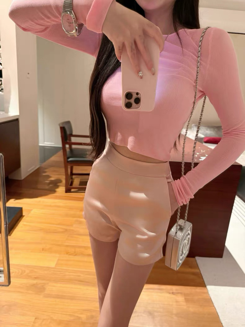 2025ss Корейский стиль, обтягивающая розовая и черная футболка с прямыми плечами, утягивающая, слегка прозрачная, с круглым вырезом и длинными рукавами, трикотажная базовая футболка, шорты.