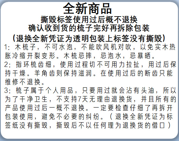 所有梳子拆除真空包装和撕毁梳子标签的一概不退换。
