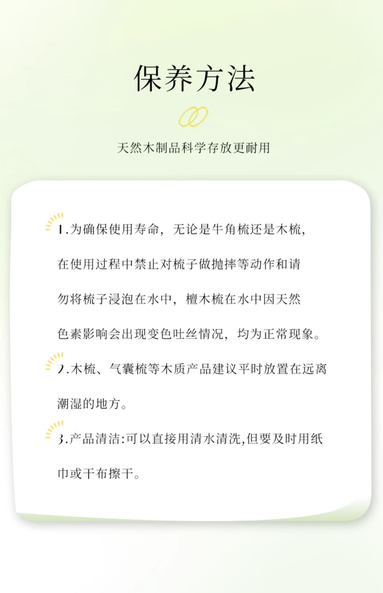 【包装】:根据梳子材质不同有专门的隔油纸或简洁透明袋包装,如需礼盒,请联系客服另行选购。