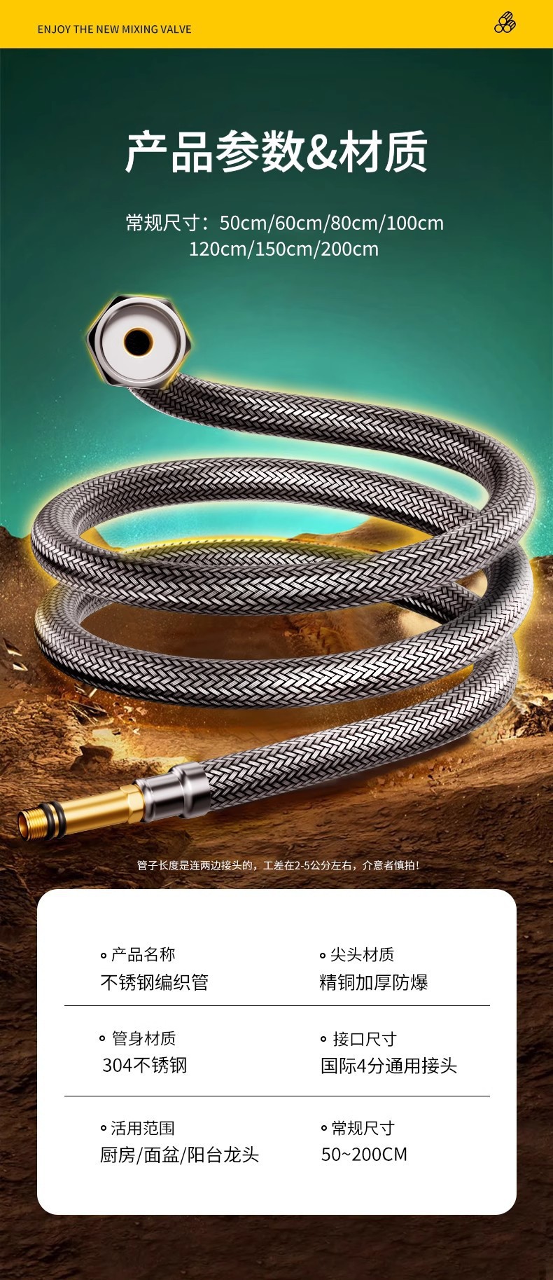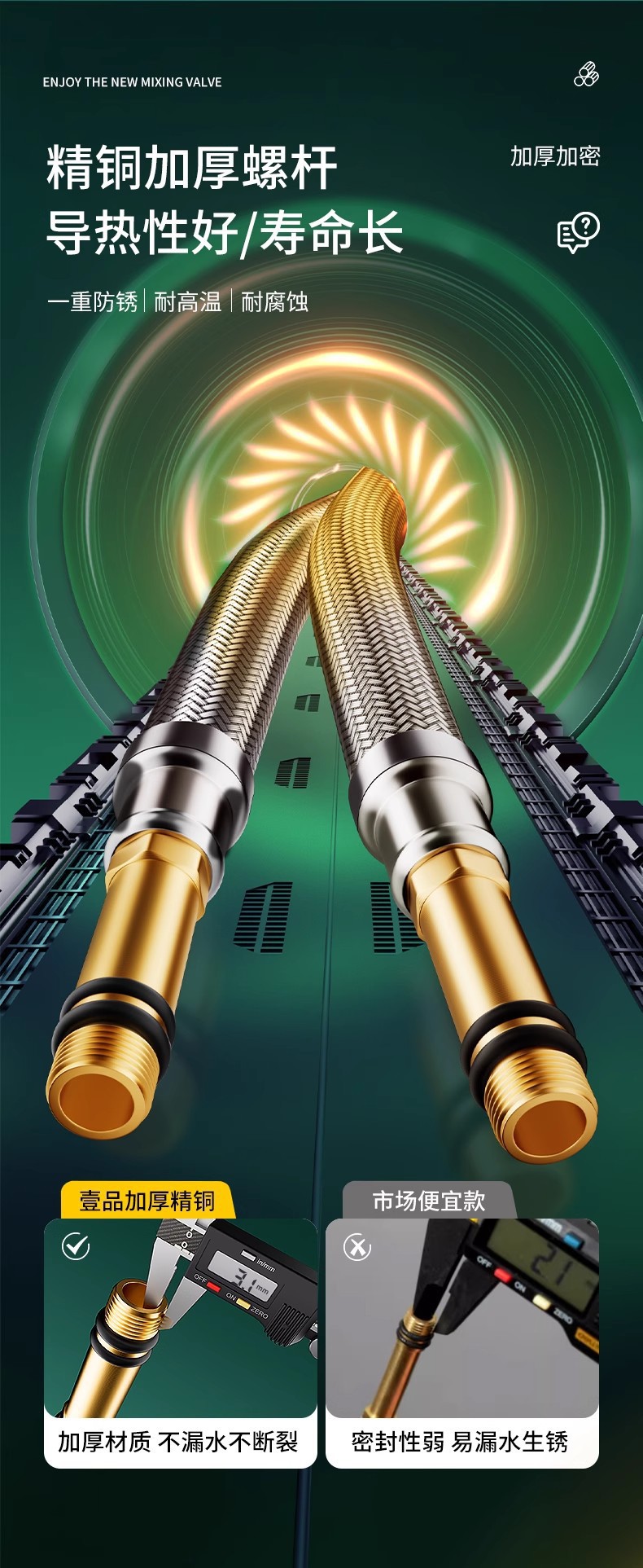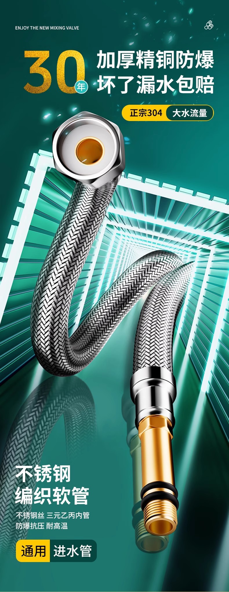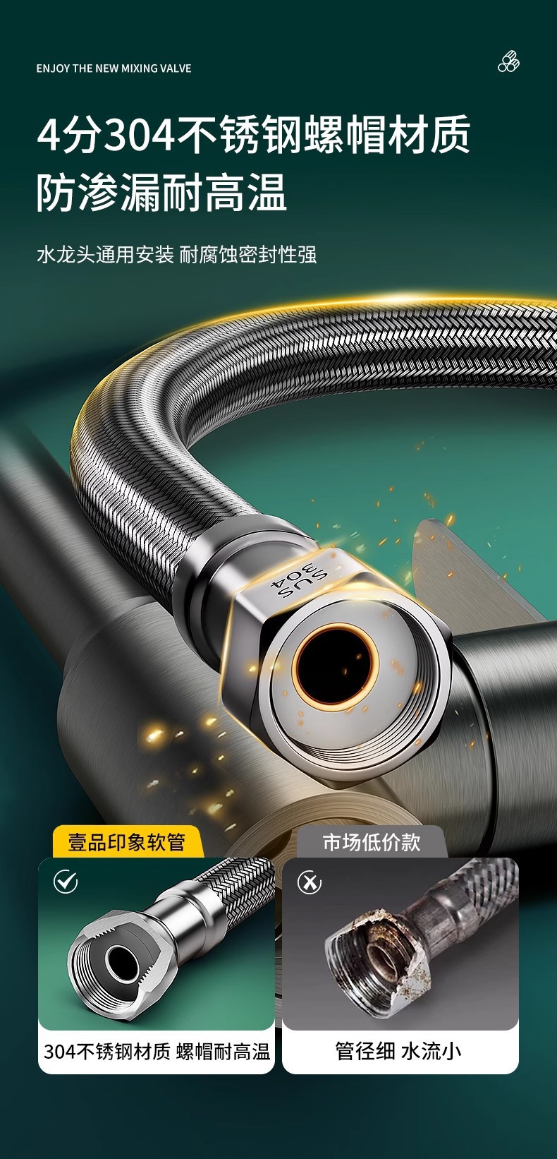 Плетеный шланг из нержавеющей стали 304 с удлиненным тонким медным резьбовым стержнем для подачи горячей и холодной воды, подходит для умывальника и раковины, взрывозащищенная труба.