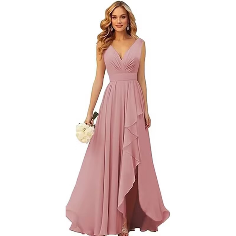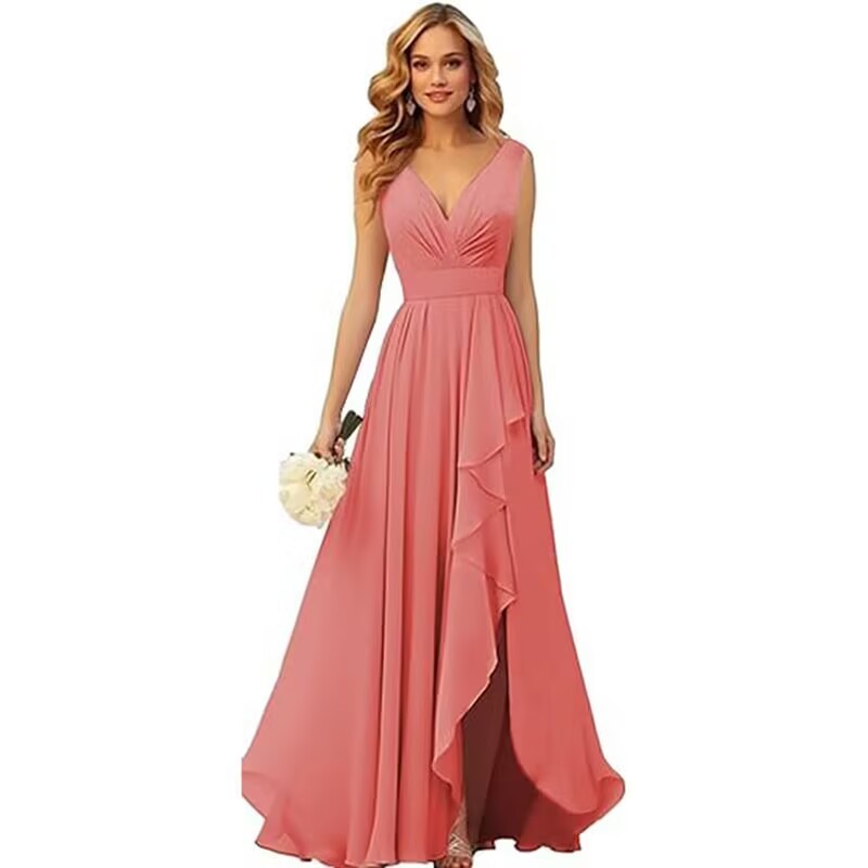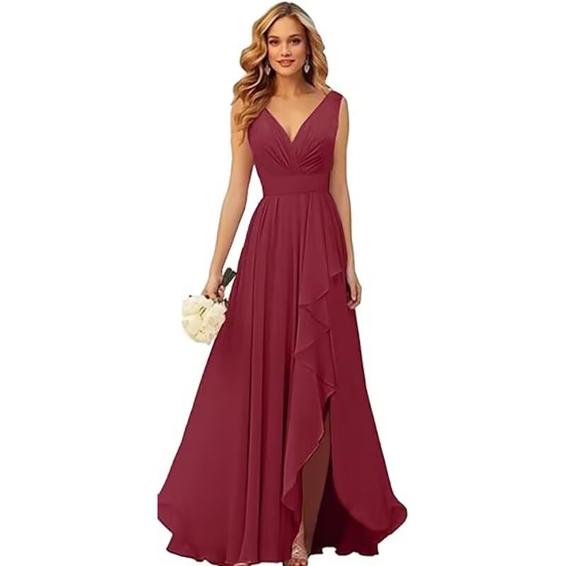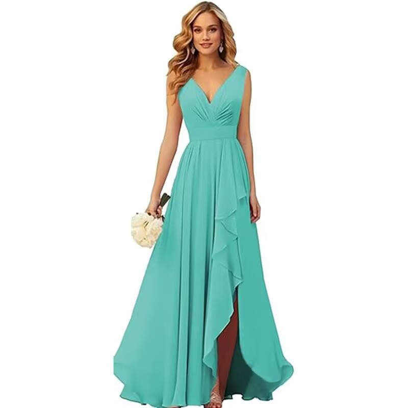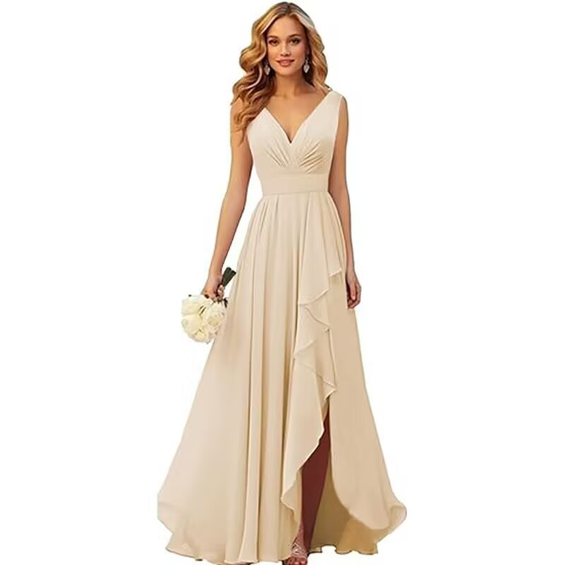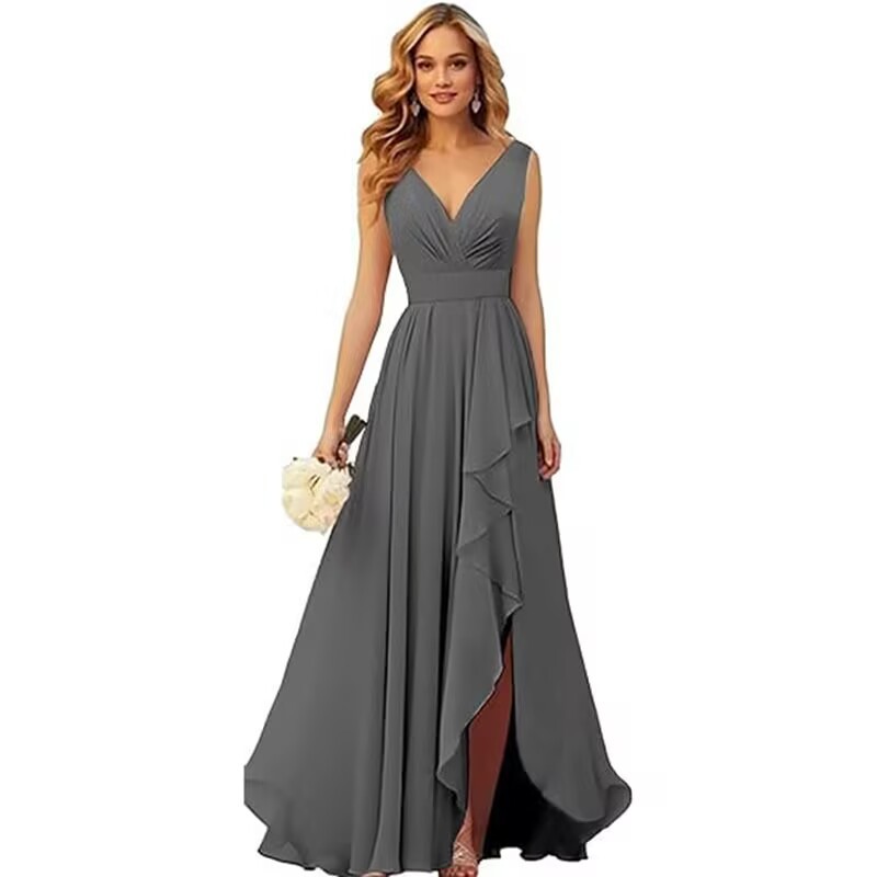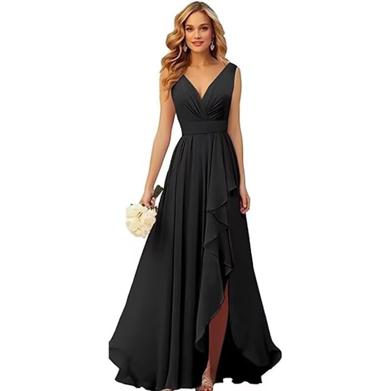 Вечернее платье 2025 года с V-образным вырезом, плиссированным разрезом, длинными бретелями, шифоновое платье для рождественской вечеринки, юбка для экспорта