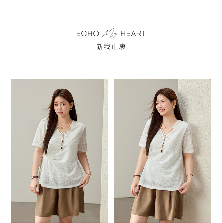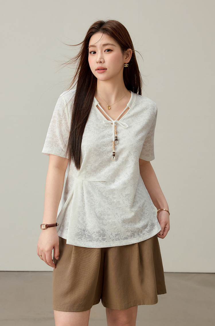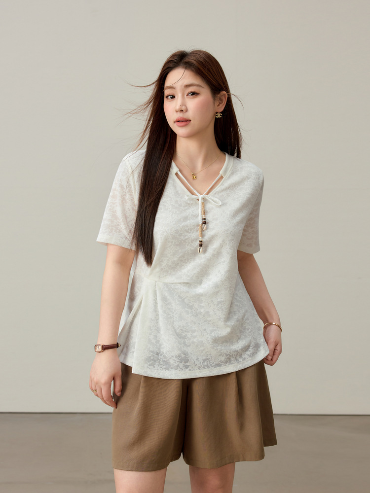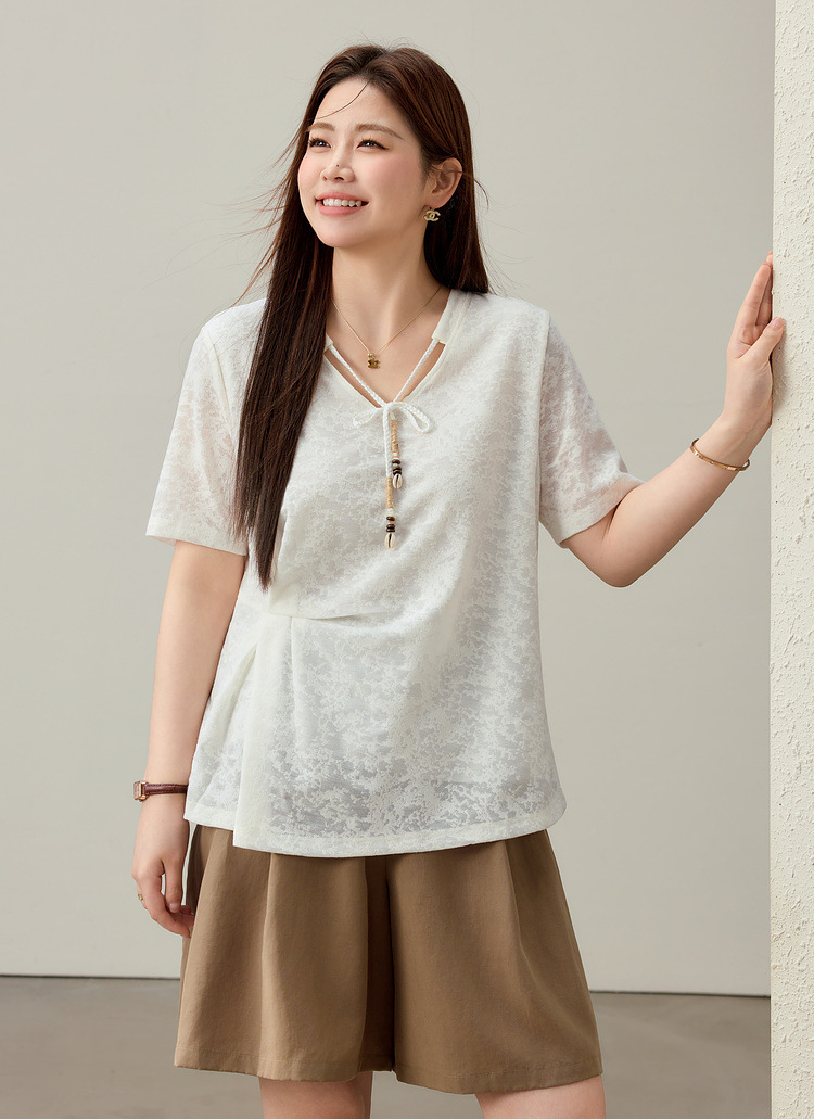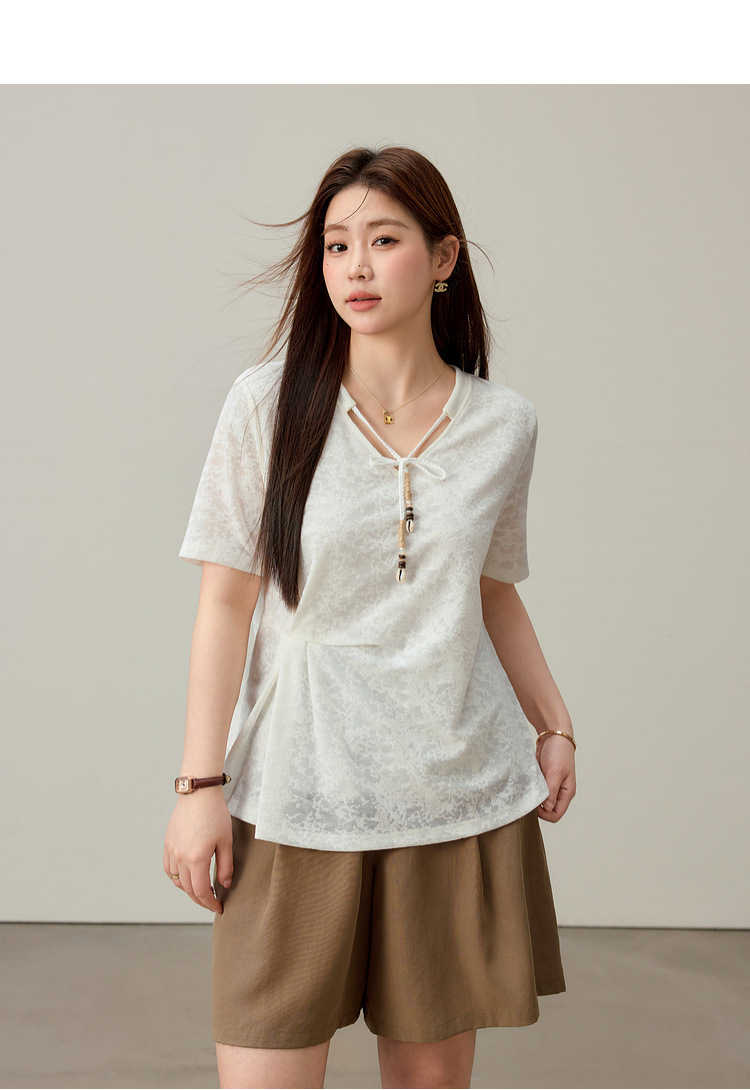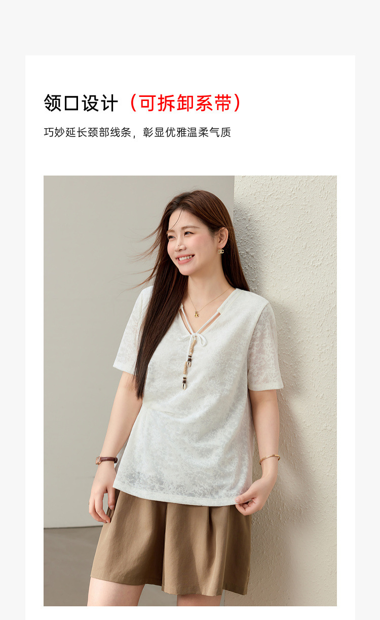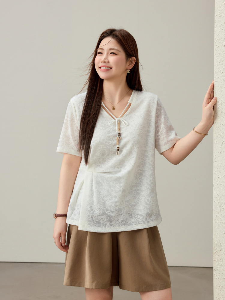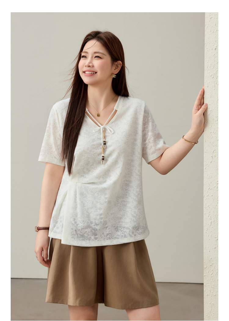 【Нежный аромат и редкие тени】Новый жаккардовый кружевной вязаный свитер в китайском стиле с v-образным вырезом для похудения, женская одежда больших размеров для женщин больших размеров, новый летний стиль.