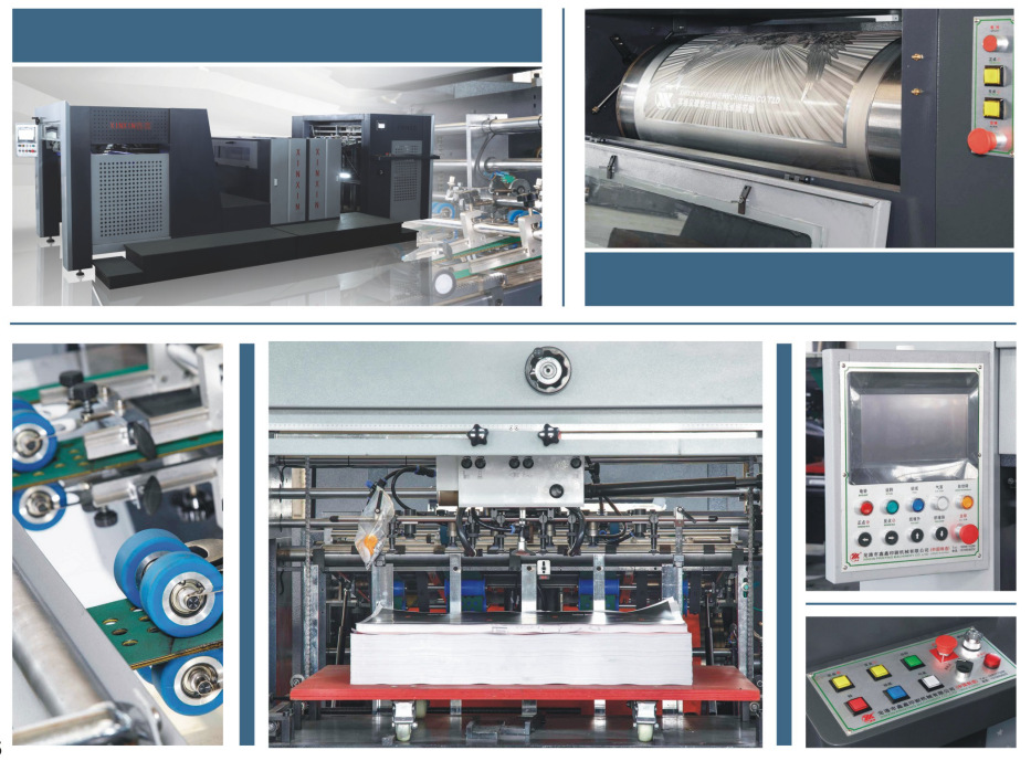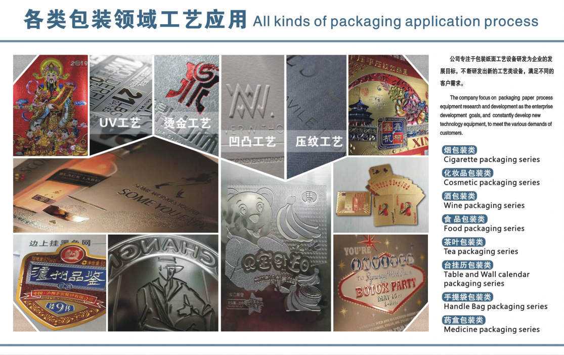 适应于酒盒、化妆品盒、药品包装盒、食品包装盒、烟盒及台挂历盒广告画等产品,它能形成折光纹、镭射纹、磨砂纹和冰花纹以及凹凸等图纹,是目前国际上实用的印后加工设备。