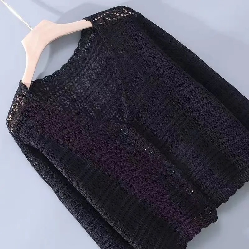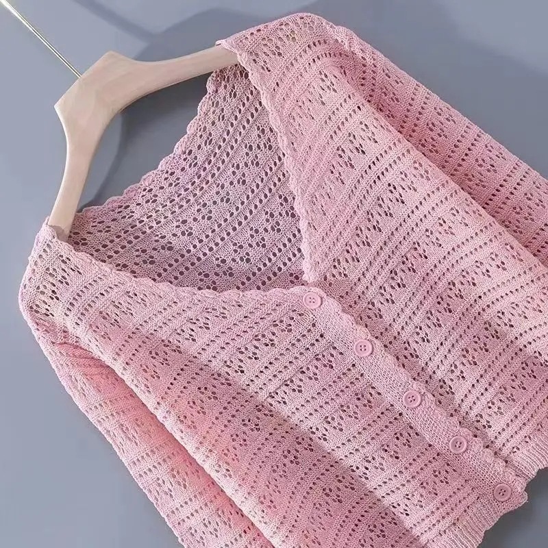 Новый летний вязаный кардиган из ледяного шелка для женщин, свободный корейский стиль, тонкий короткий стиль с длинными рукавами, полая солнцезащитная одежда, шаль, верхняя одежда