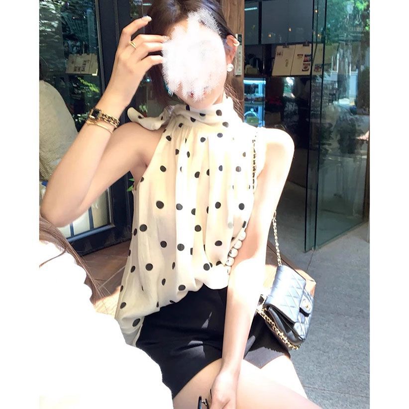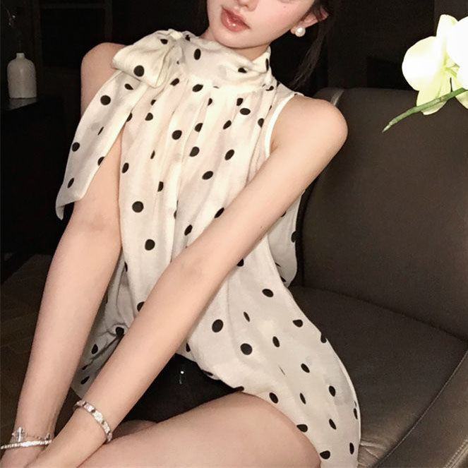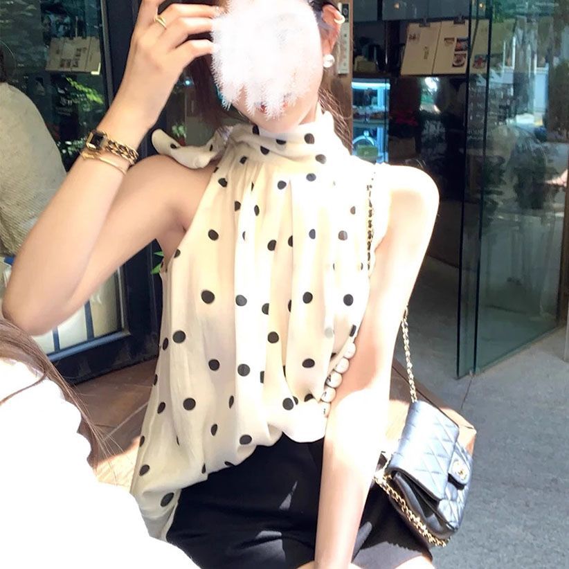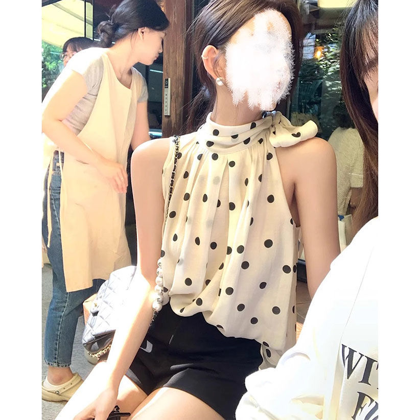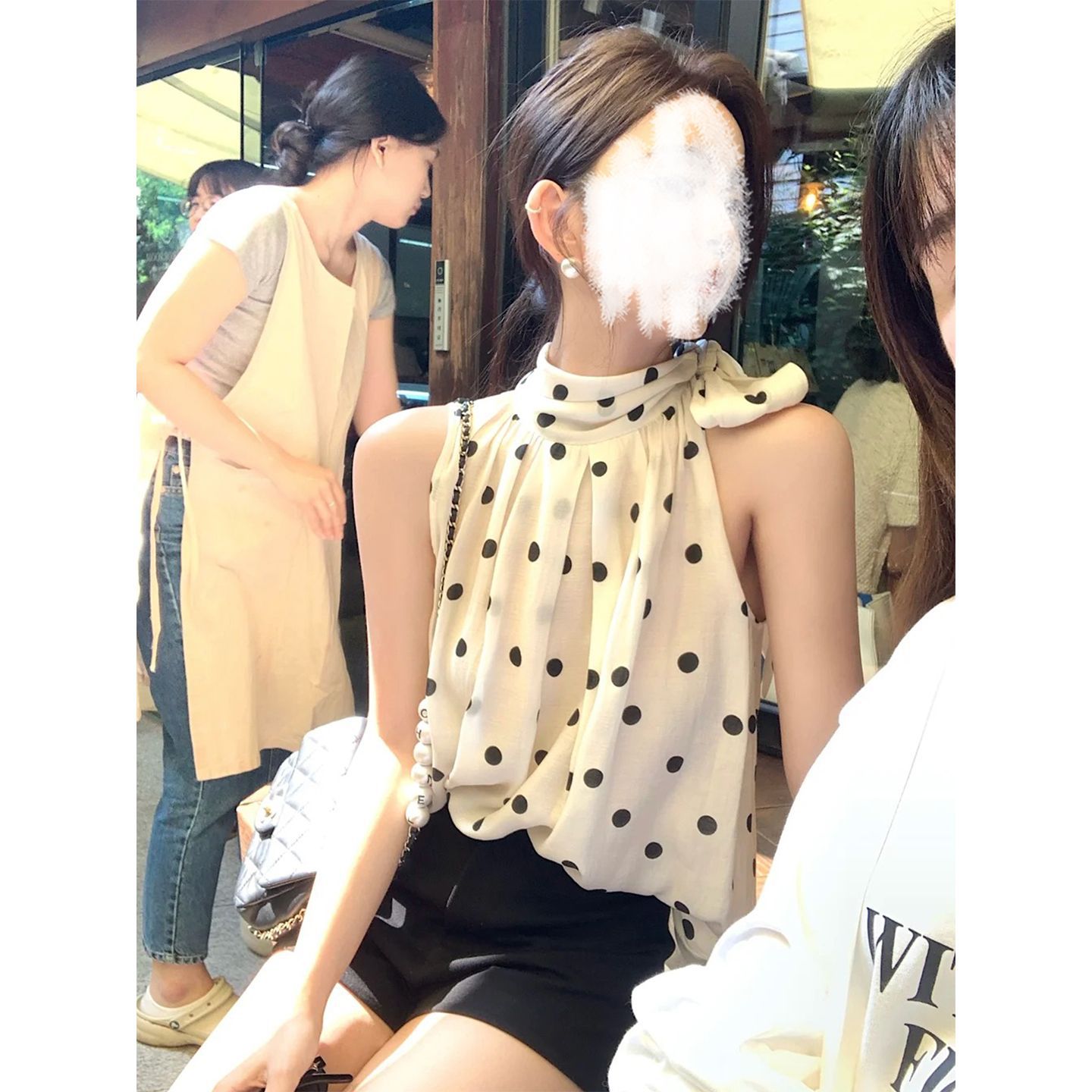 2025 Корейский стиль простая футболка французский горошек безрукавка топ с открытыми плечами женская летняя асимметричная облегающая майка-халтер