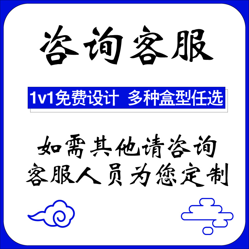 【注】所有盒型均为定制,店内展示的只是部分盒型,如果没看到想要的盒型可以发图片给客服确认沟通。店内所标价格和规格均为方便客户在线下单使用,未沟通直接下单的无法发货。各种规格和材质的包装盒都可以提供定做,请与客服沟通后再下单。支持打样!