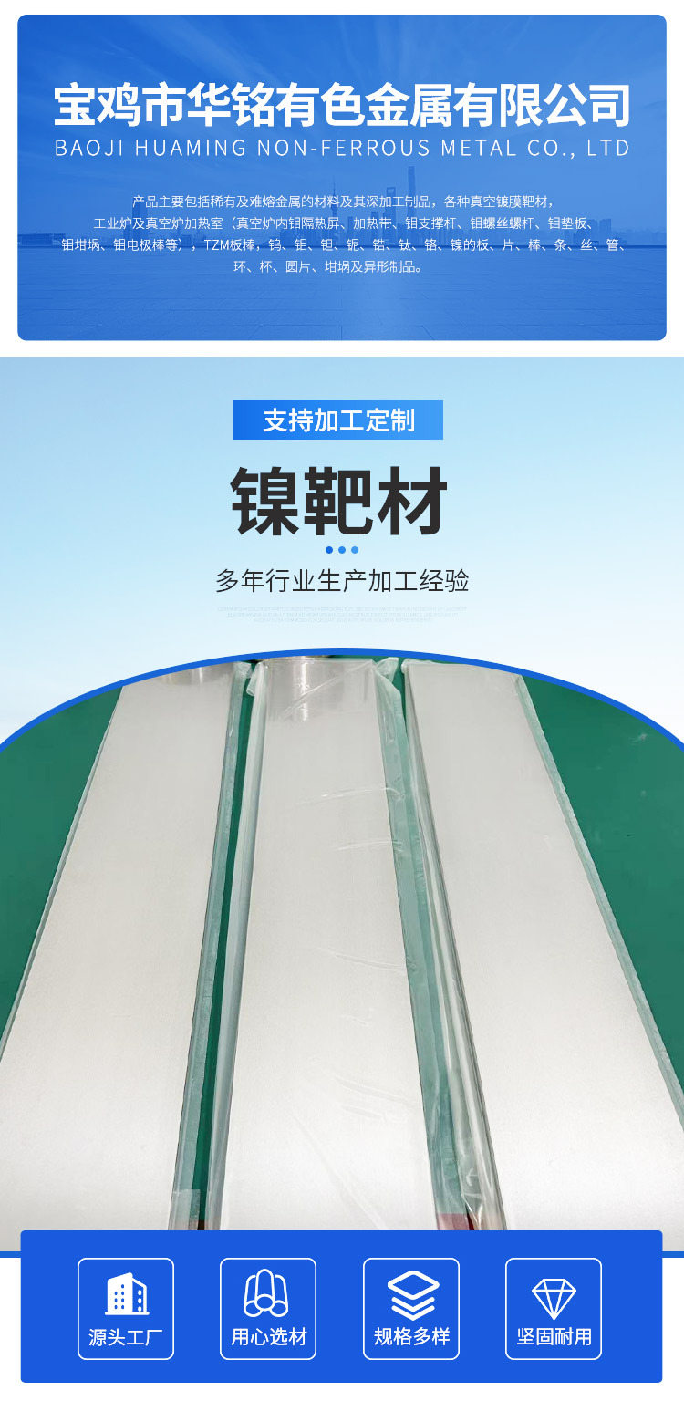 Цель магнетронного распыления никеля высокой чистоты может достигать цели 4N5pvd, цельный и прочный металл никеля, равномерная и прочная обработка цифровых оптических материалов.