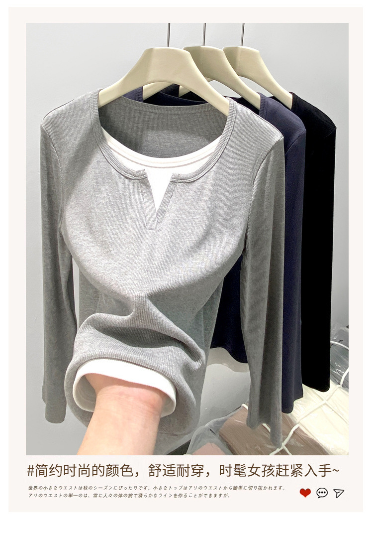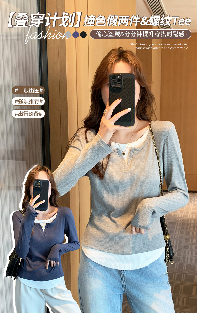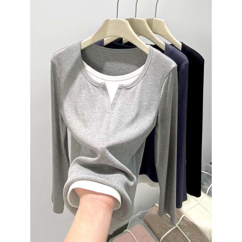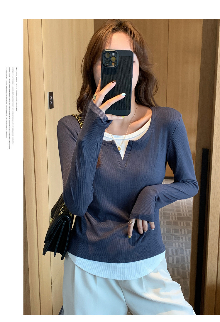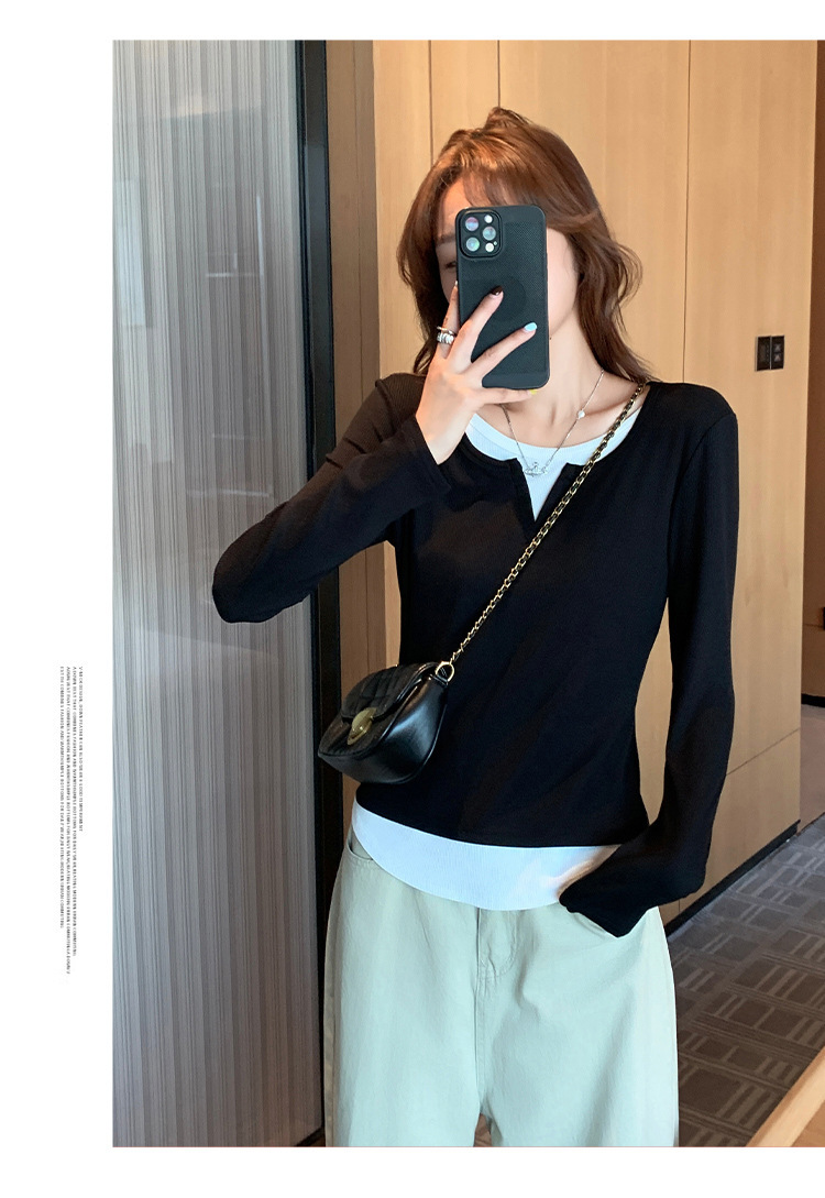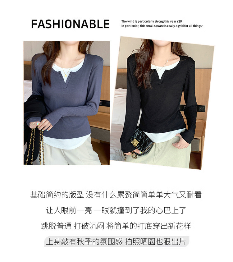 Женская футболка с длинными рукавами из двух частей, осенняя, стройнящая, шикарный и красивый топ, рубашка с круглым вырезом.