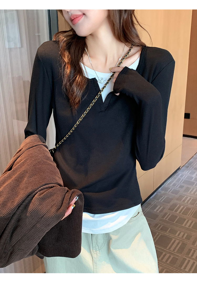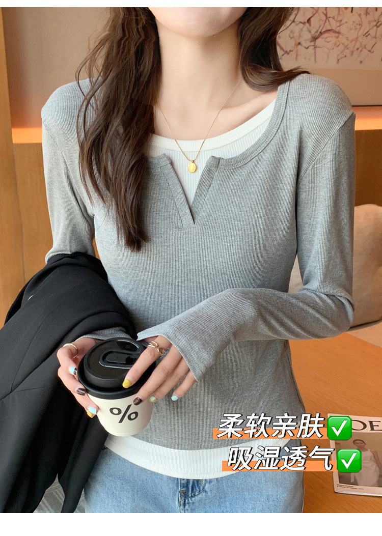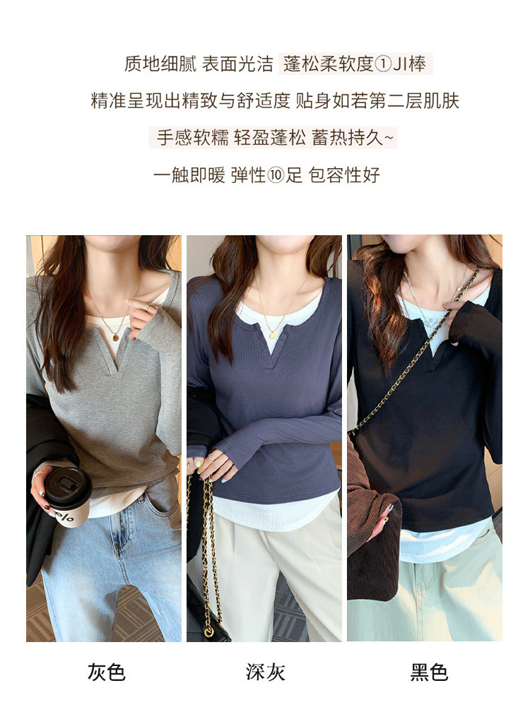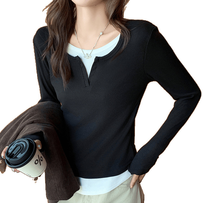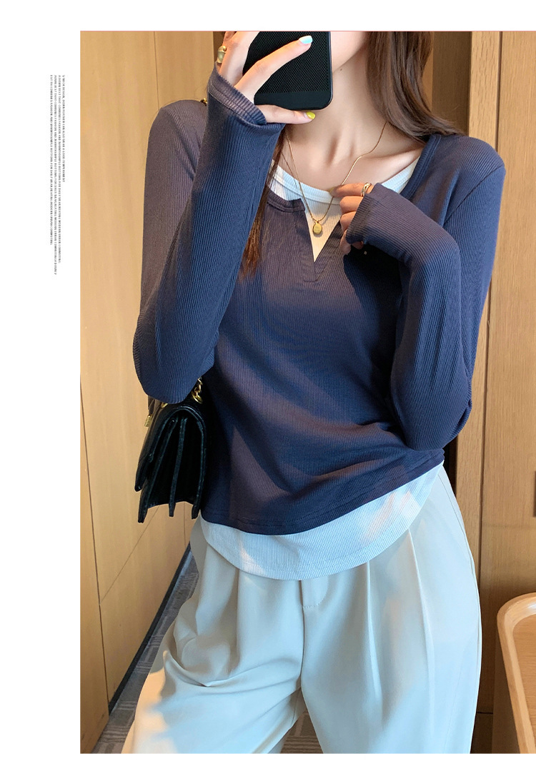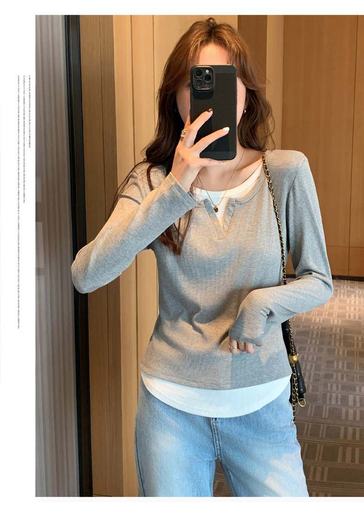 Женская футболка с длинными рукавами из двух частей, осенняя, стройнящая, шикарный и красивый топ, рубашка с круглым вырезом.