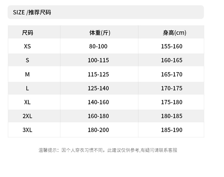 XS [рекомендуется 40-50kg ]; S【Рекомендация 50-57.5kg 】; М【Рекомендация 57.5-62.5kg 】; L【Рекомендация 62.5-70kg 】; XL [рекомендуется 70-80kg ]; 2XL [рекомендуется 80-90kg ]; 3XL [рекомендуется 90-100kg ]