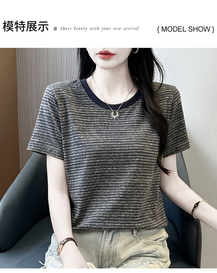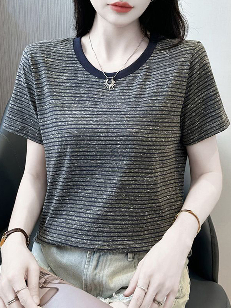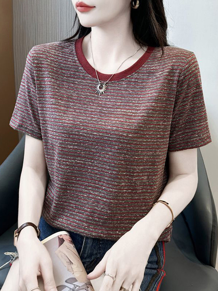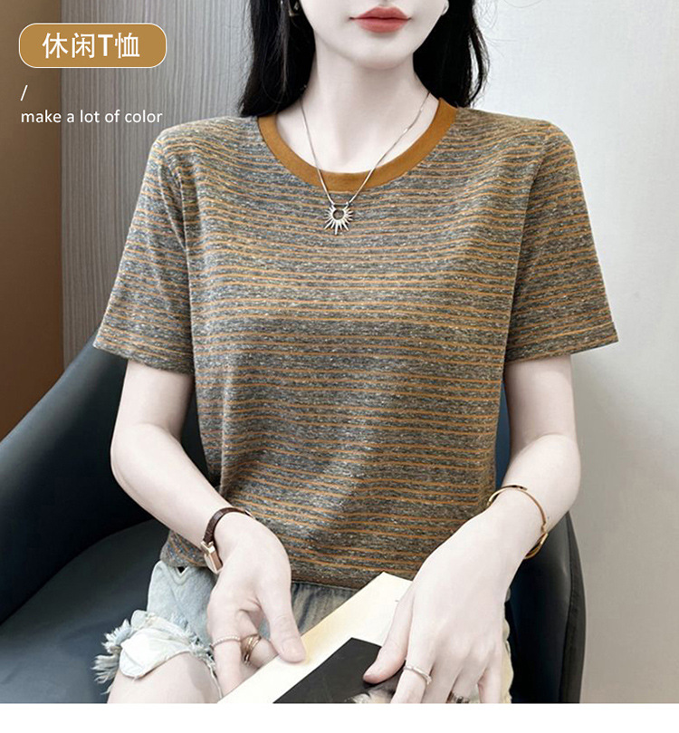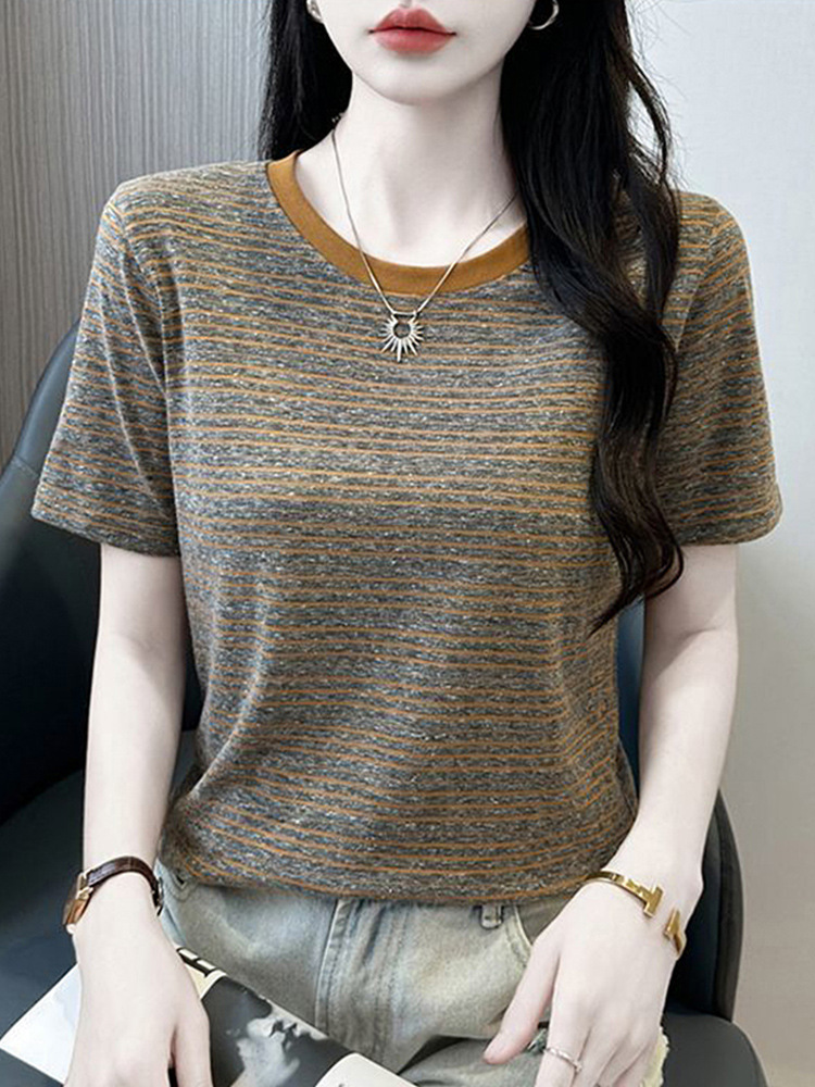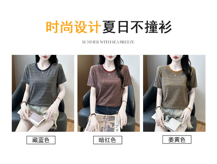 Женская полосатая футболка с короткими рукавами и круглым вырезом, новая летняя мода, цветовые блоки, для похудения, больших размеров, обычный топ с плечами, модный.