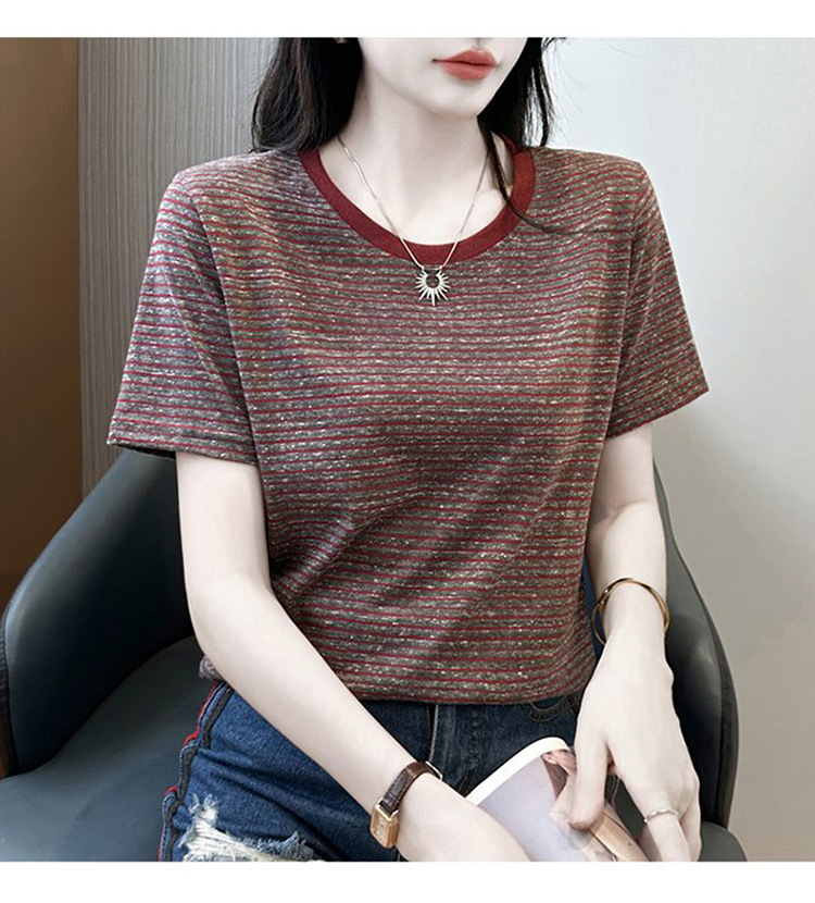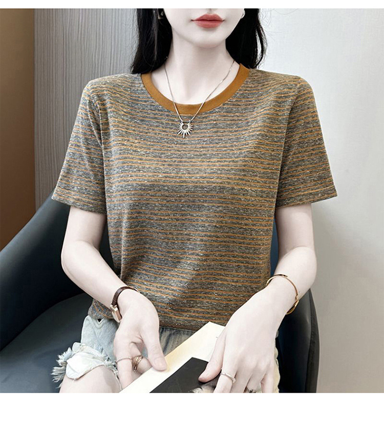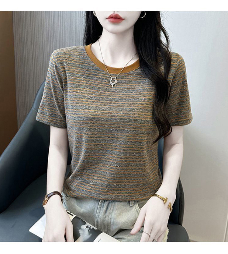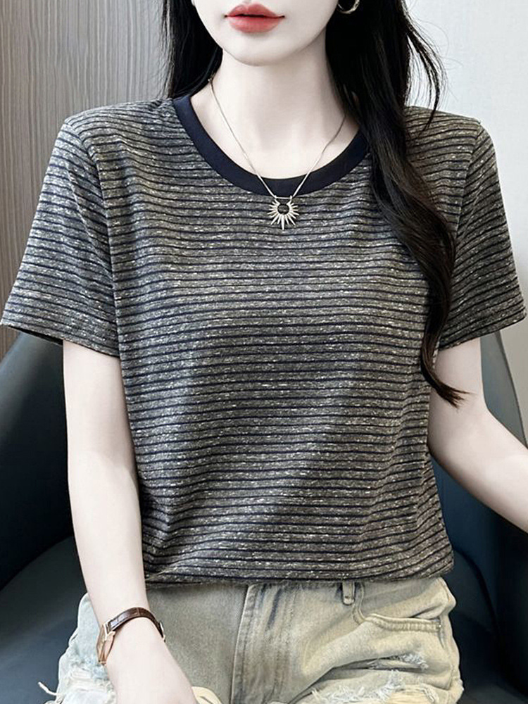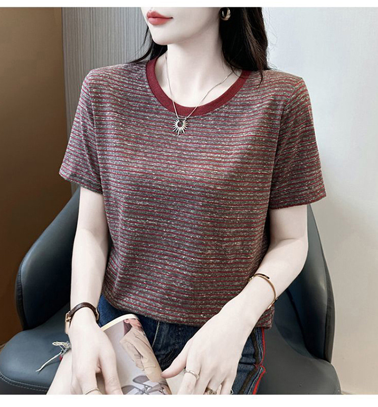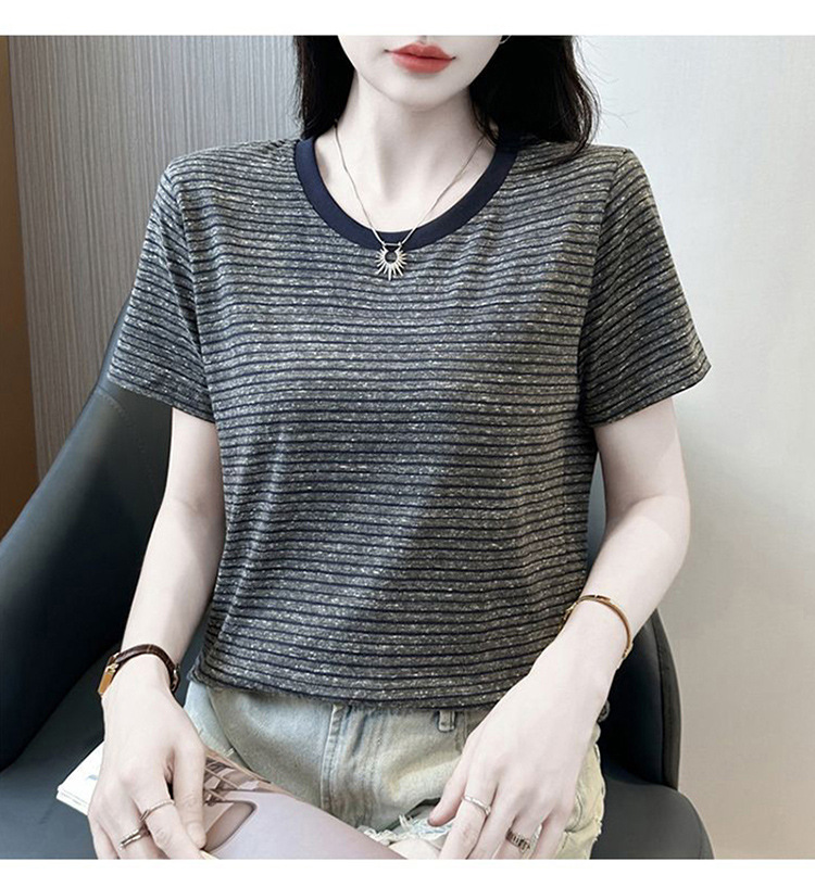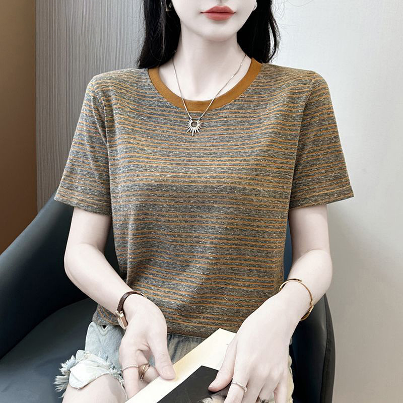 Женская полосатая футболка с короткими рукавами и круглым вырезом, новая летняя мода, цветовые блоки, для похудения, больших размеров, обычный топ с плечами, модный.