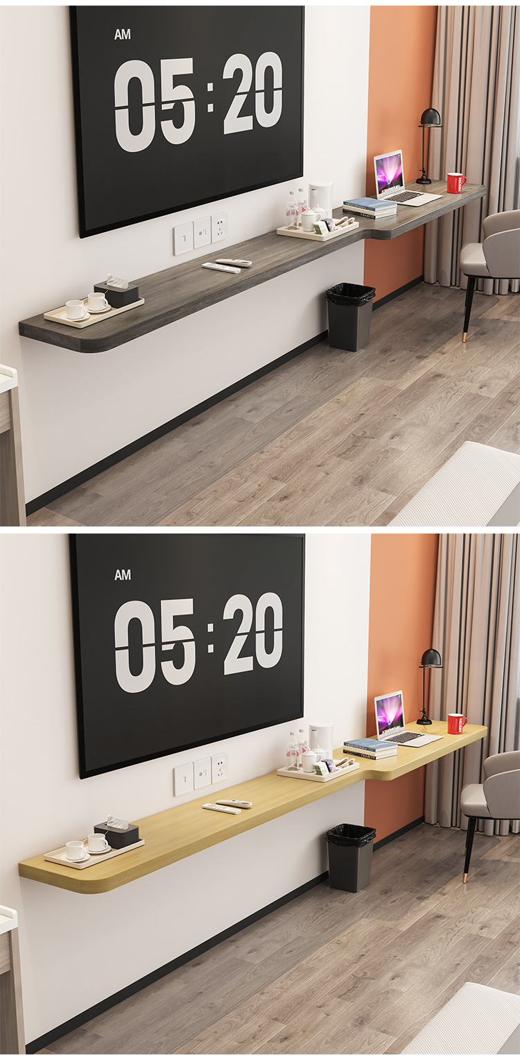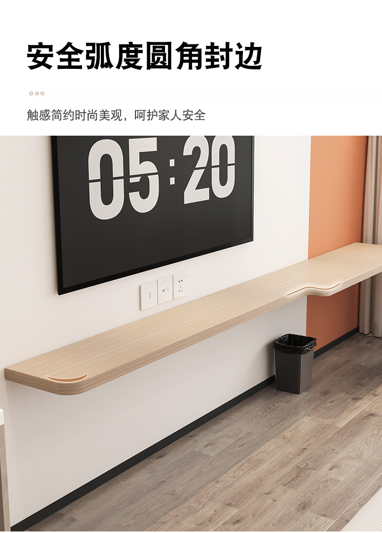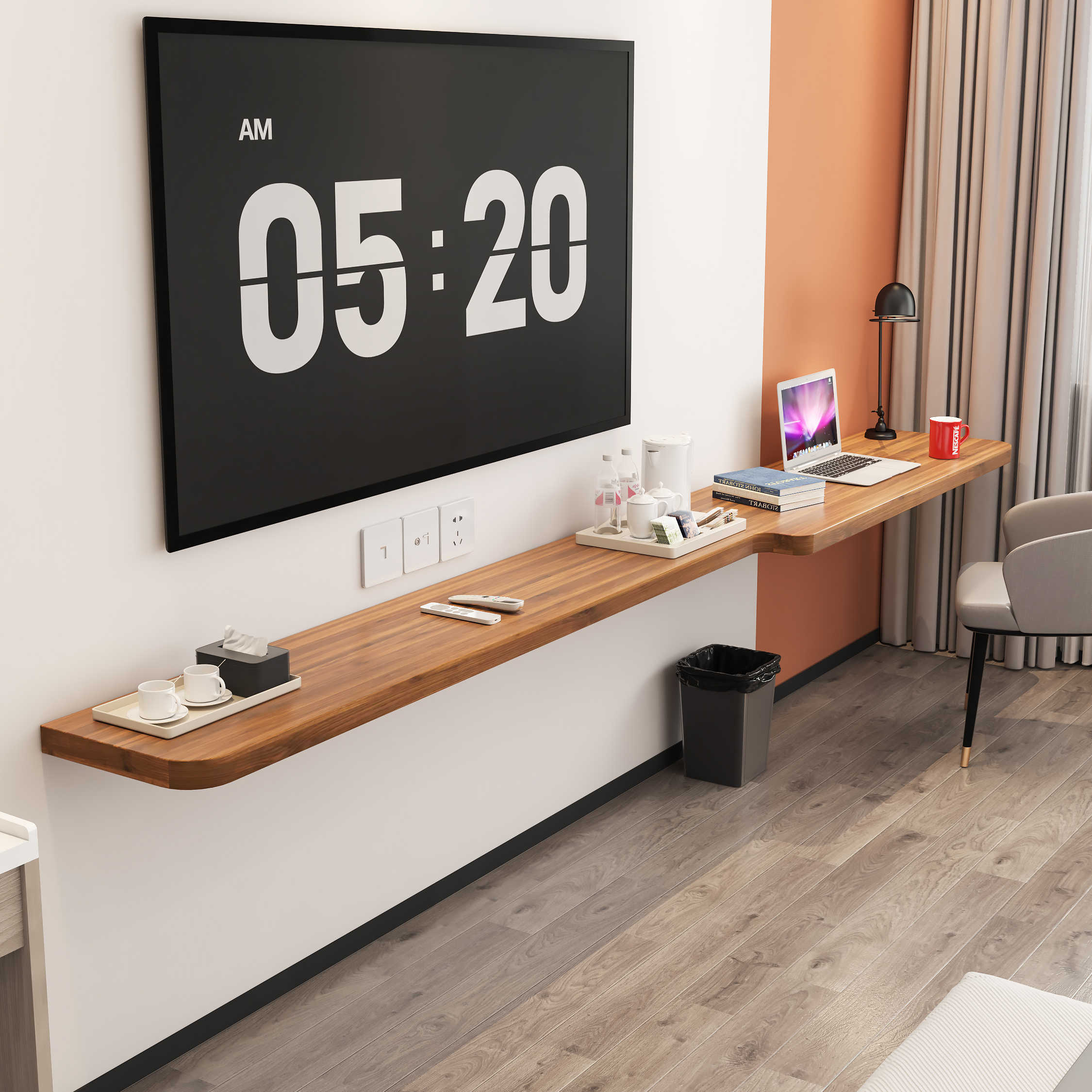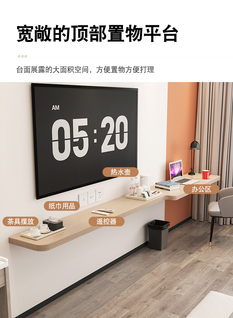 Мебель для гостиниц: комбинированный письменный стол с прямой столешницей и телевизором, перегородка для номера в гостинице/гостевом доме, подвесной телевизионный шкаф.