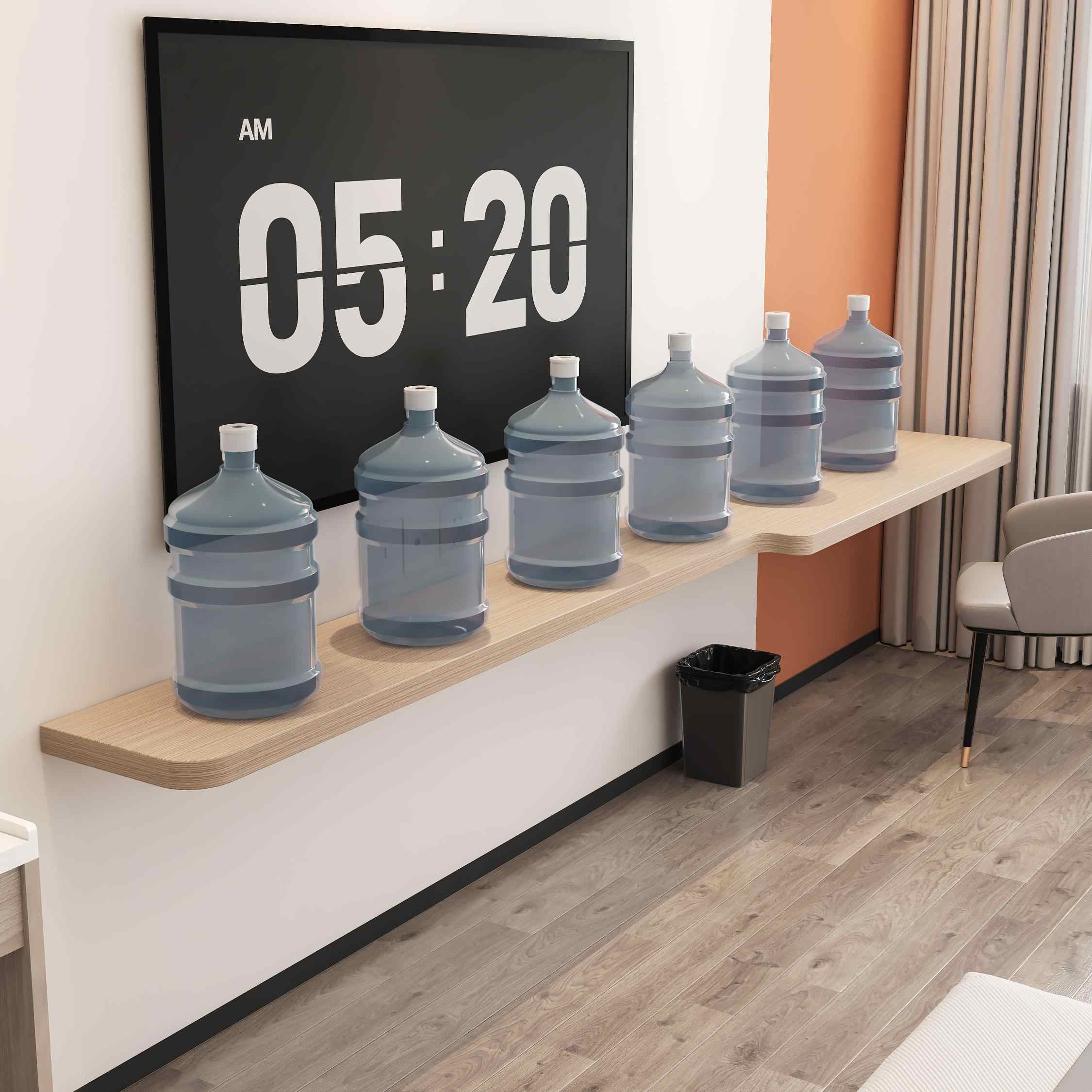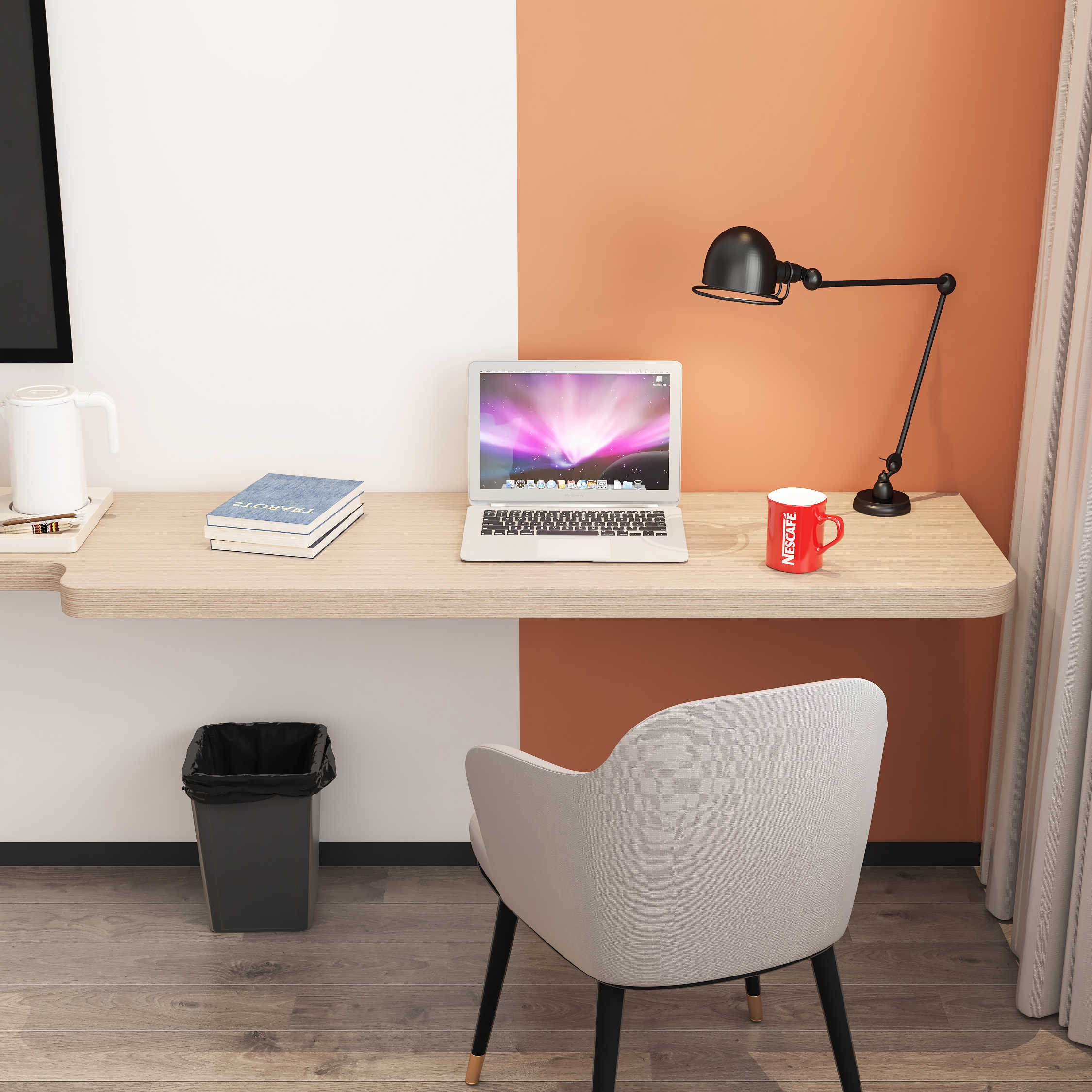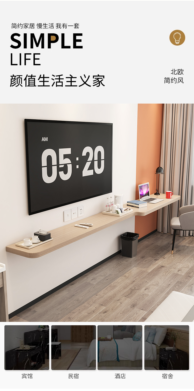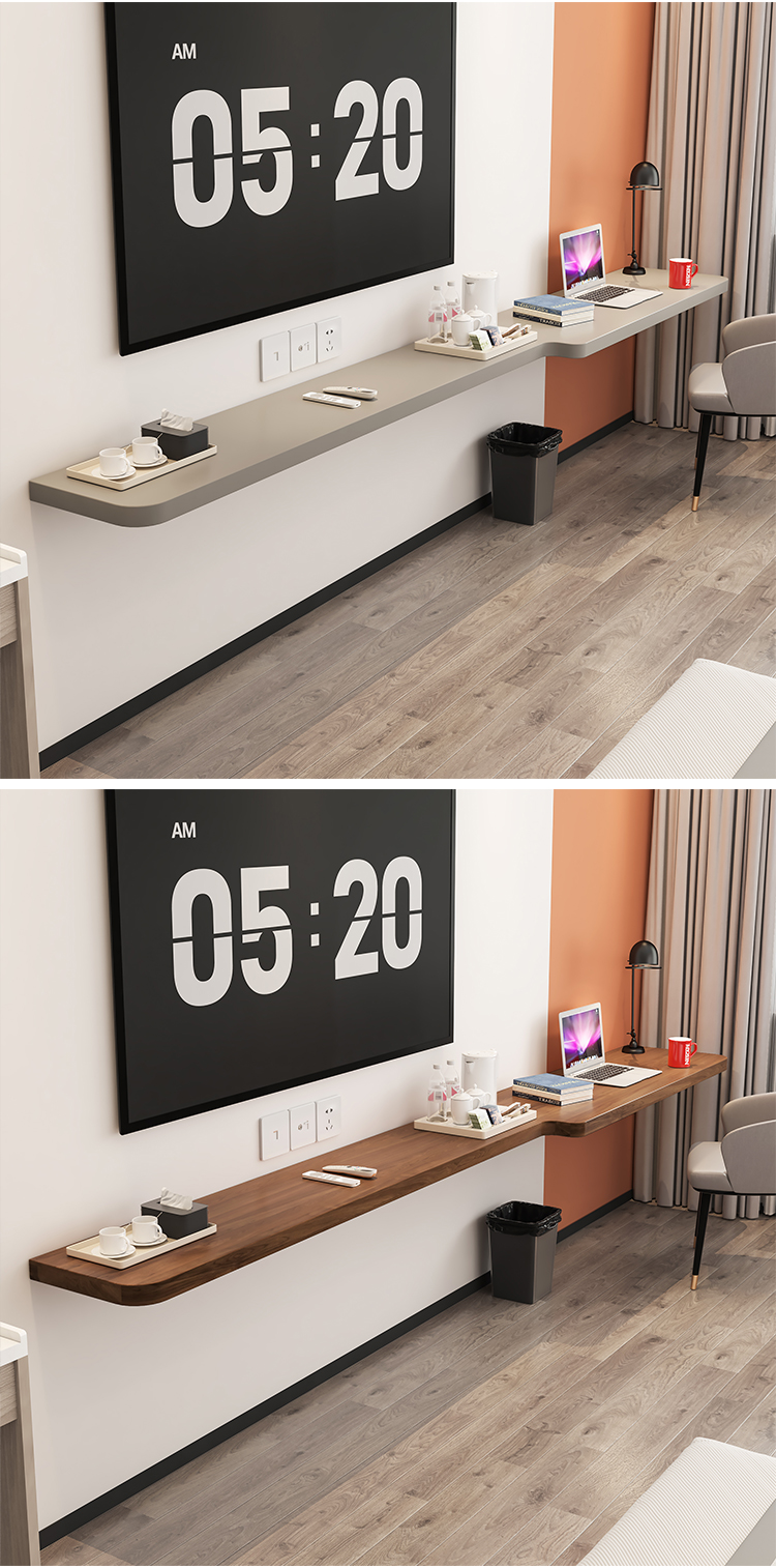 Мебель для гостиниц: комбинированный письменный стол с прямой столешницей и телевизором, перегородка для номера в гостинице/гостевом доме, подвесной телевизионный шкаф.