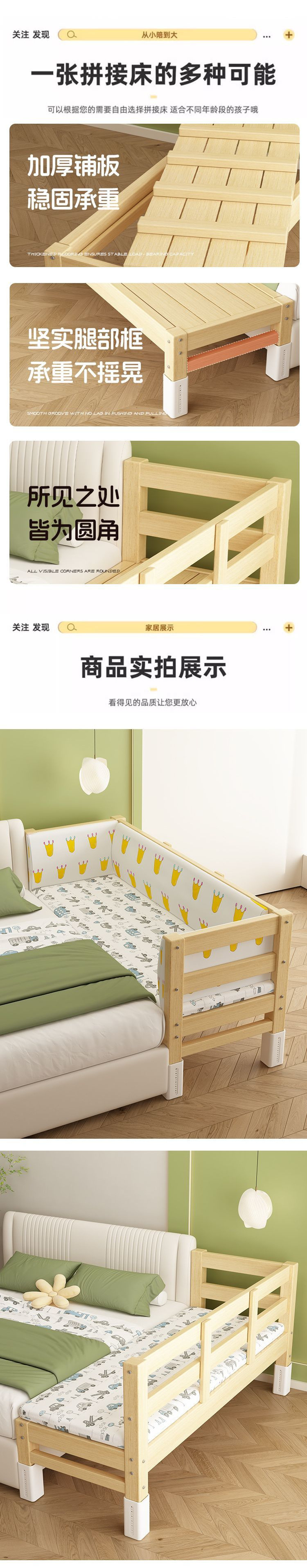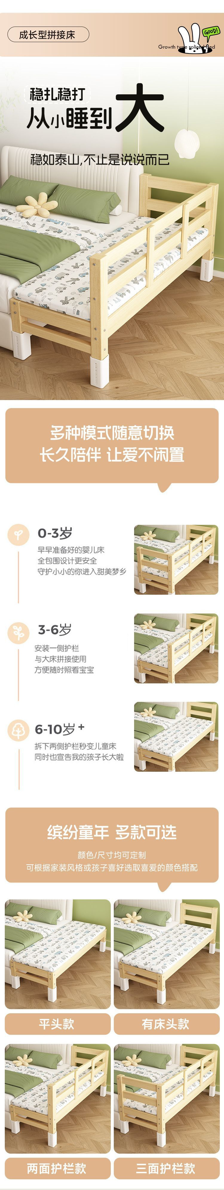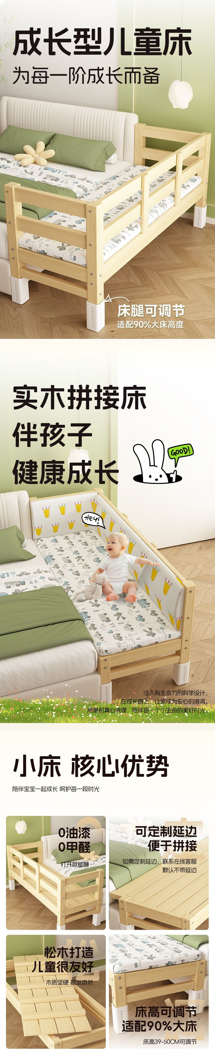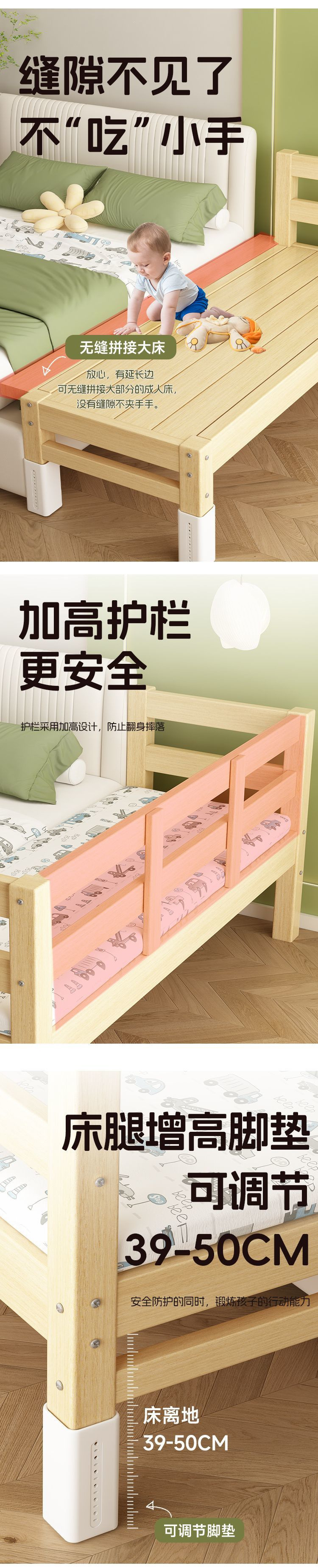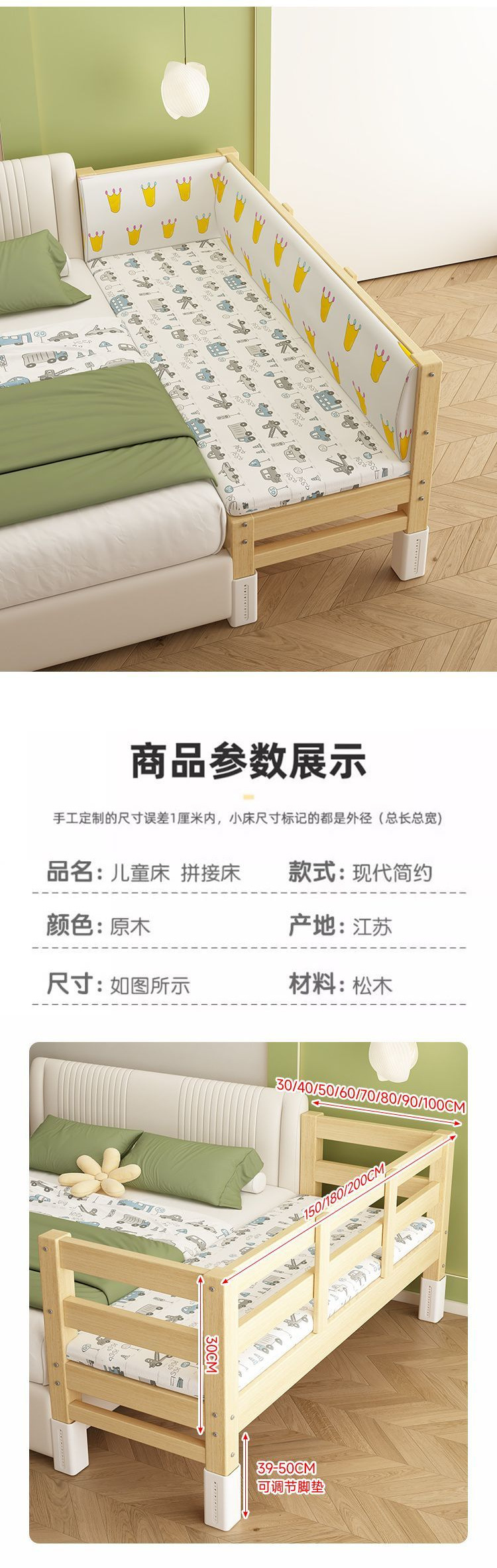 Детская кровать-сплит с расширенным прикроватным расширением, детская плоская кровать, регулируемая кроватка из массива дерева для сна взрослых.