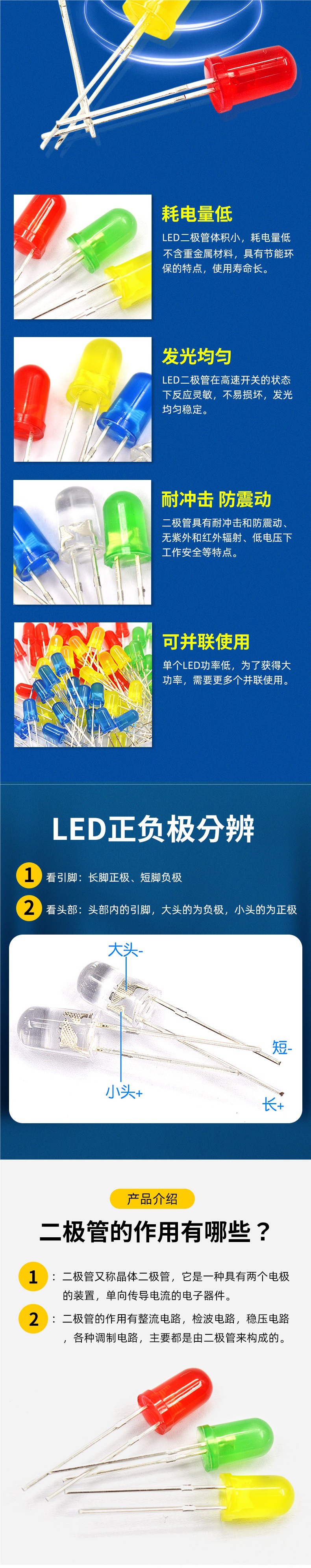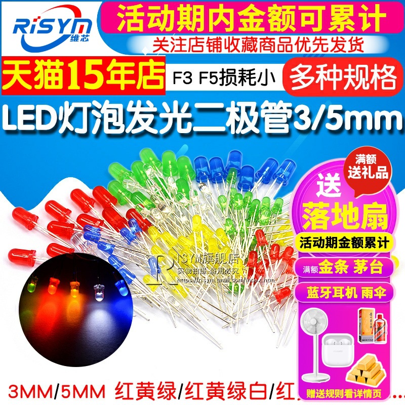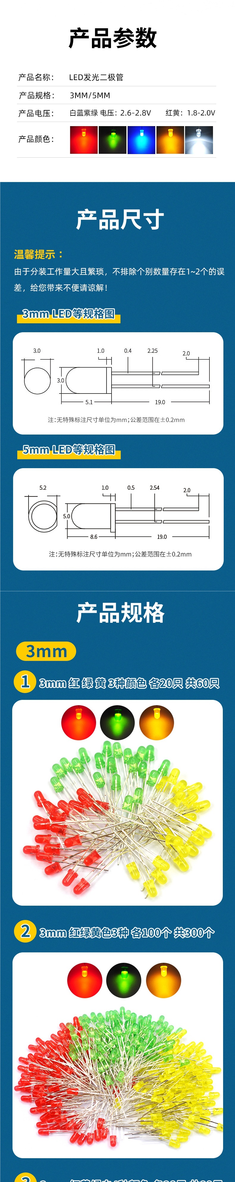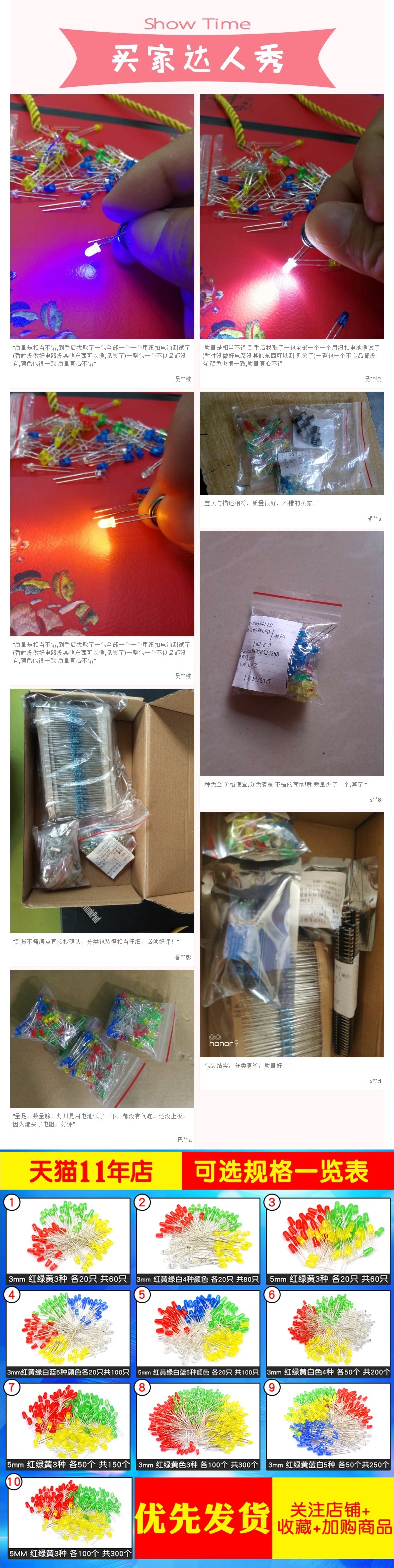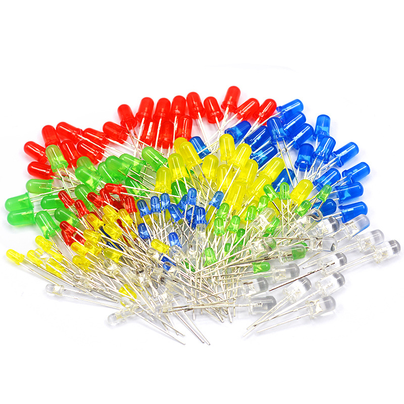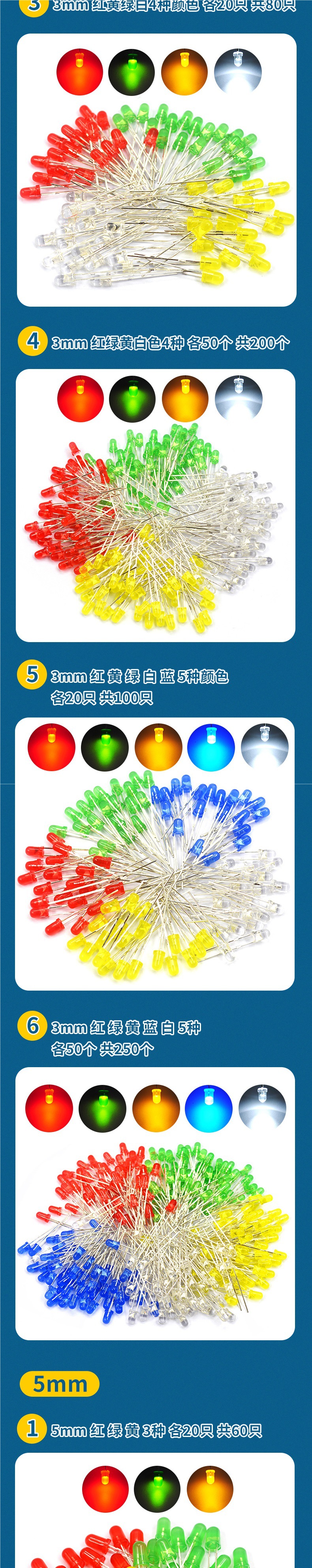 3 мм, 3 цвета: красный, зеленый и желтый, по 20 штук в каждом, всего 60 штук. 3 мм, 4 цвета: красный, желтый, зеленый и белый, по 20 штук в каждом, всего 80 штук. 5 мм, красный, зеленый и желтый.