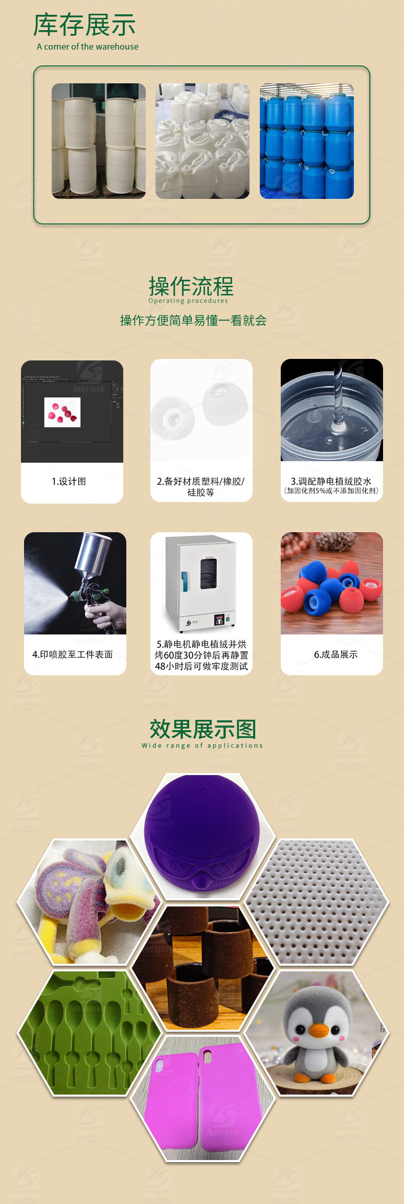 Резиновый электростатический флоковый клей зр–хдж900; Силиконовый электростатический флокирующий клей зр-Гдж900; ПП пластиковый электростатический флоковый клей ЗР–ПП900; Электростатический флокирующий клей на основе АБС-пластика ЗР–АБС900; Статический флокирующий клей ZR-TY900
