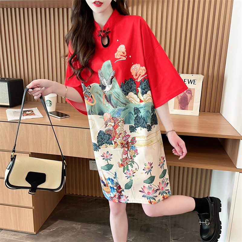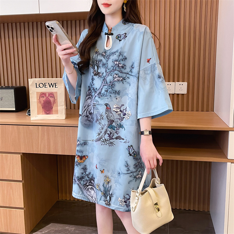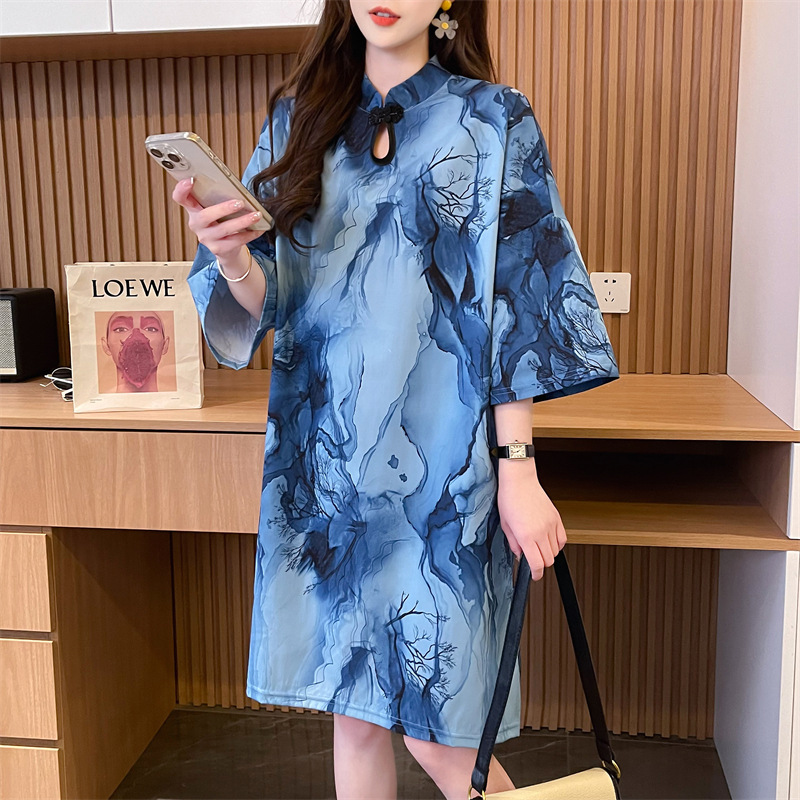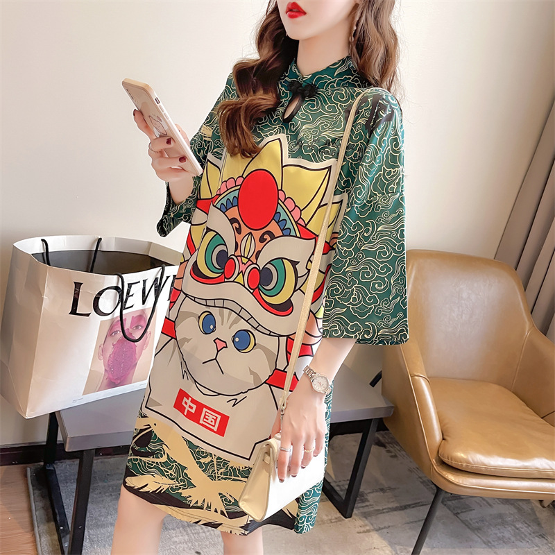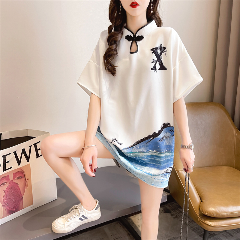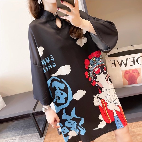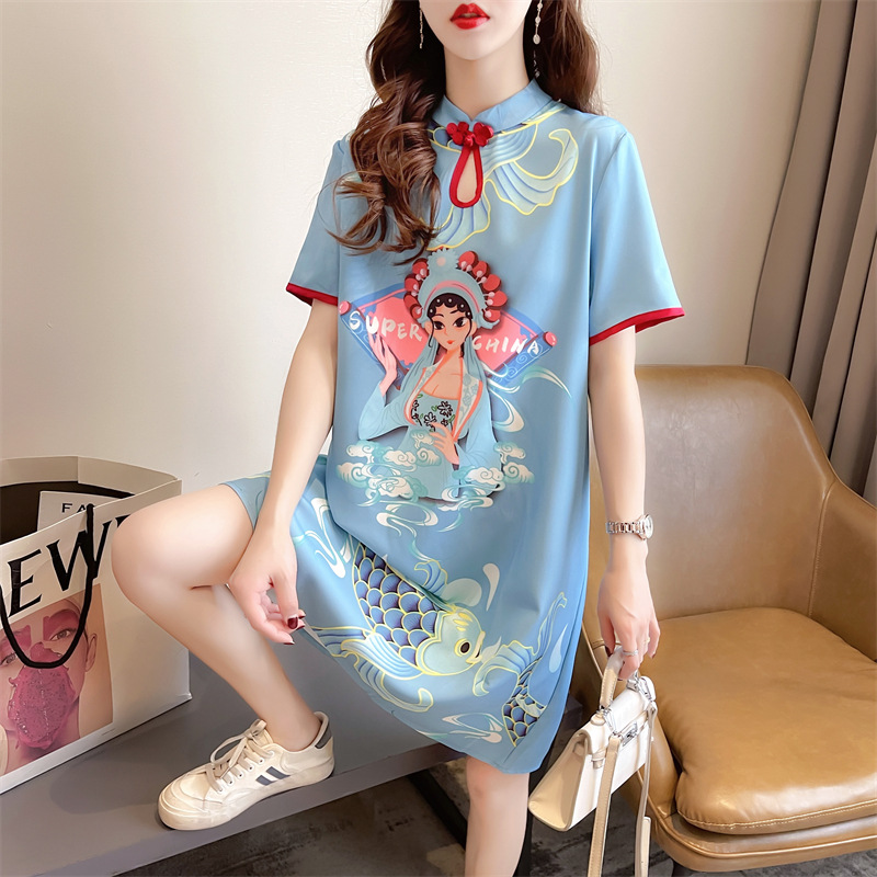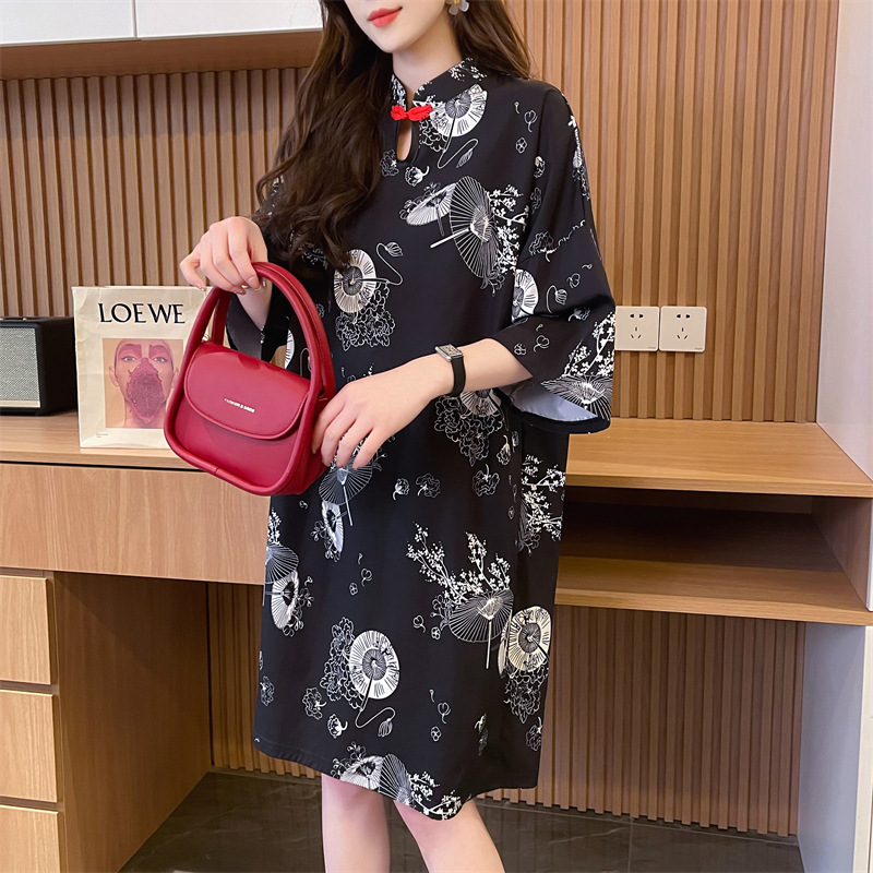 Черное платье-чонсам 2025 летний национальный тренд с принтом молодежное улучшенное для девушек китайский стиль уличное короткое контрастное платье