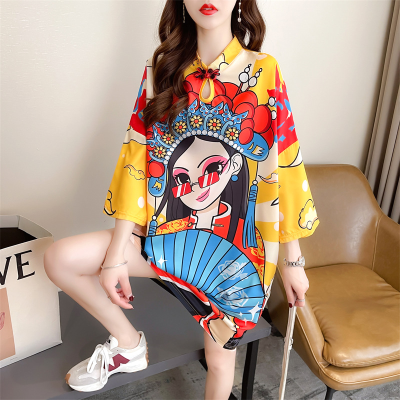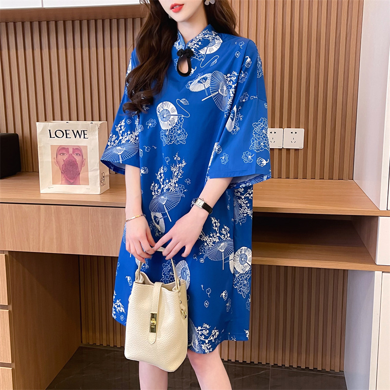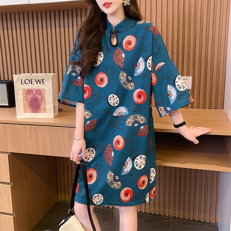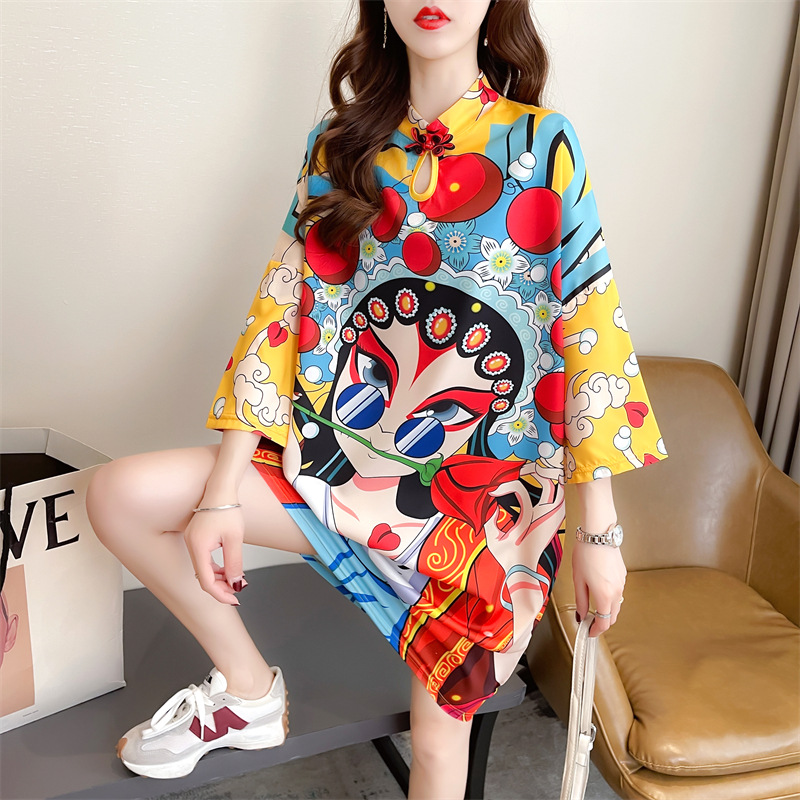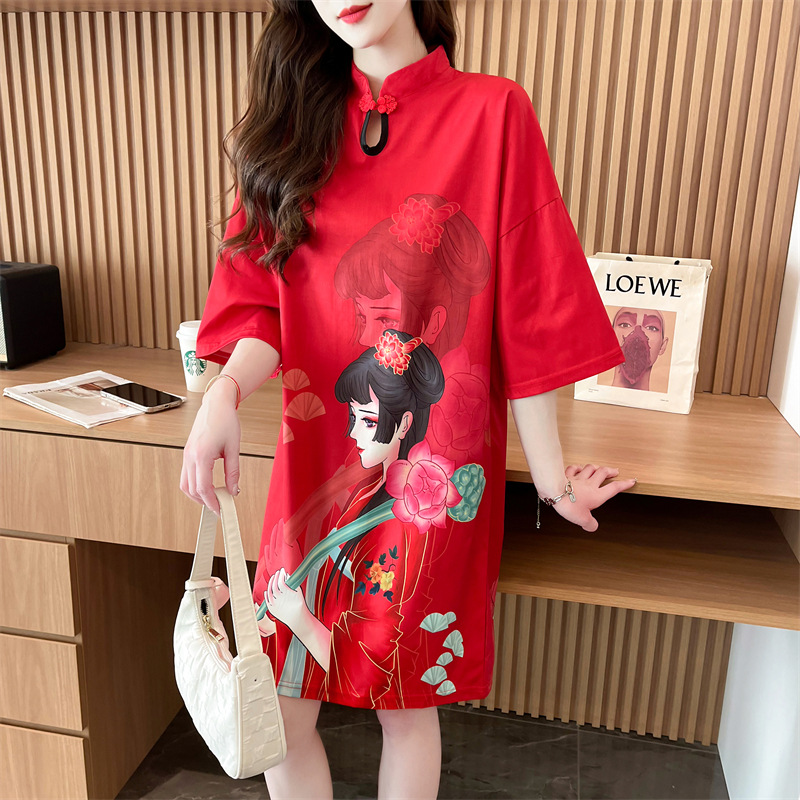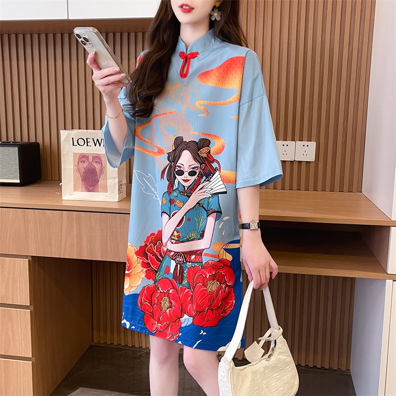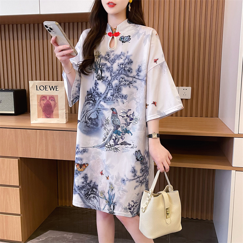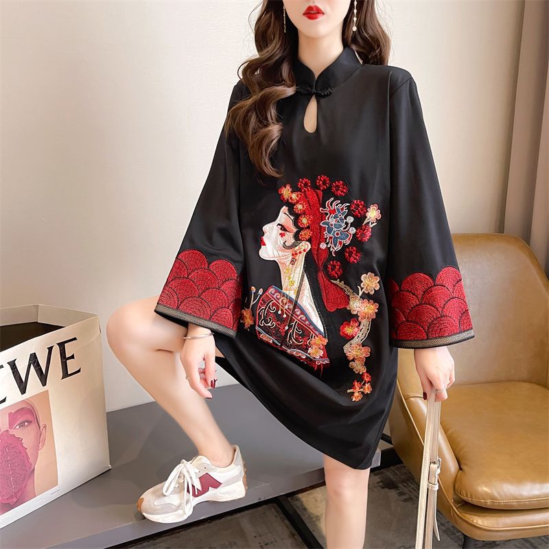 Черное платье-чонсам 2025 летний национальный тренд с принтом молодежное улучшенное для девушек китайский стиль уличное короткое контрастное платье