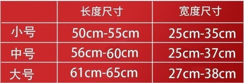 Маленький размер (доступна плоская длина 49-55 см); Средний размер (доступен в плоском виде длиной 55–60 см); Большой размер (доступен в плоском виде длиной 60–65 см)
