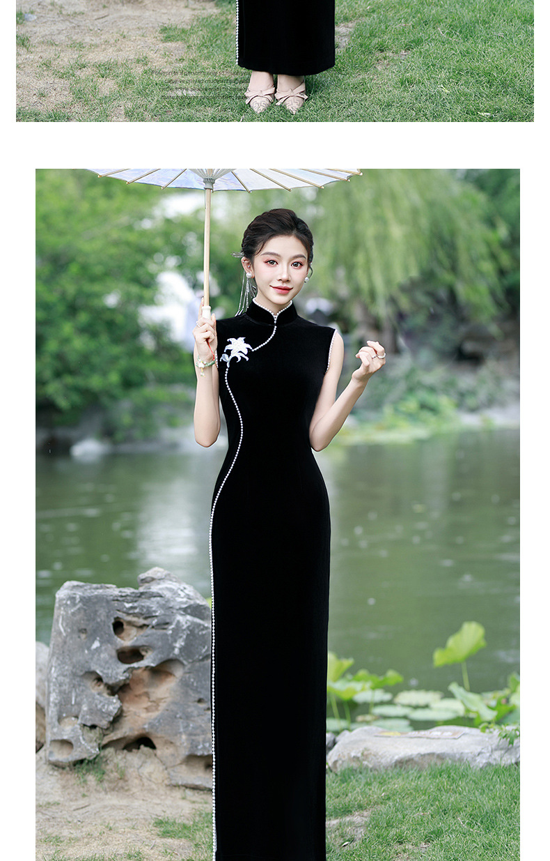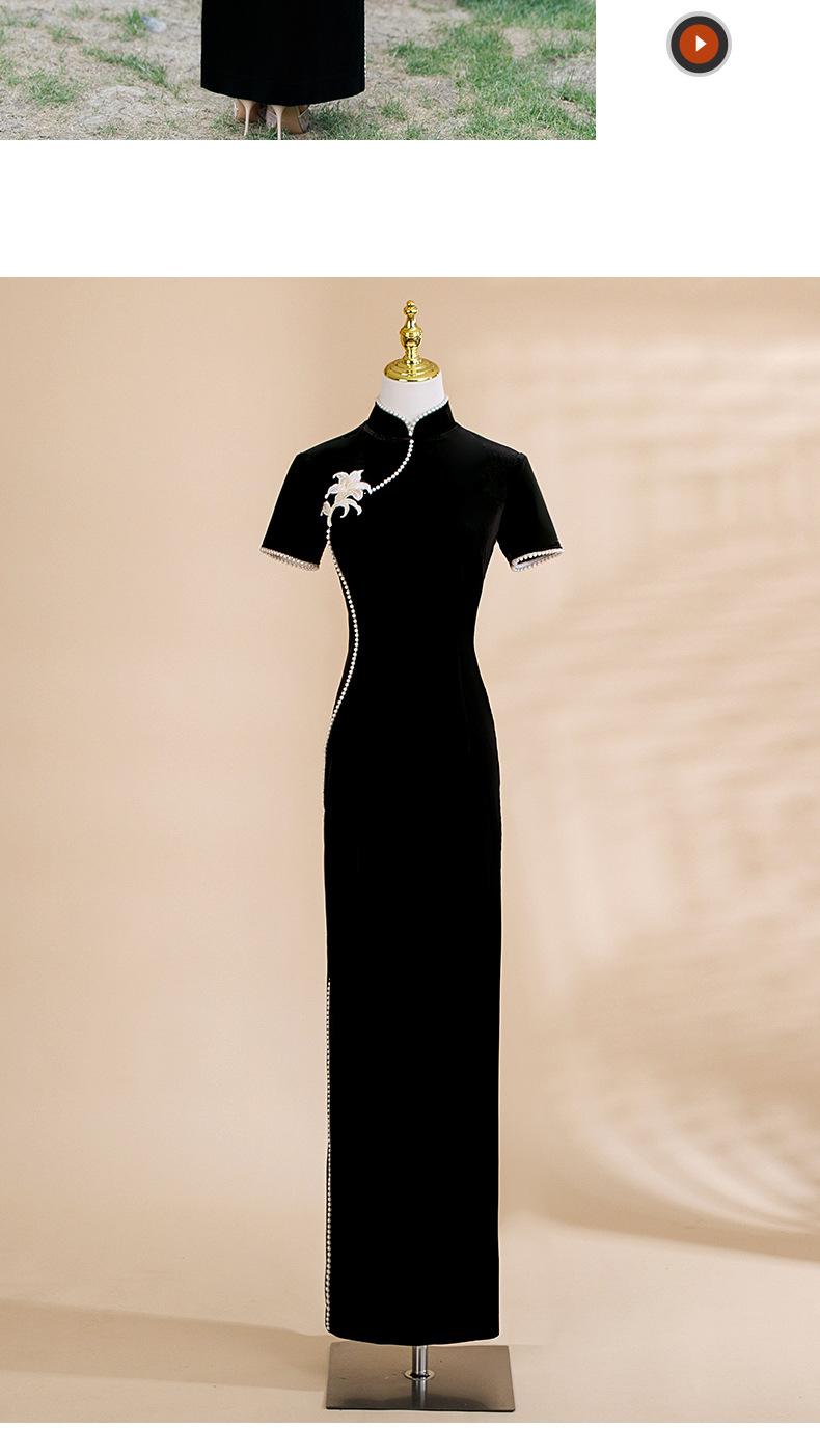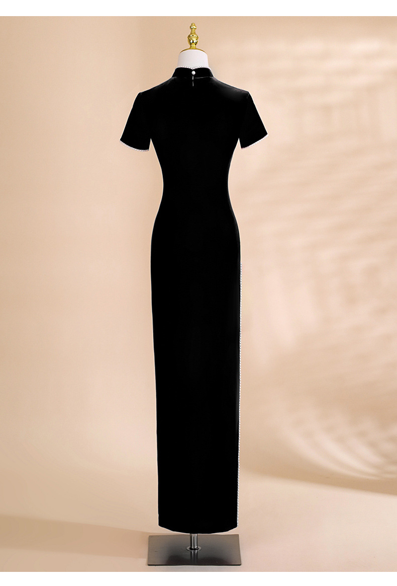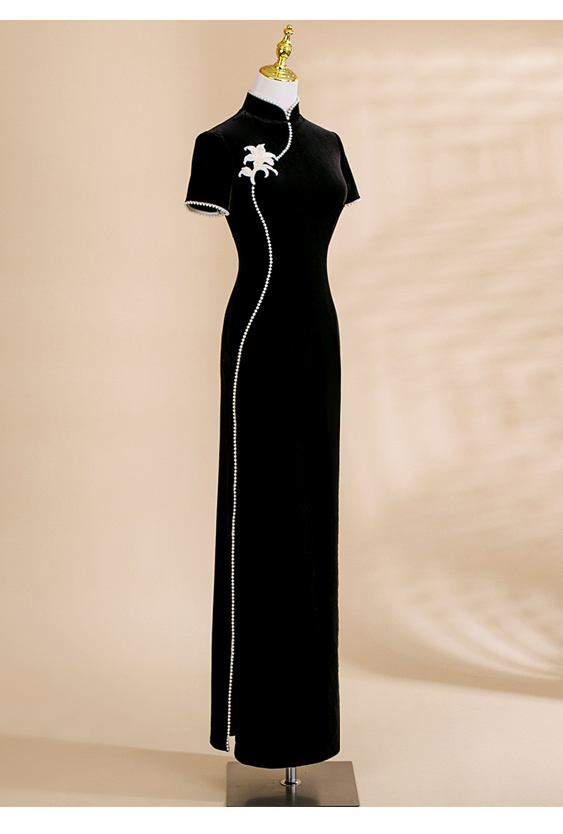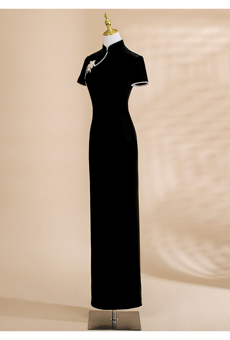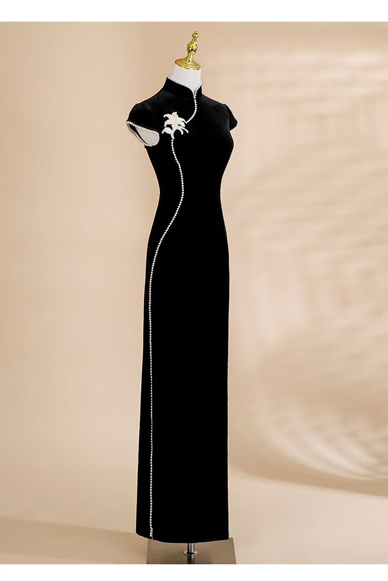 Подиумный Cheongsam 2025 Новый Slim Fit Этикет Жемчужный Бархат Черный Cheongsam Ретро Slim Fit Performance Cheongsam.