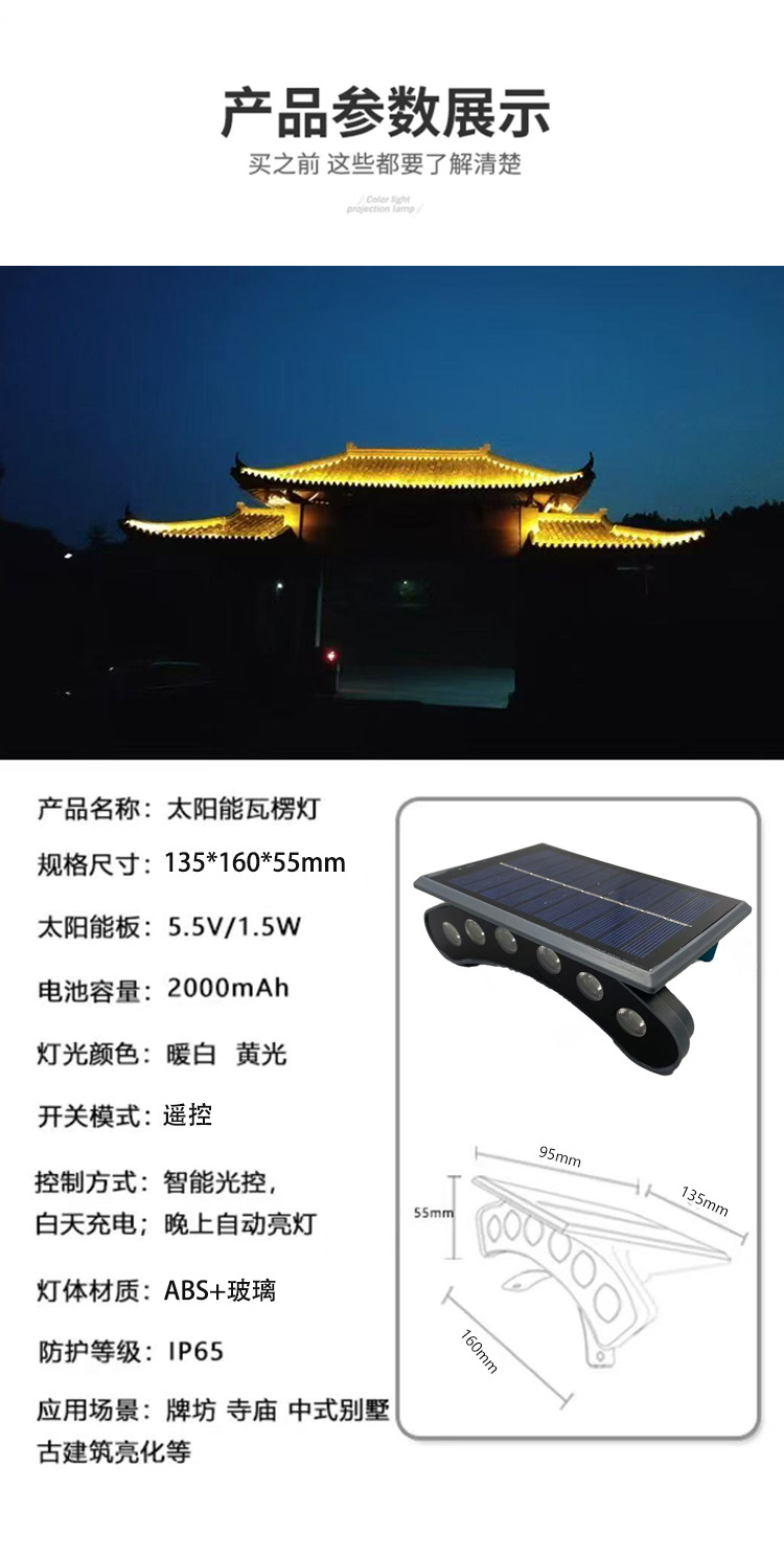 Уличный водонепроницаемый светодиодный 6-ваттный солнечный светильник для гофрированных черепичных крыш храмов, павильонов, старинных зданий и арок.