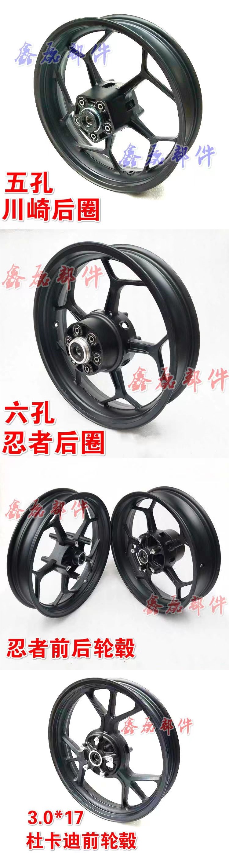 Шины 110/70-17; Шины 140/70-17; Передний круг ниндзя; Ниндзя назад круг пять отверстий; Ниндзя назад круг шесть отверстий; Передний круг Ducati; Заднее кольцо Ducati с шестью отверстиями