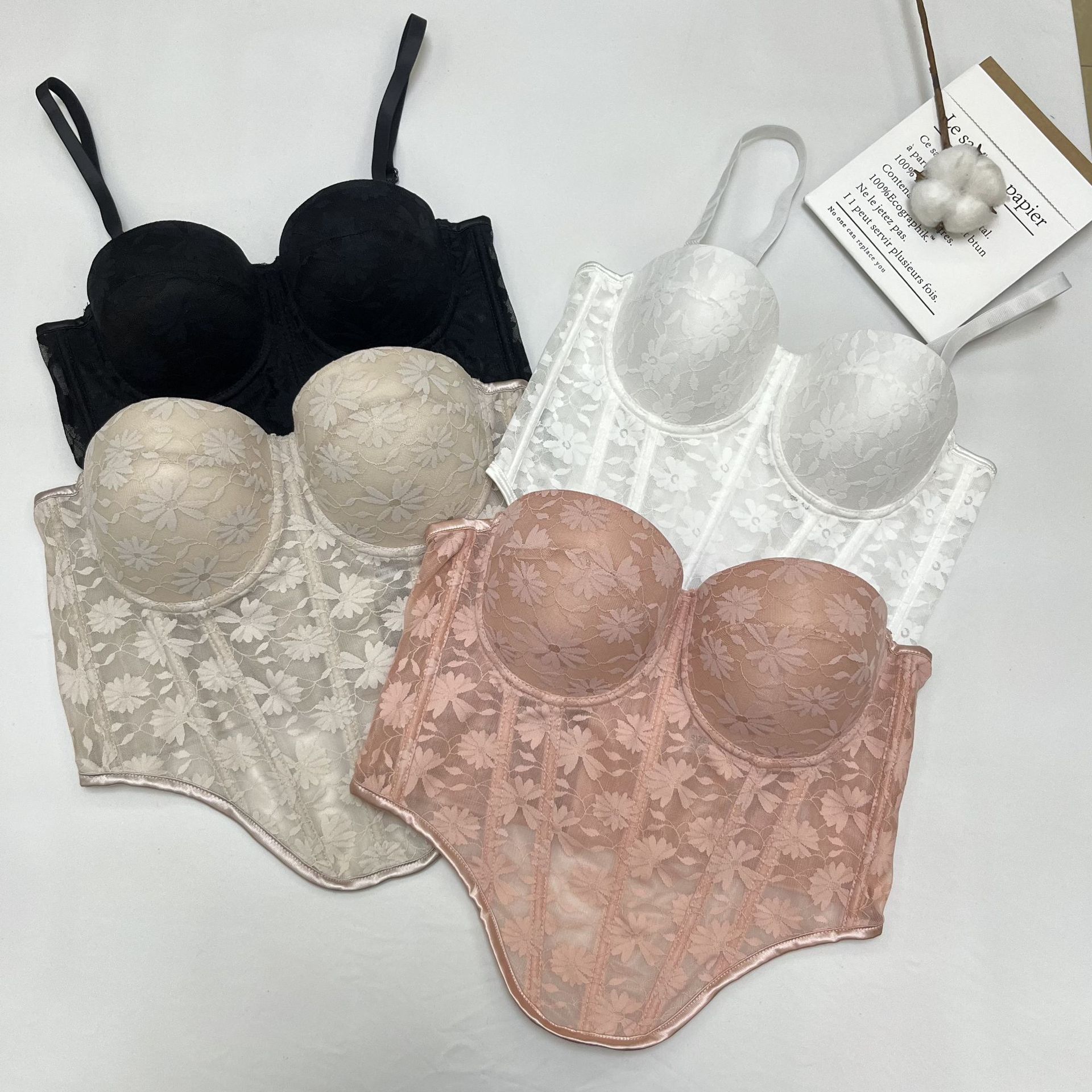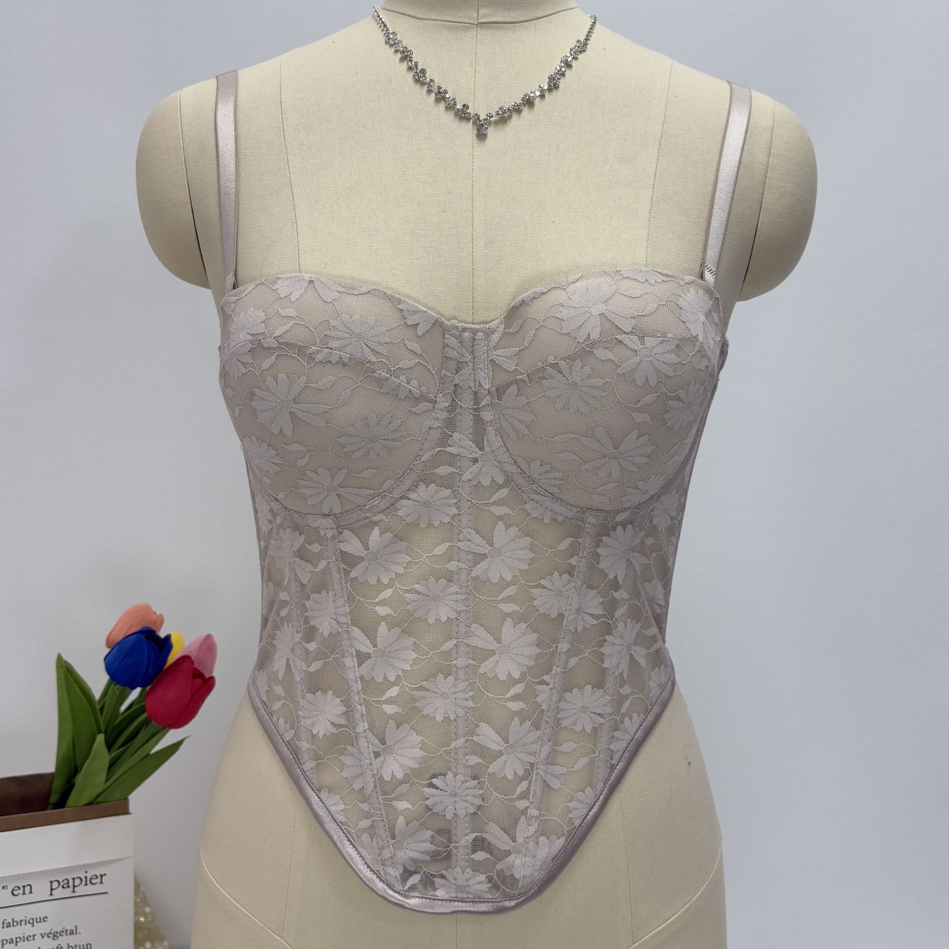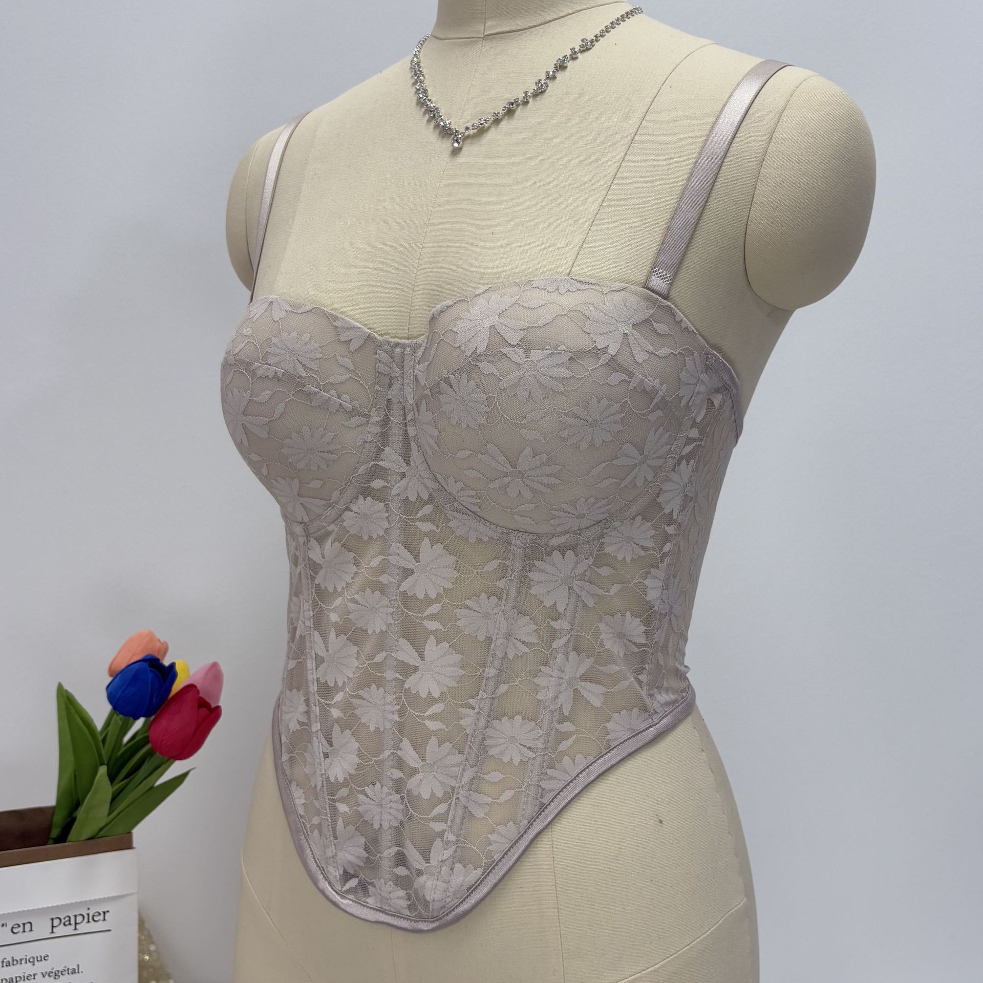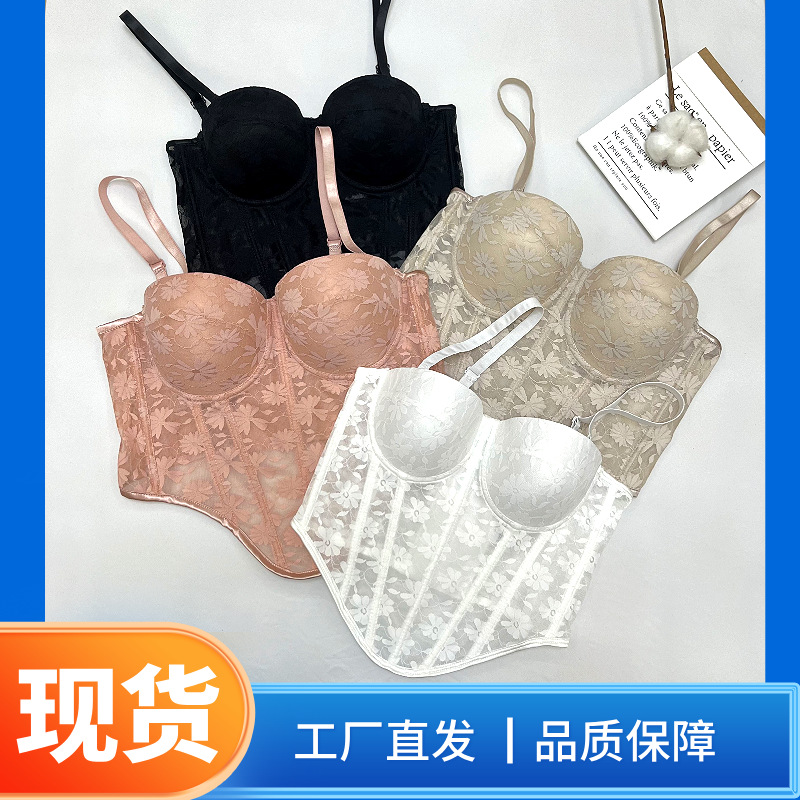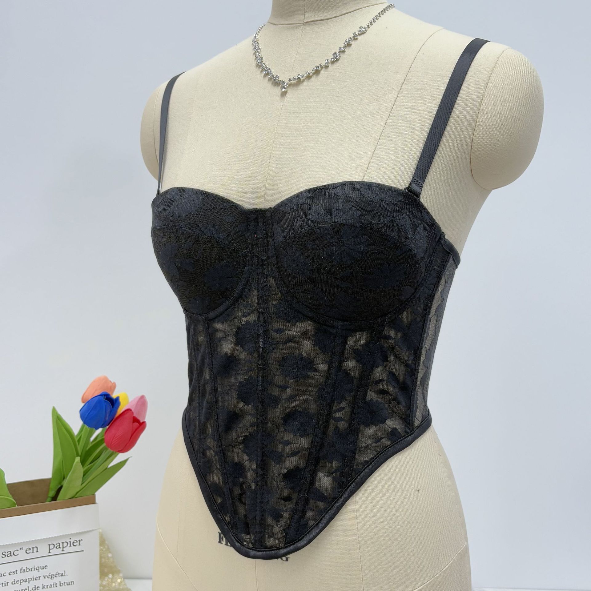批发定制网纱透视鱼骨胸衣提花蕾丝女背心外贸性感吊带马甲式文胸
