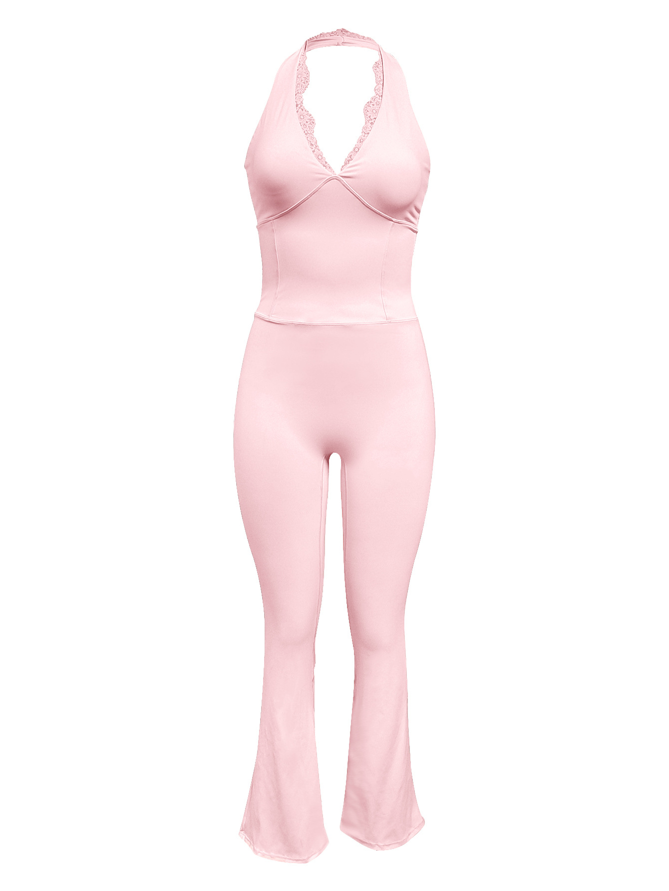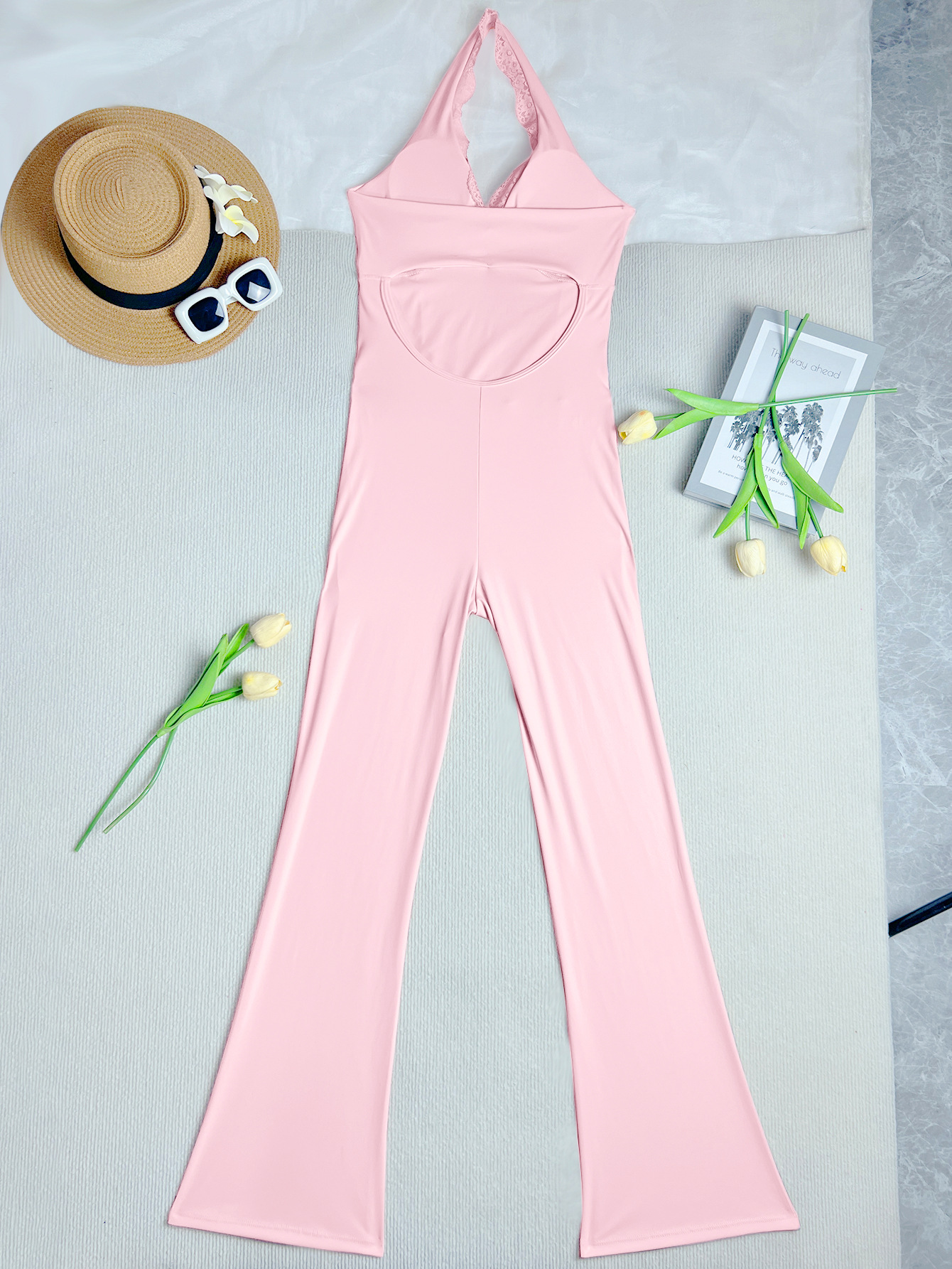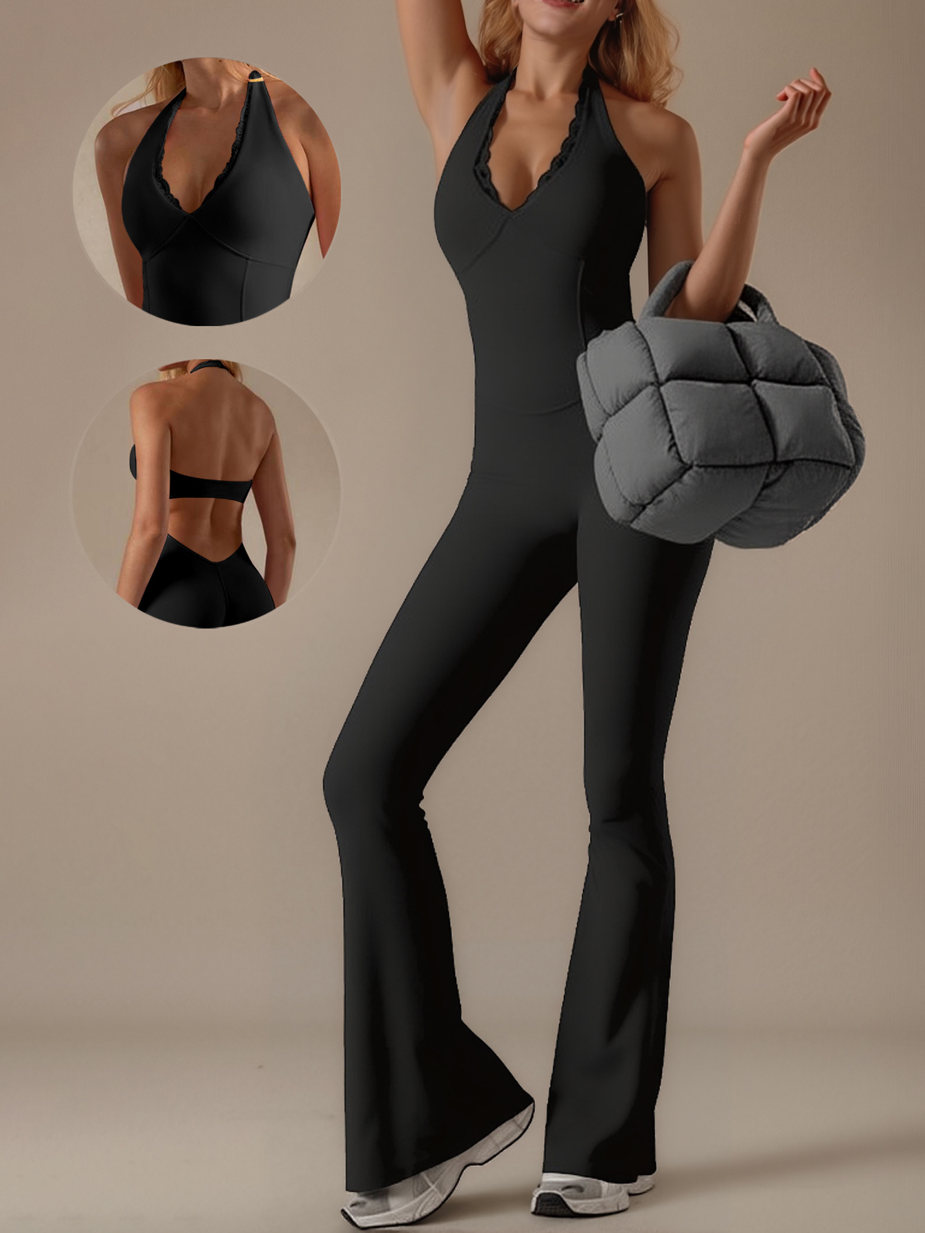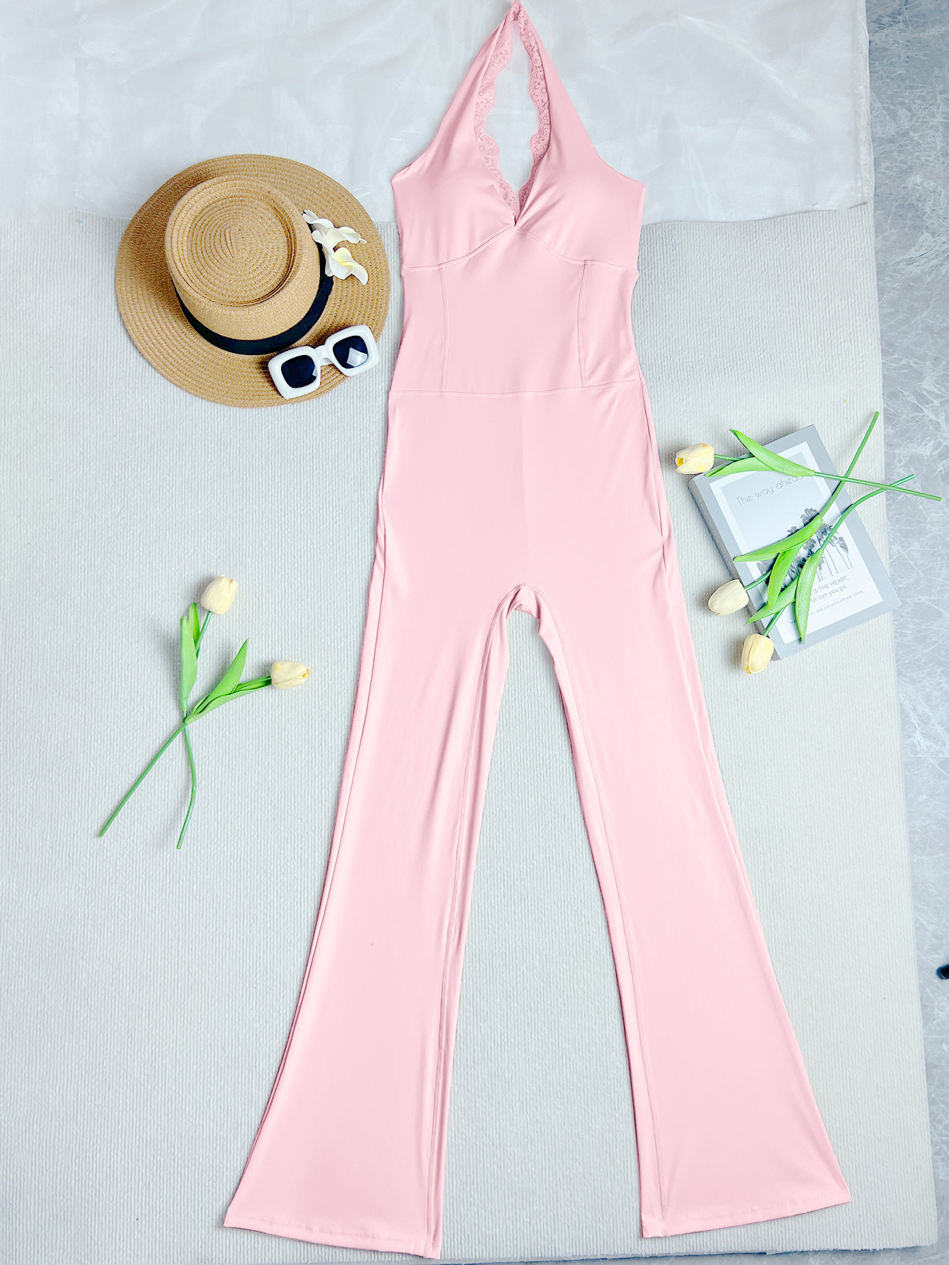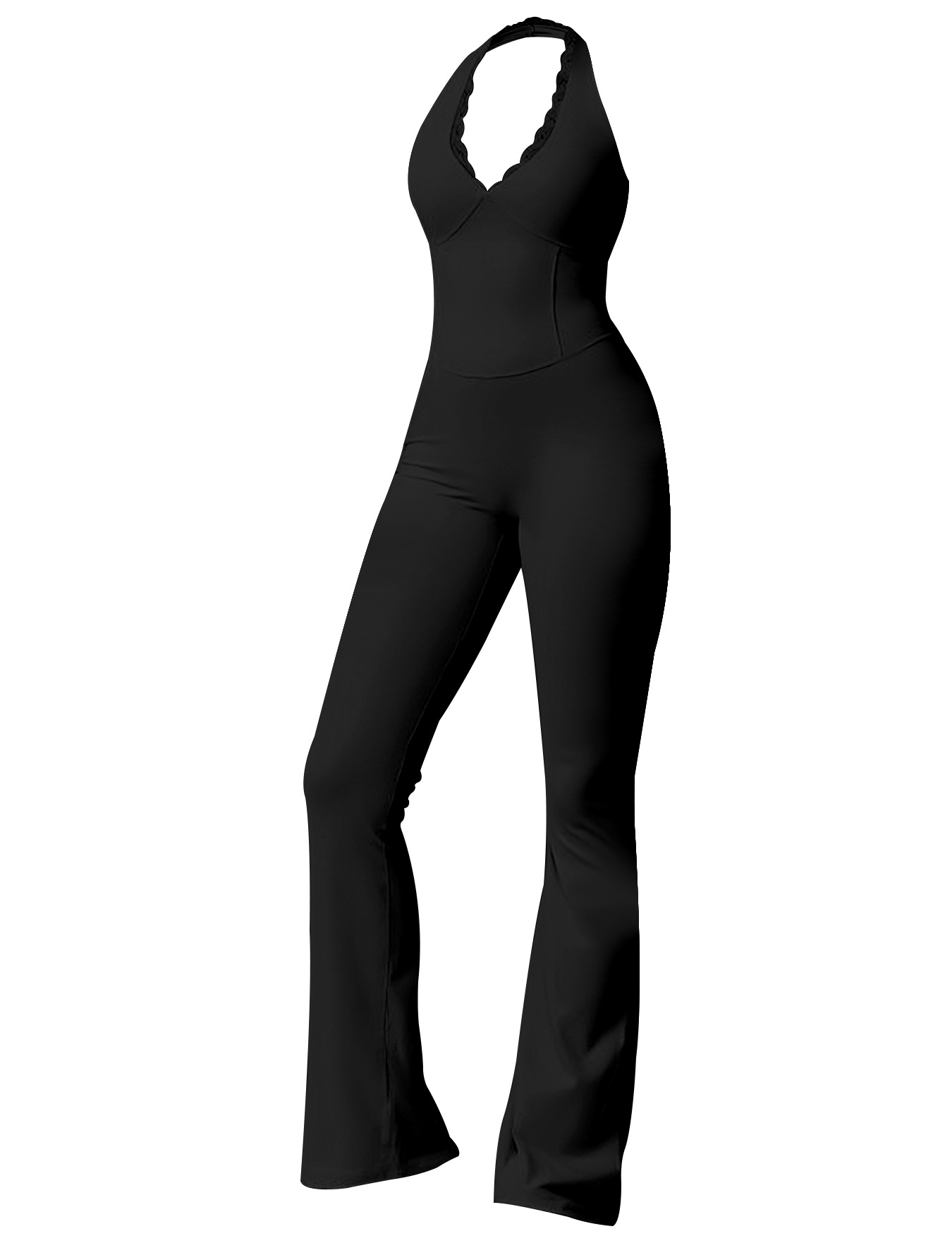 2025 новые трансграничные европейские и американские популярные однотонные кружевные брюки с v-образным вырезом и лямкой для йоги, спортивные цельные брюки-клеш, обтягивающие