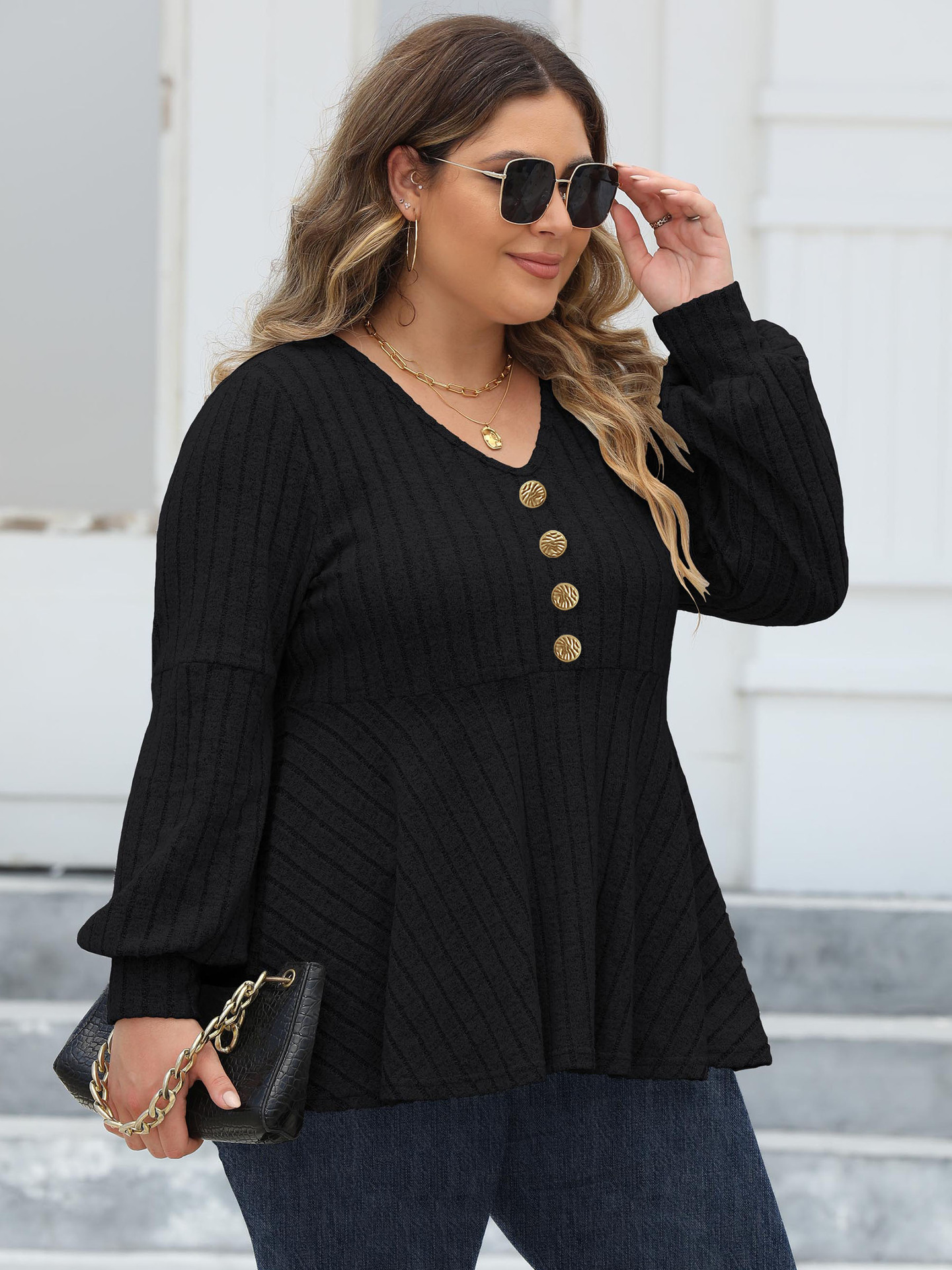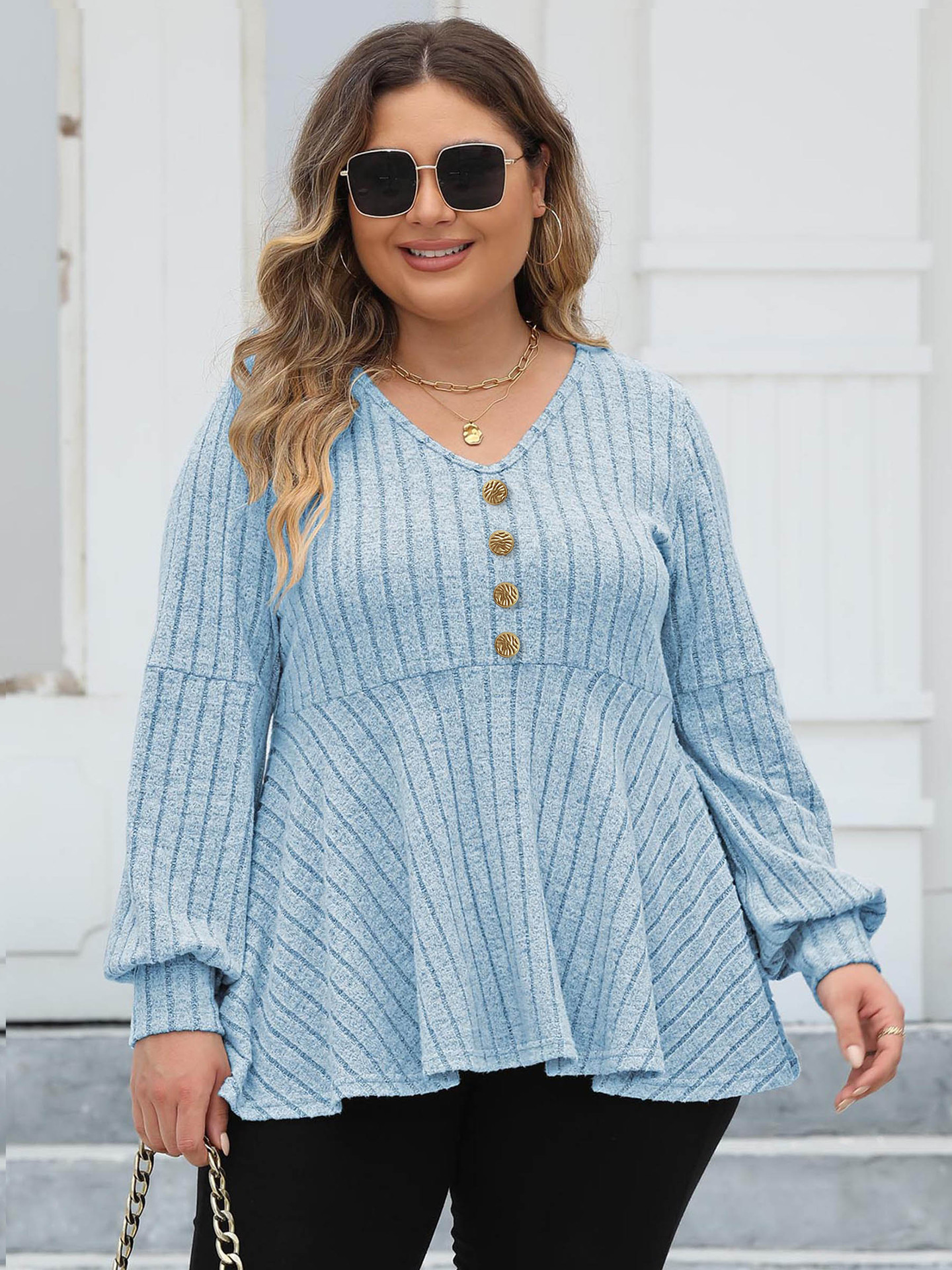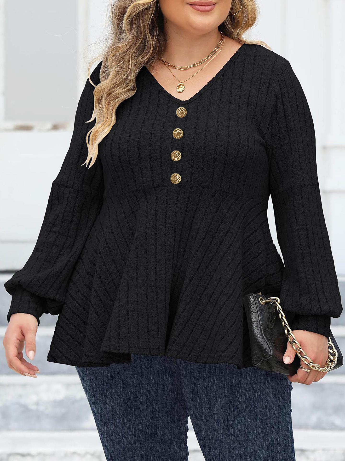 Женские топы больших размеров, женская рубашка-бебидолл с v-образным вырезом, флисовая футболка с рукавами-фонариками, декоративный топ с золотыми пуговицами