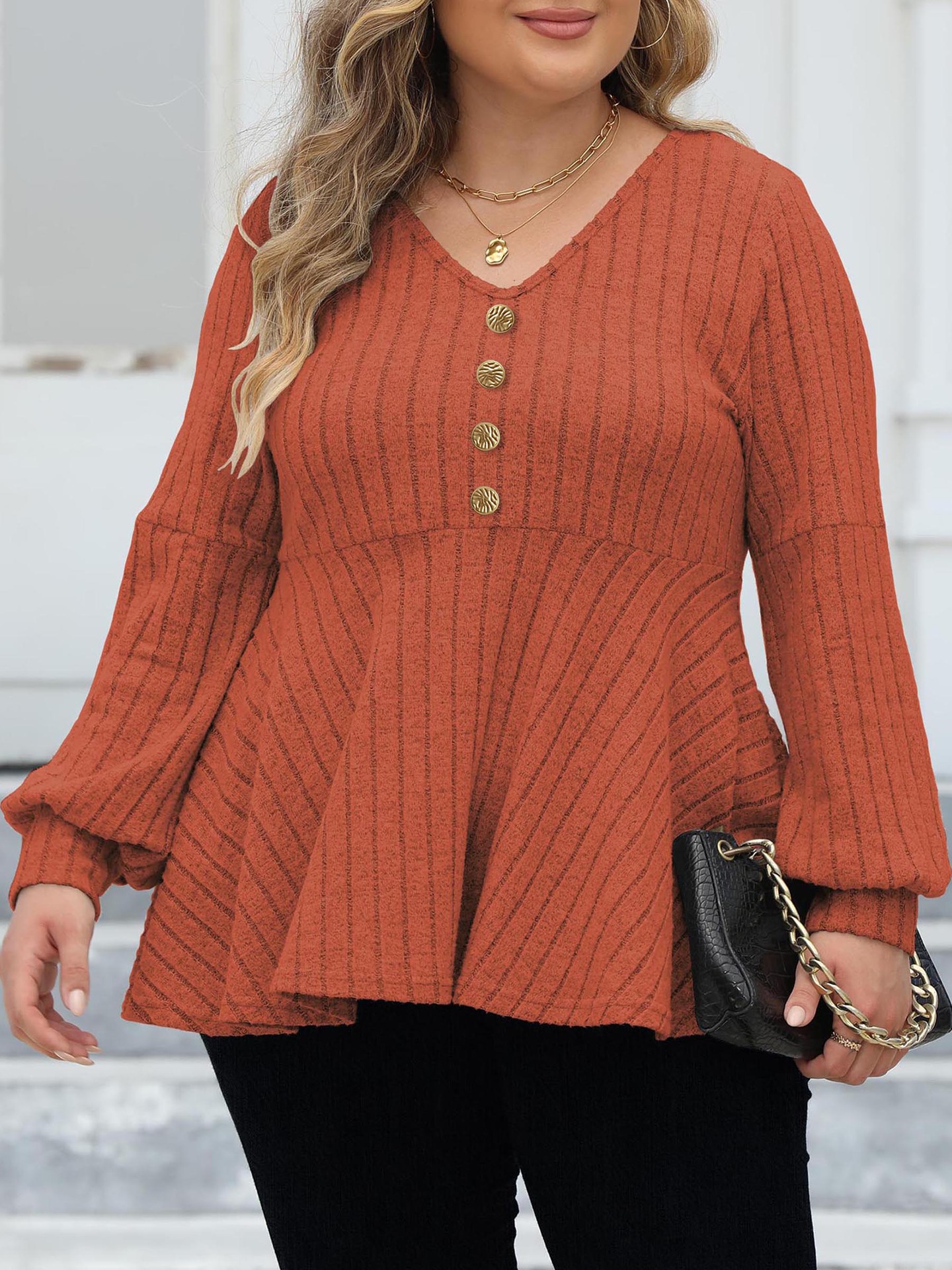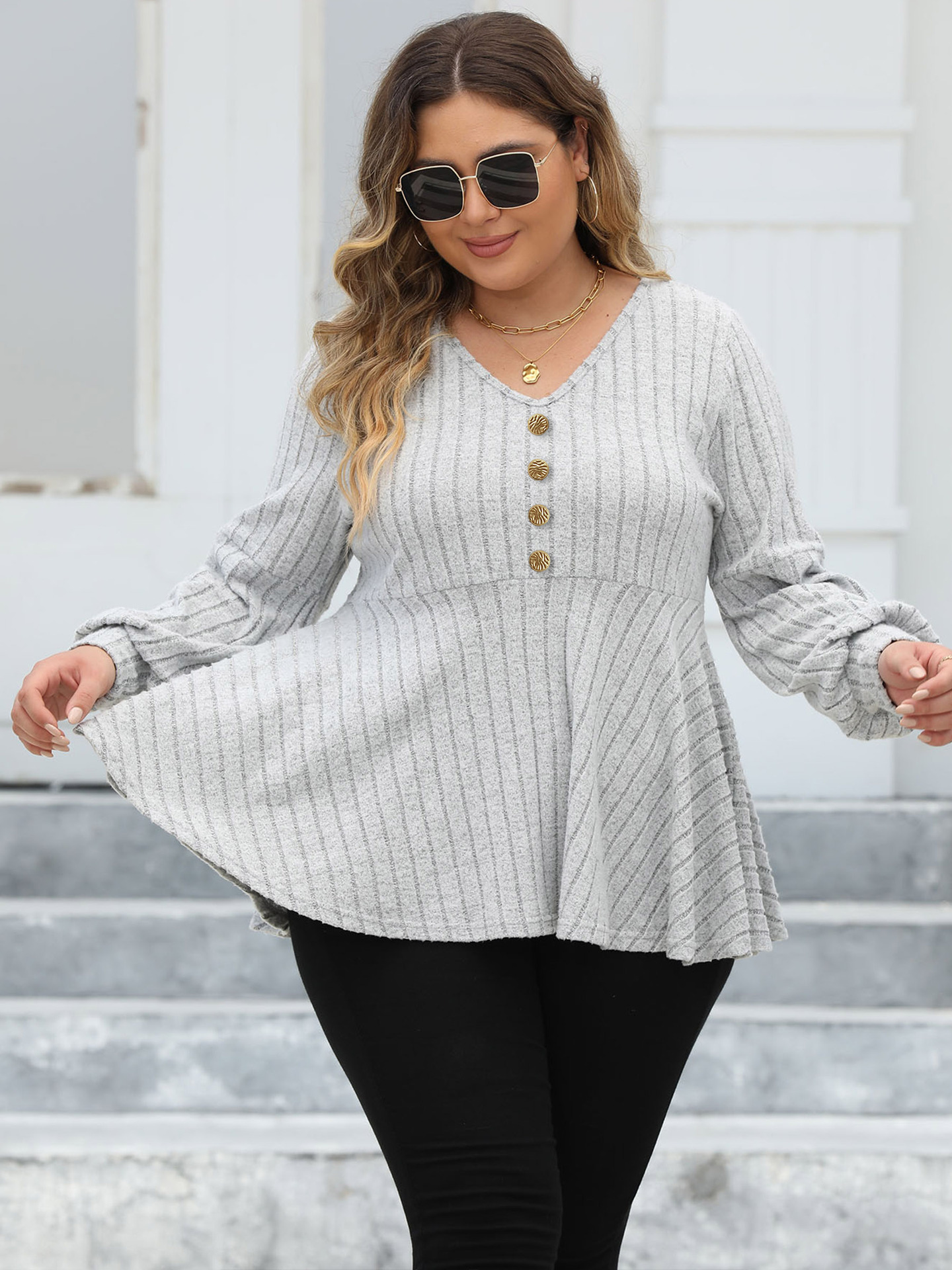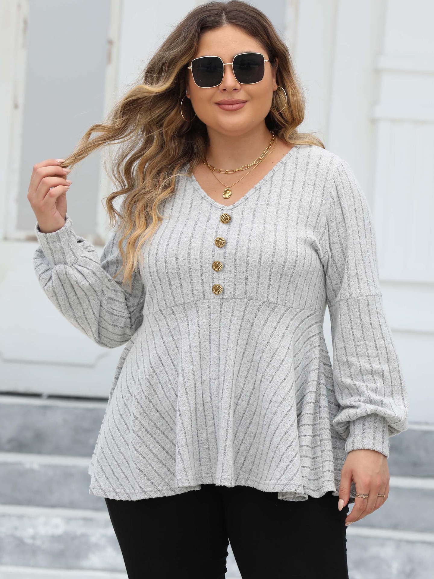Женские топы больших размеров, женская рубашка-бебидолл с v-образным вырезом, флисовая футболка с рукавами-фонариками, декоративный топ с золотыми пуговицами