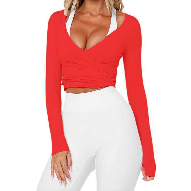 2025 трансграничный европейский и американский стиль, весенний новый простой стиль, сексуальный тонкий топ с v-образным вырезом и длинными рукавами для женщин