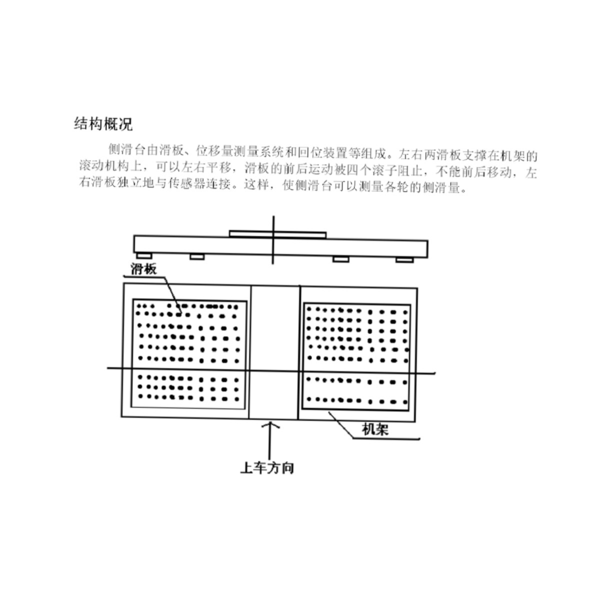 侧滑台由滑板、位移量测量系统和回位装置等组成。左右两滑板支撑在机架的滚动机*构上,可以左右平移,滑板的前后运动被四个滚子阻止,不能前后移动,左右滑板独立地与传感器连接。这样,使侧滑台可以测量各轮的侧滑量。