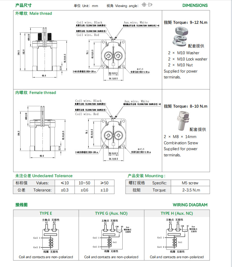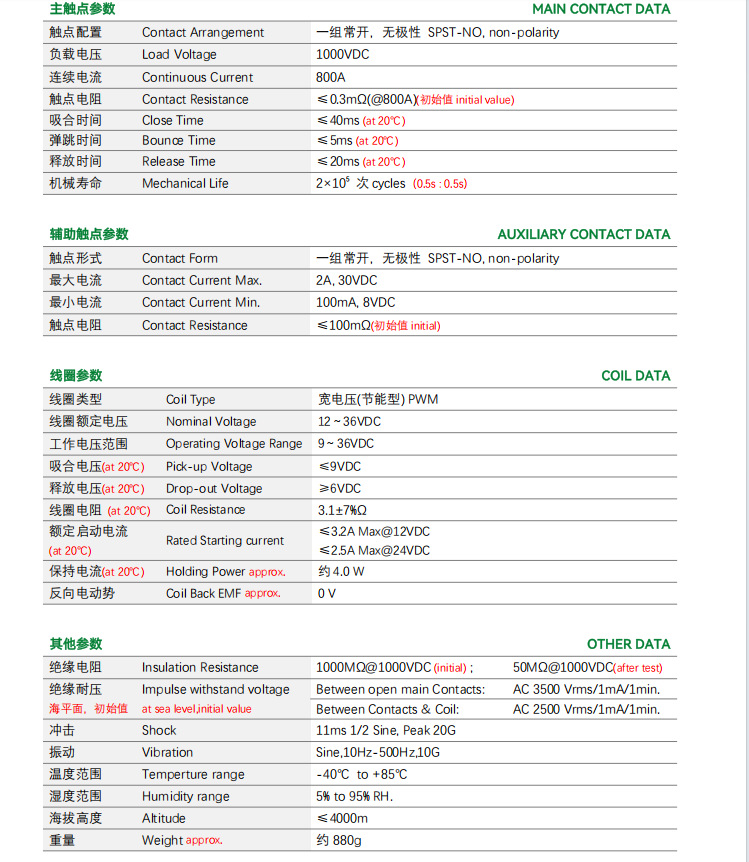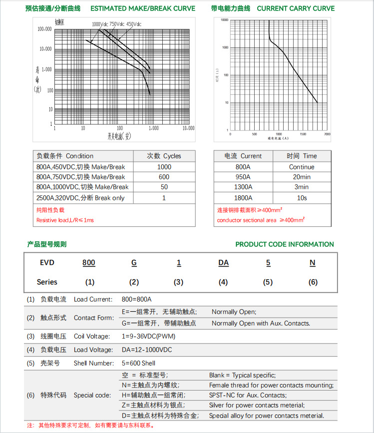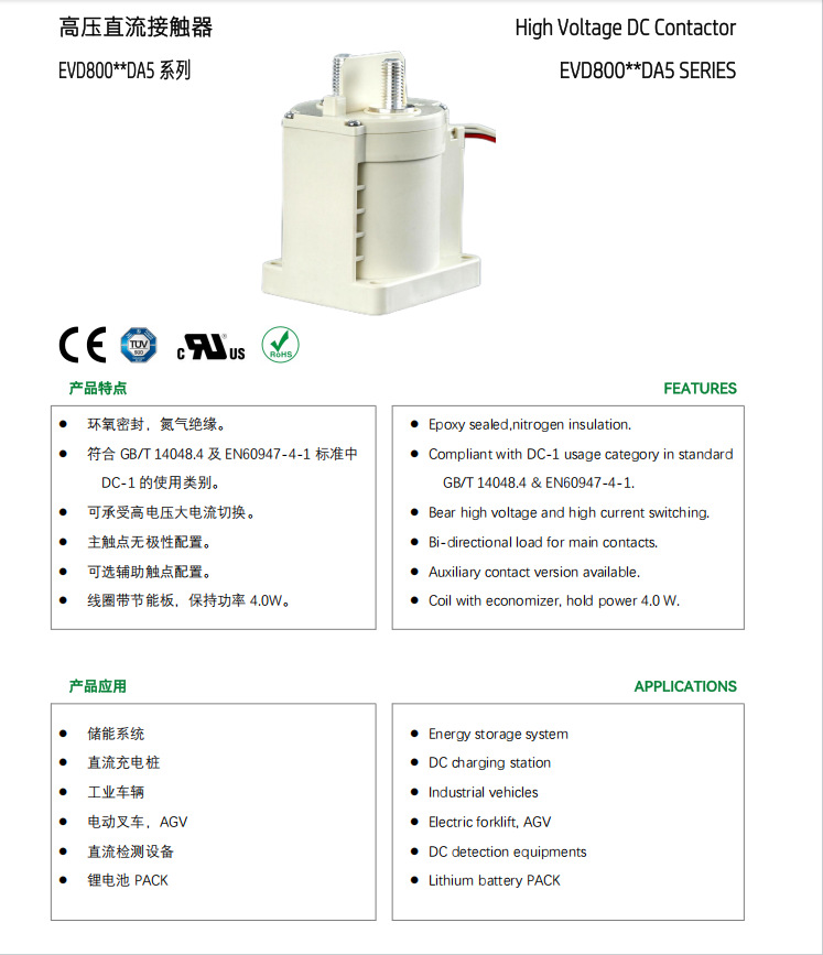 Контактор постоянного тока высокого напряжения 800А EVD800E1DA5 с дополнительным переключателем, контактор зарядки без полярности