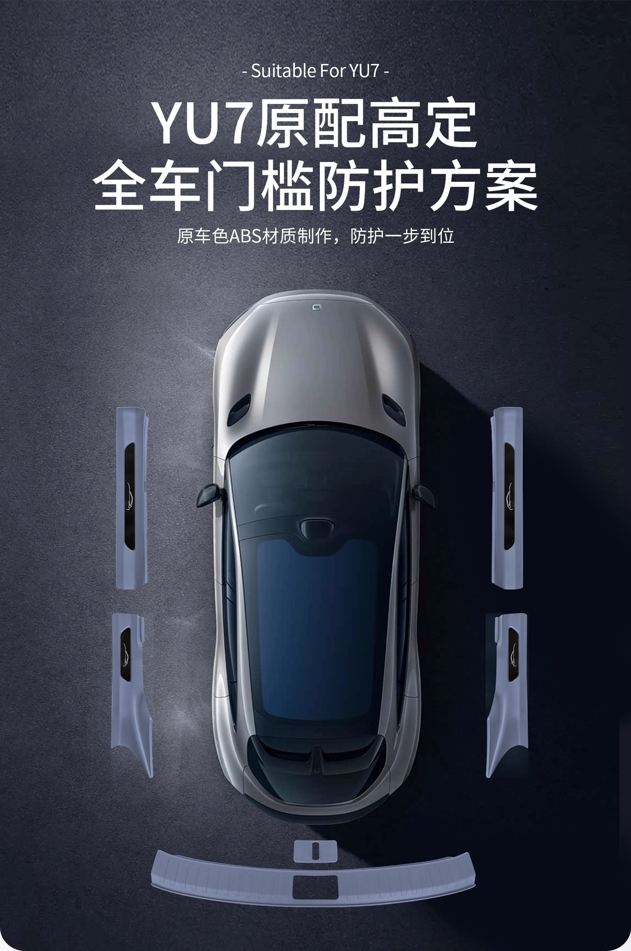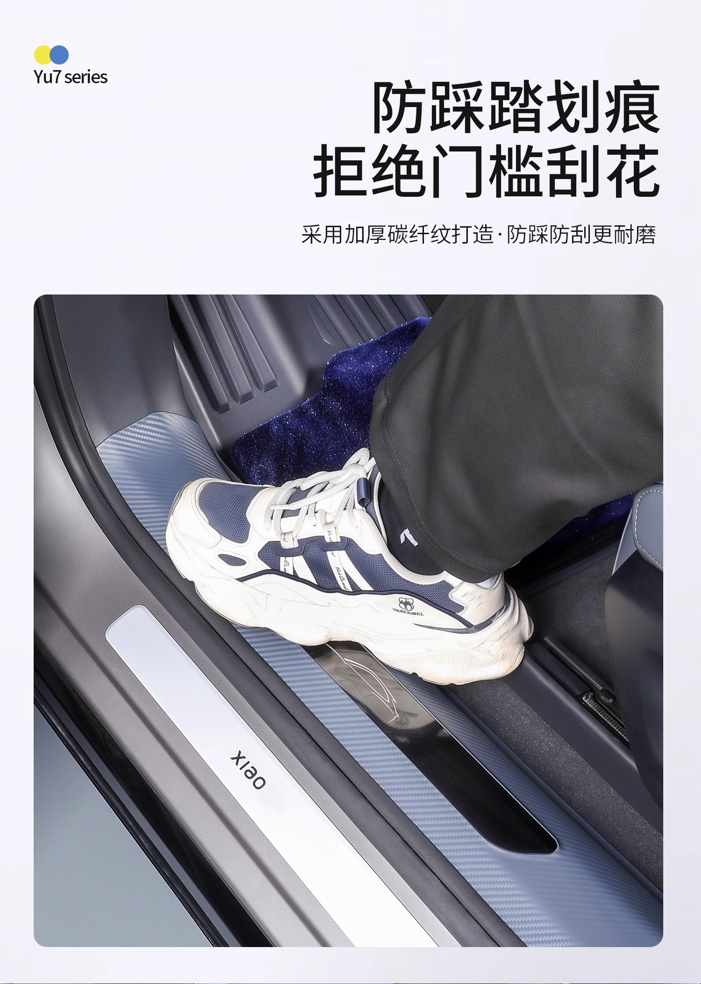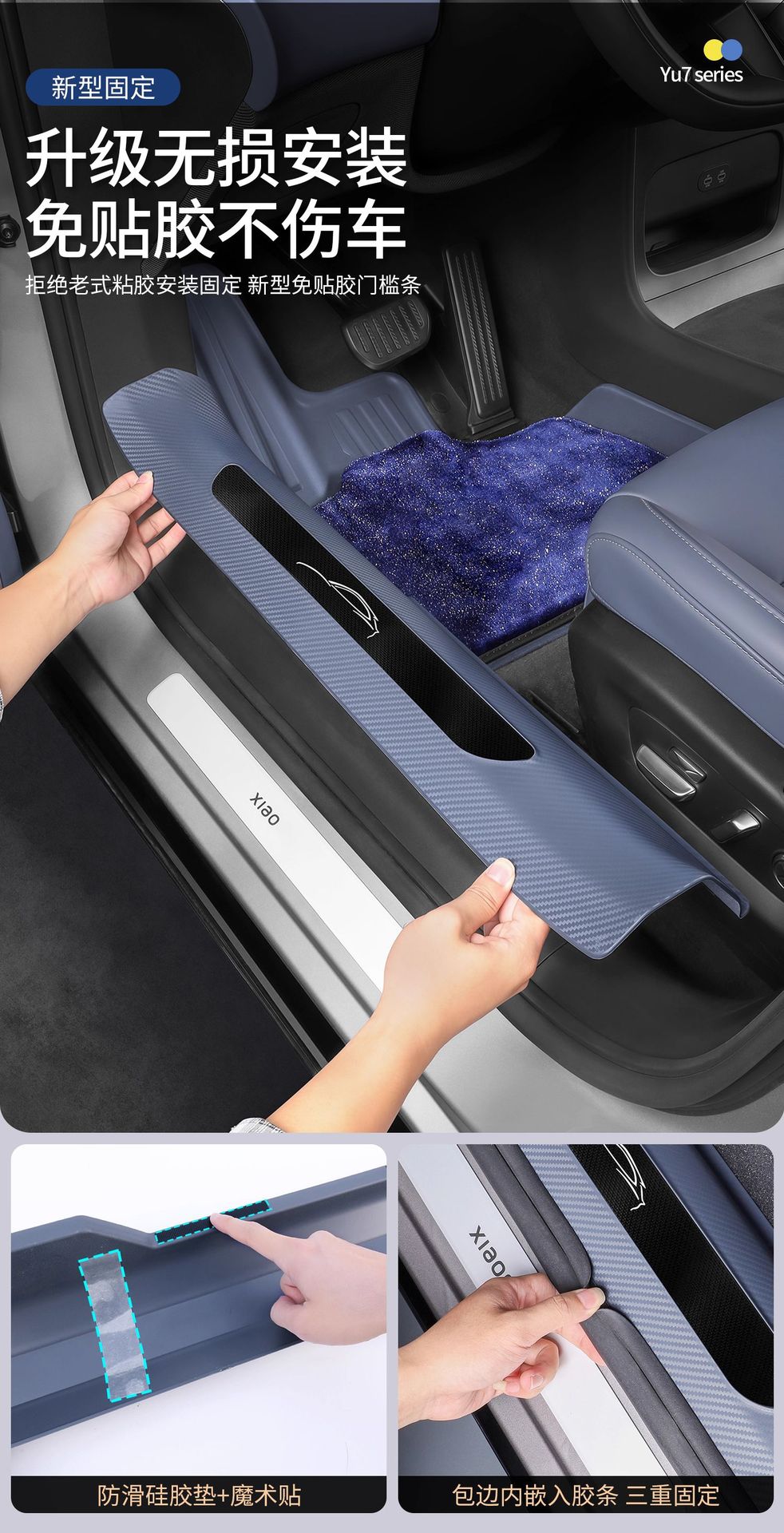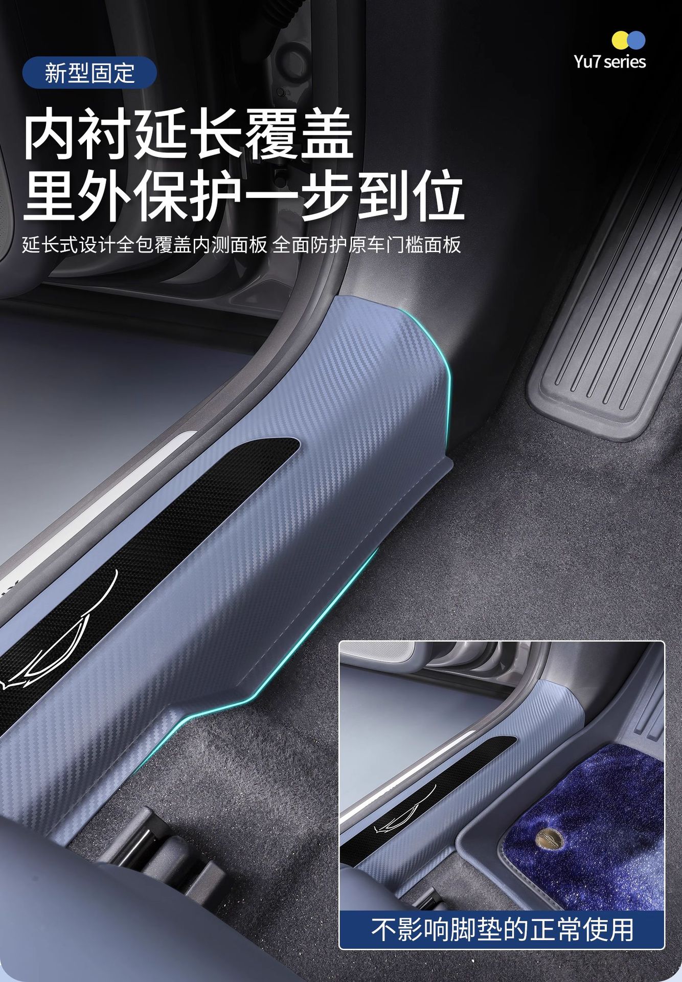 Новый улучшенный комплект из пяти накладок на пороги YU7 без клея с рисунком под карбон, включая коврик для прихожей и защиту от царапин на багажник.