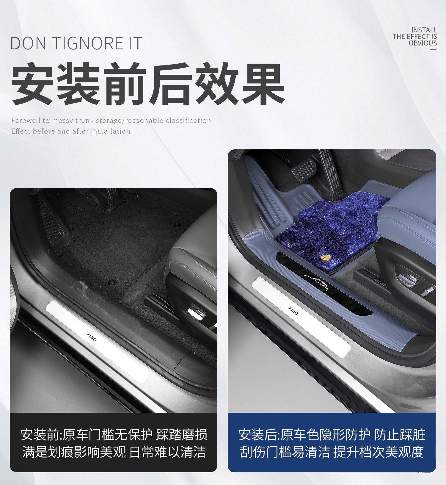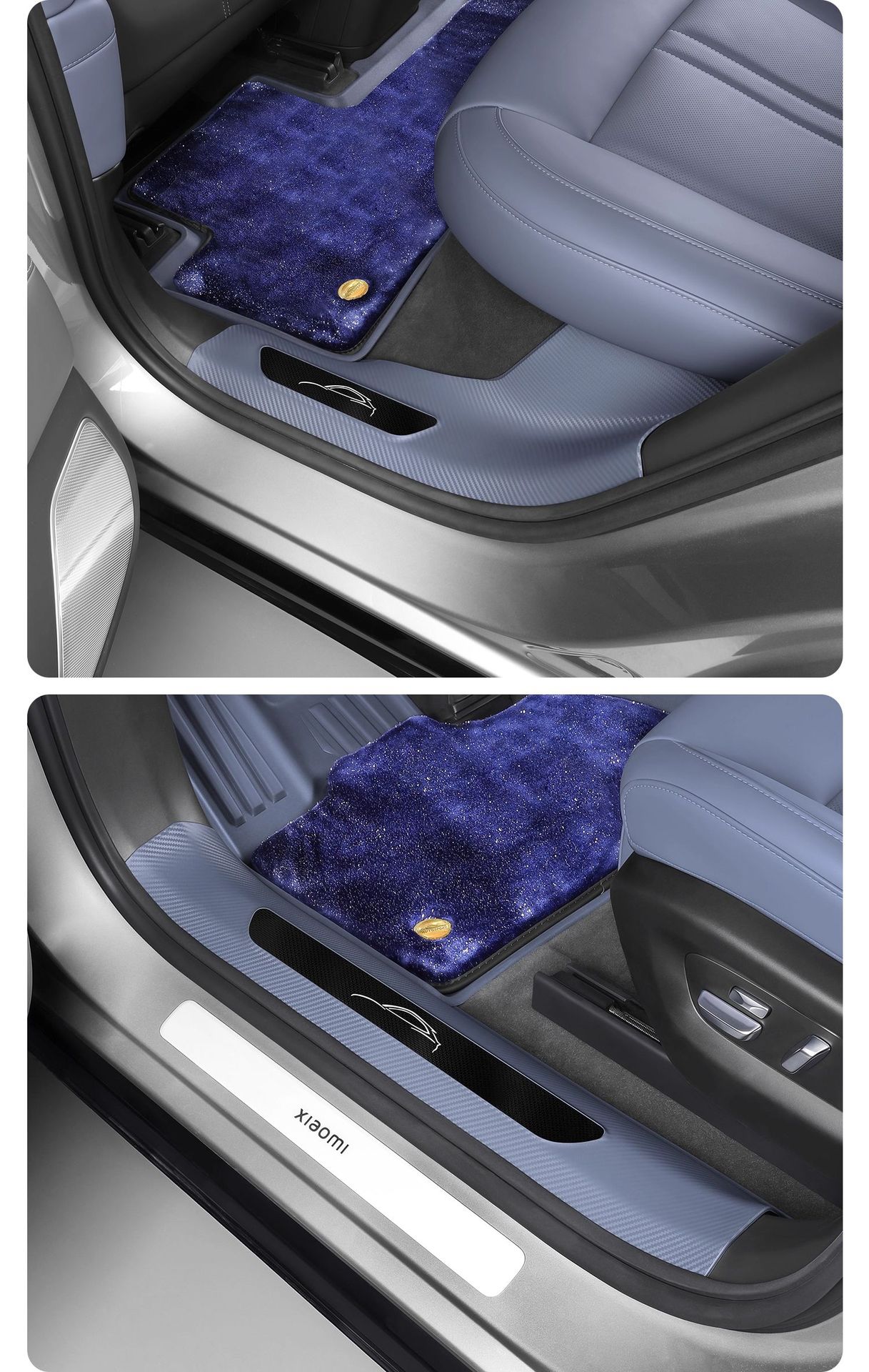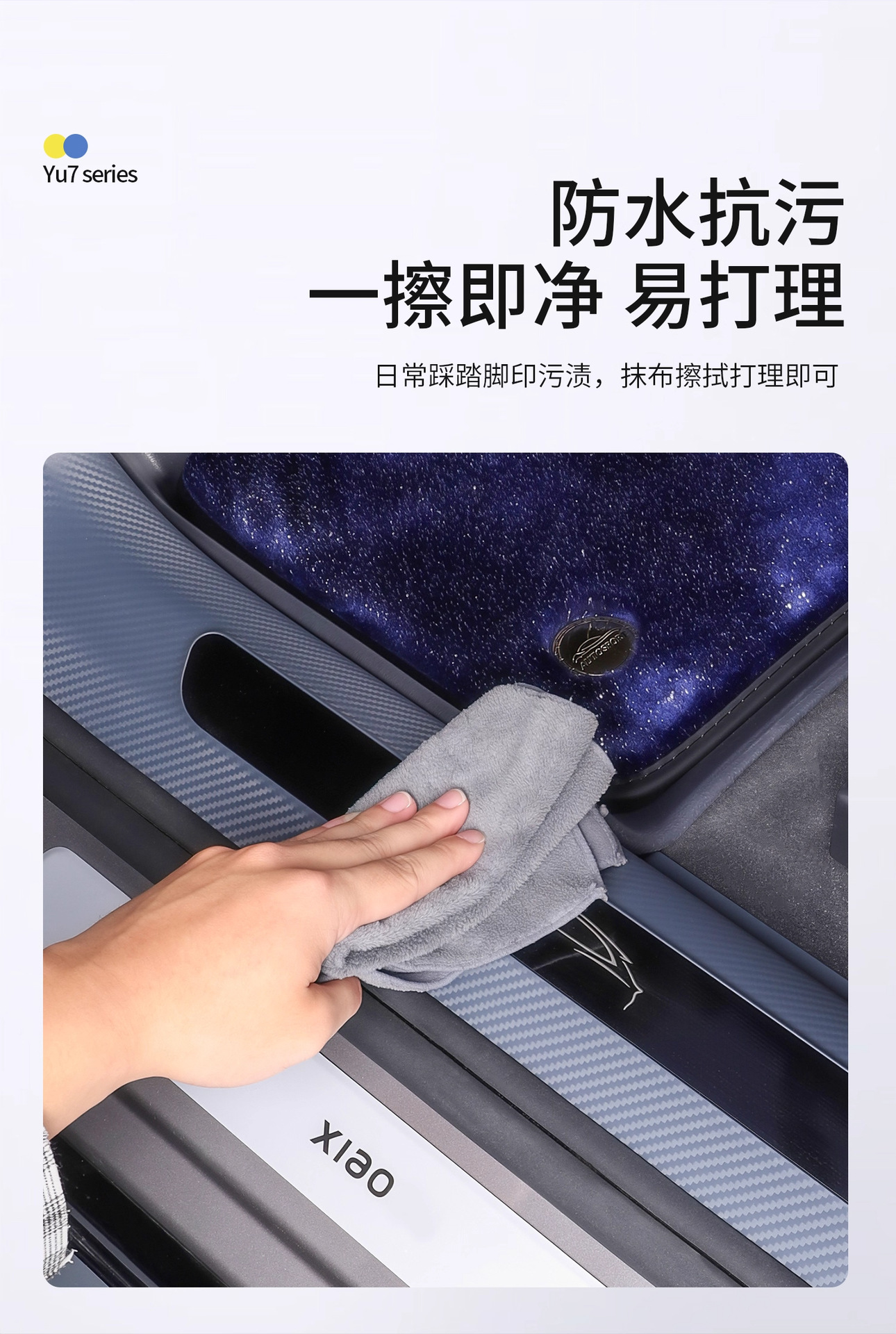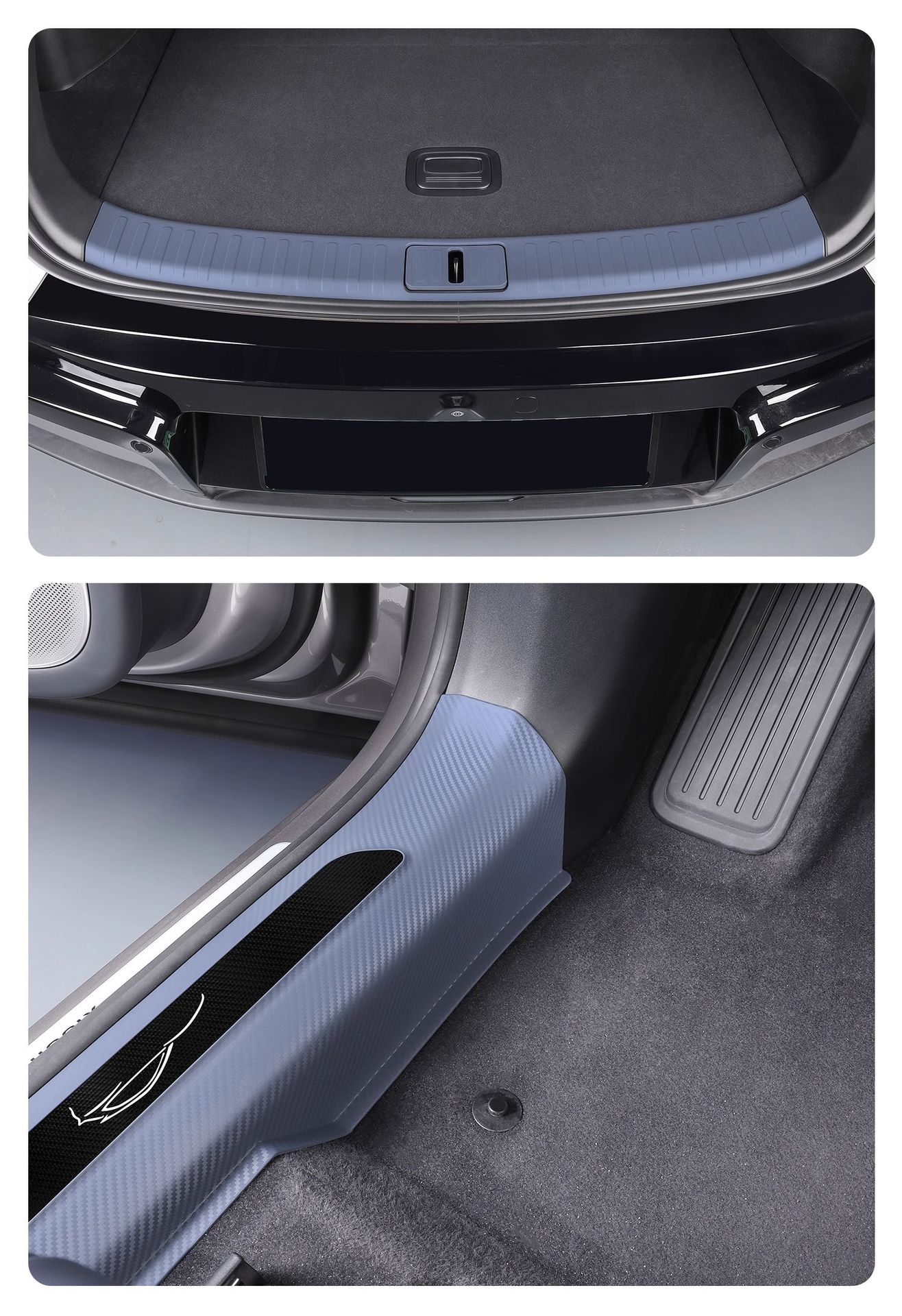 Новый улучшенный комплект из пяти накладок на пороги YU7 без клея с рисунком под карбон, включая коврик для прихожей и защиту от царапин на багажник.