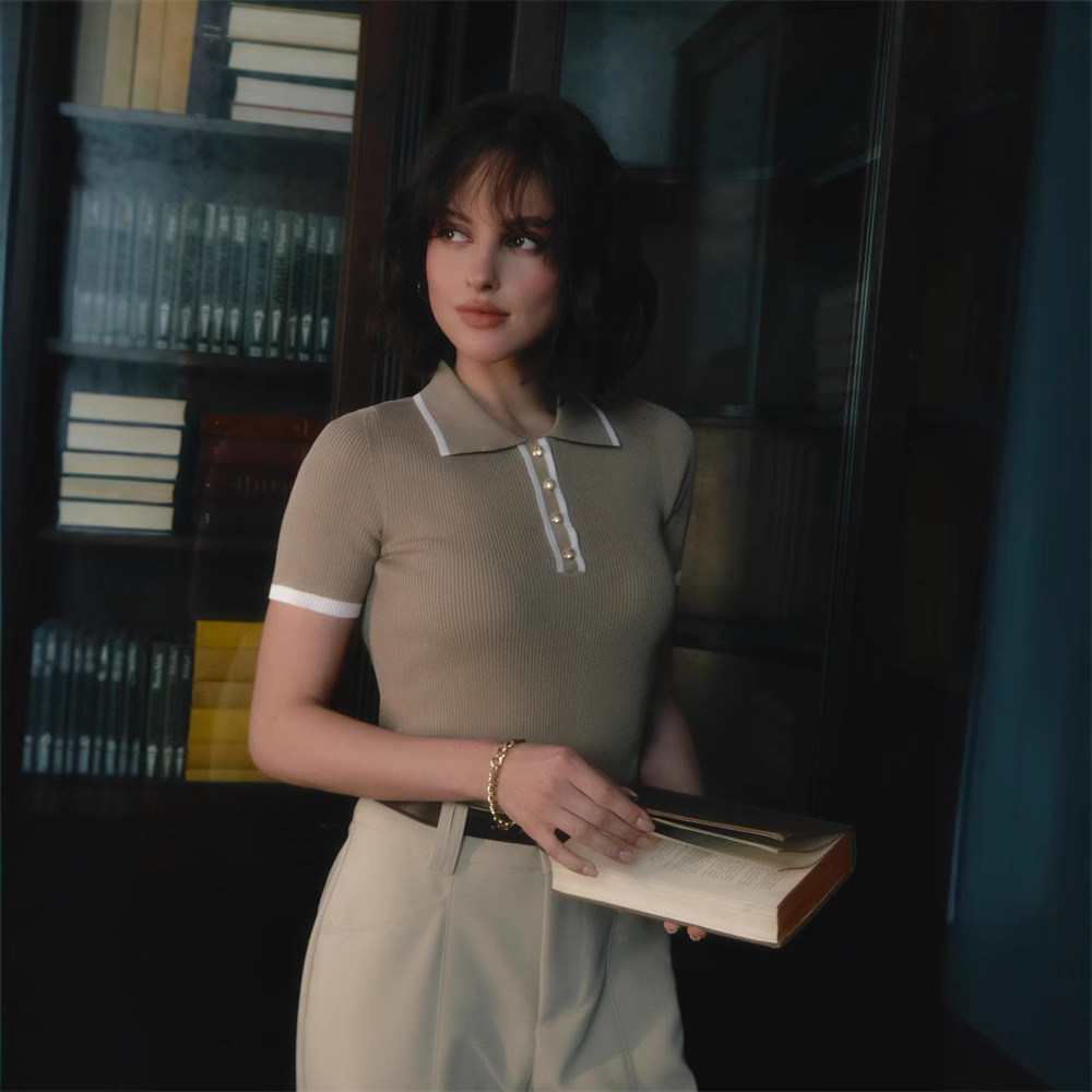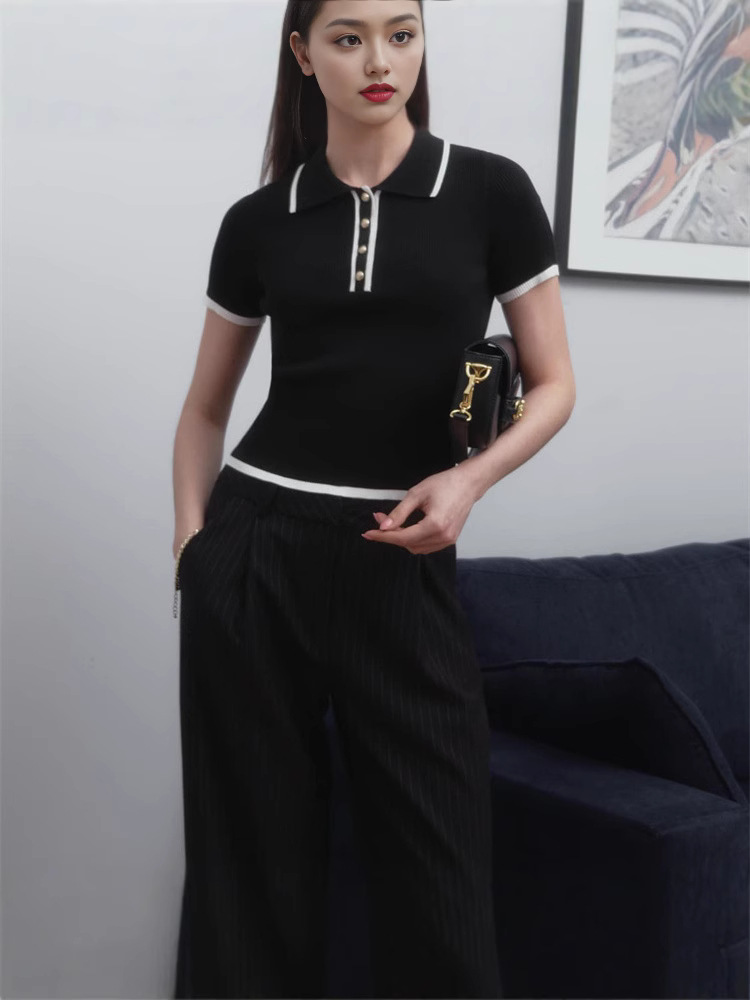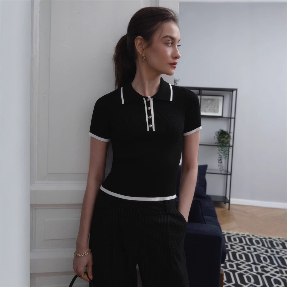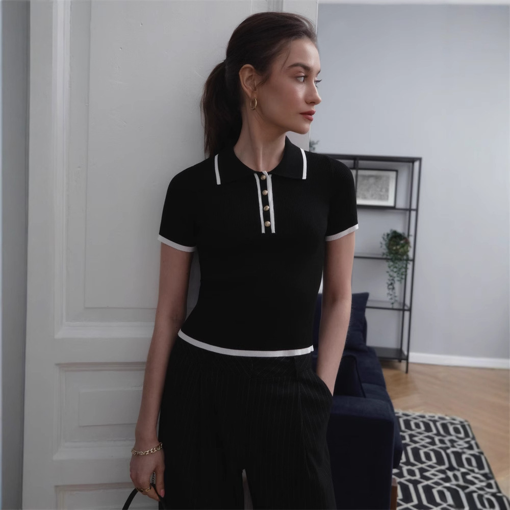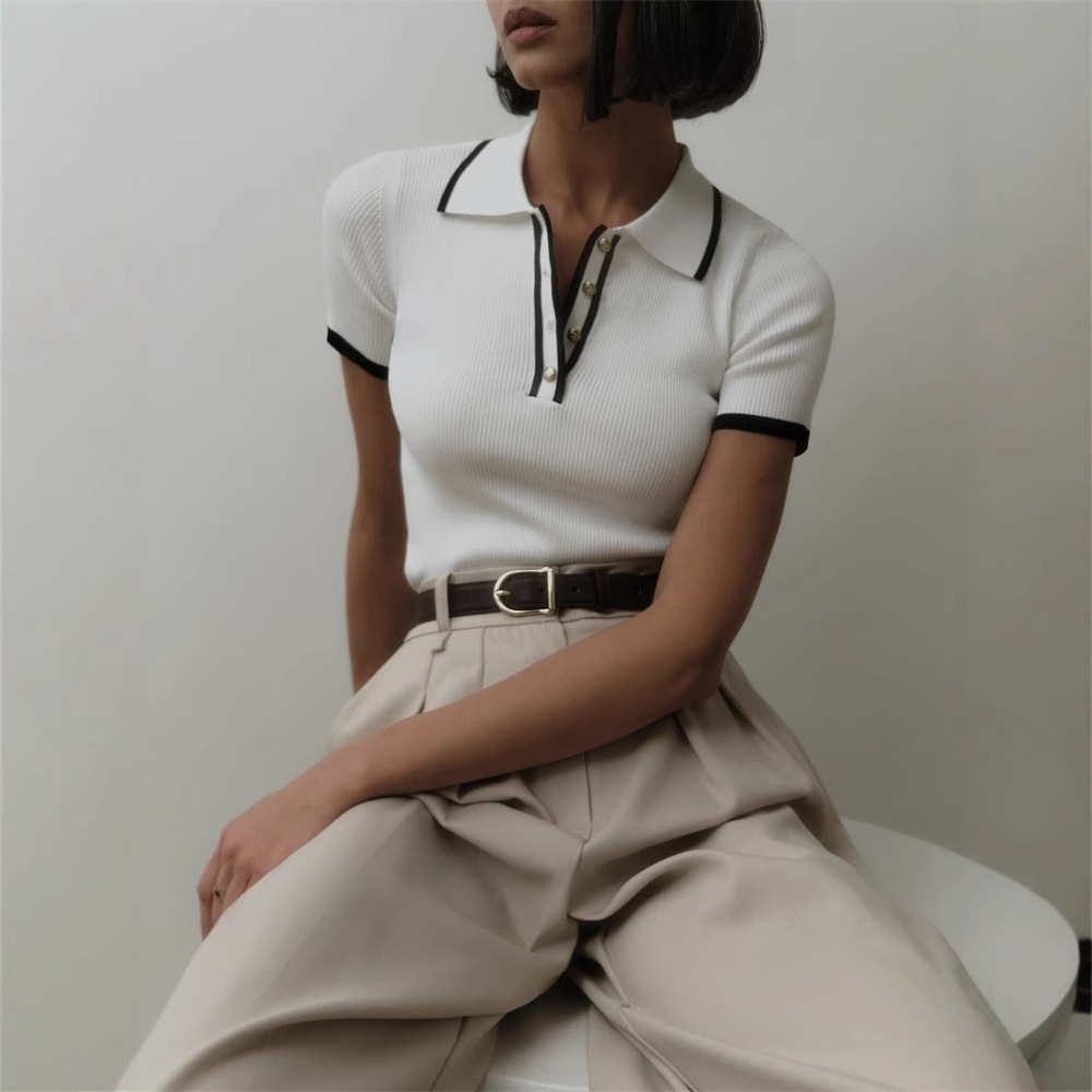 Облегающий топ с короткими рукавами и лацканами, лето 2025, новый стиль, облегающий трикотаж контрастного цвета в европейском и американском стиле.