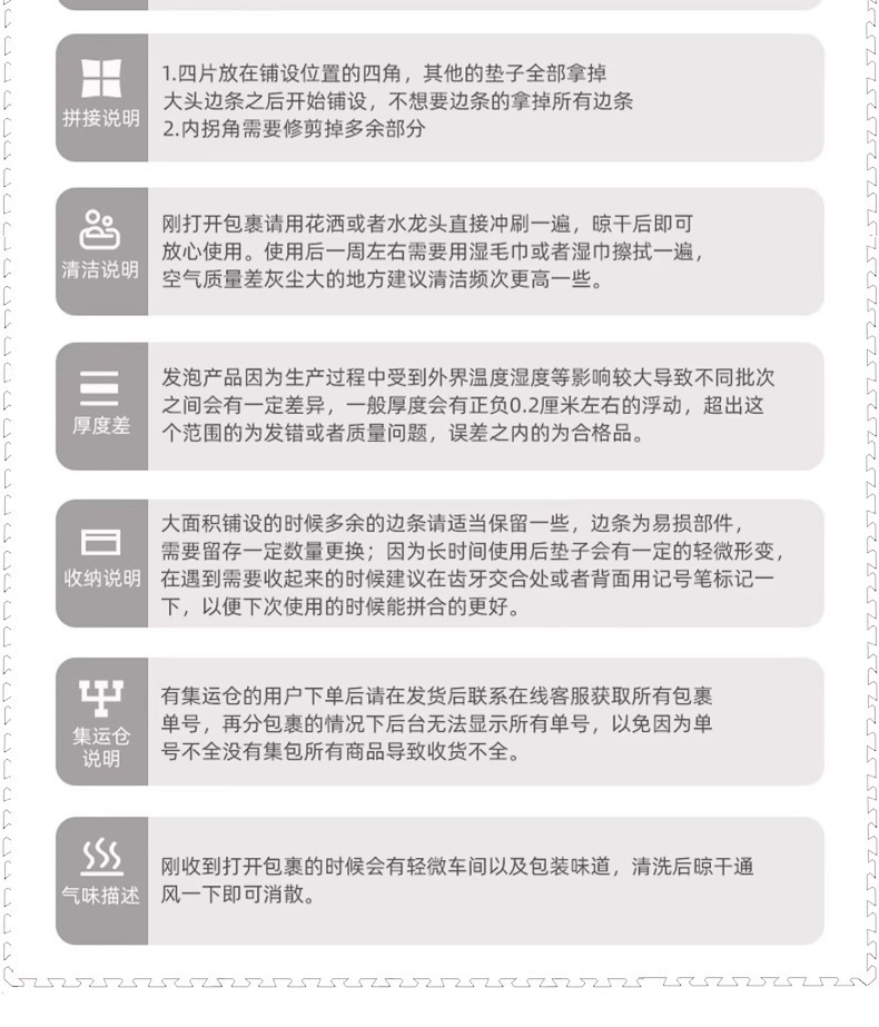 关于气味:因地垫生产下线后马上密封包装发货,会有些许气味残留,是生产没有办法避免的新料味道,可以用清水冲洗后放置在通风的地方散味三天左右,介意的亲请慎拍。