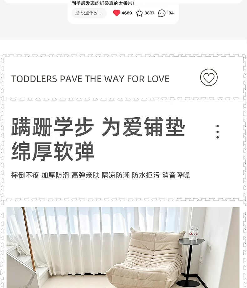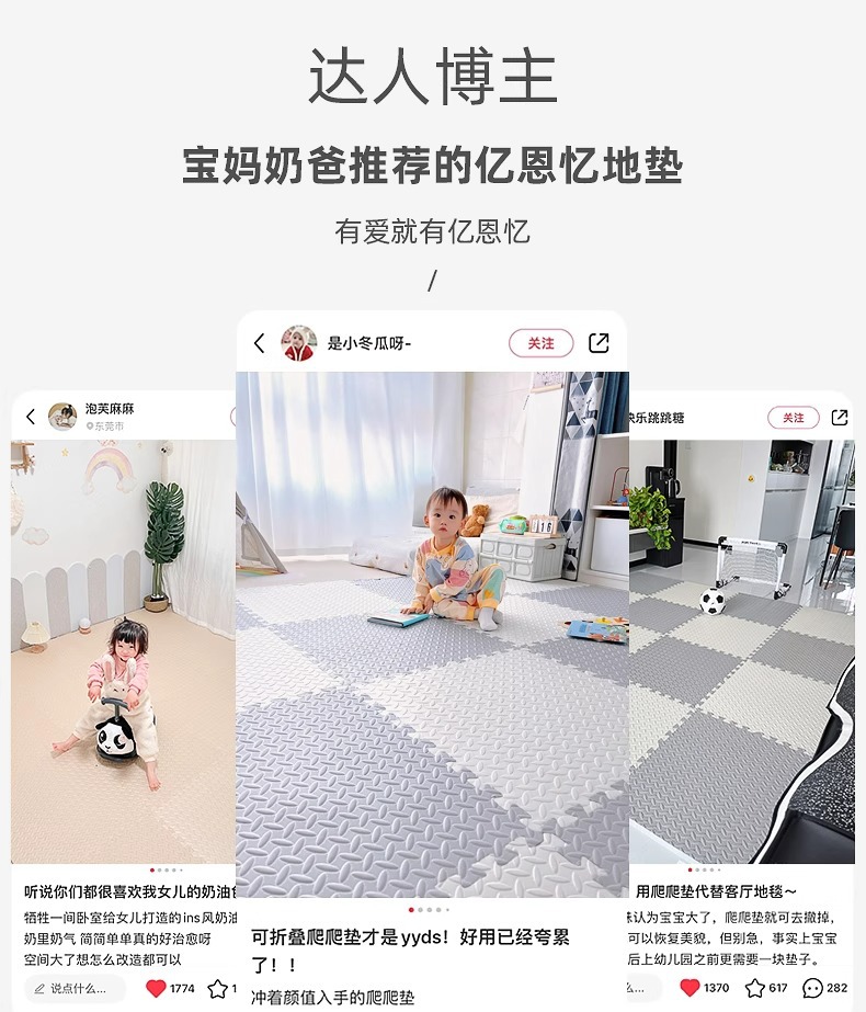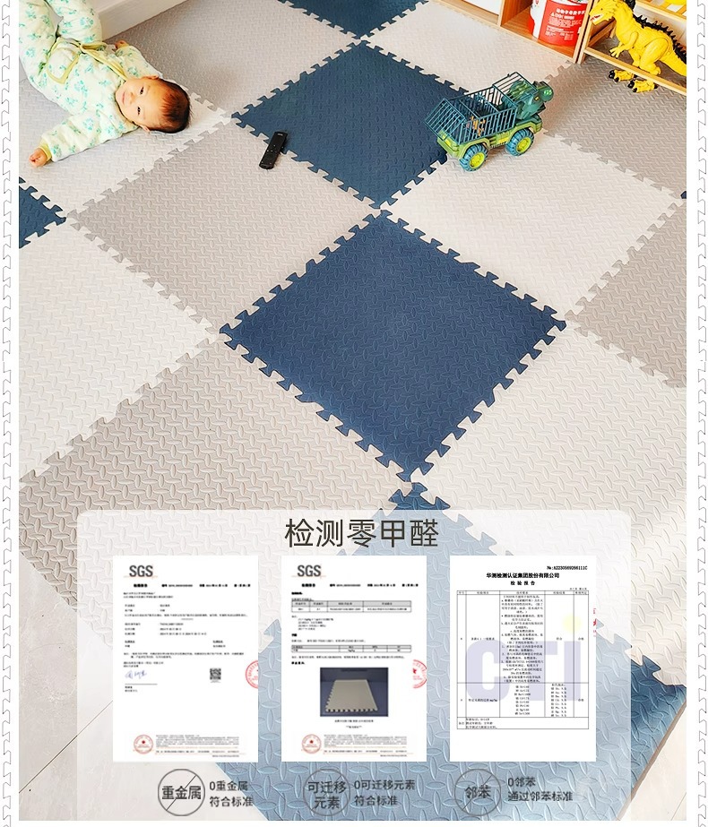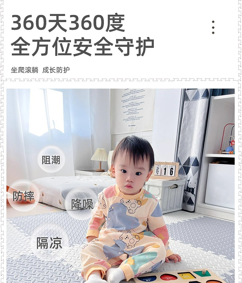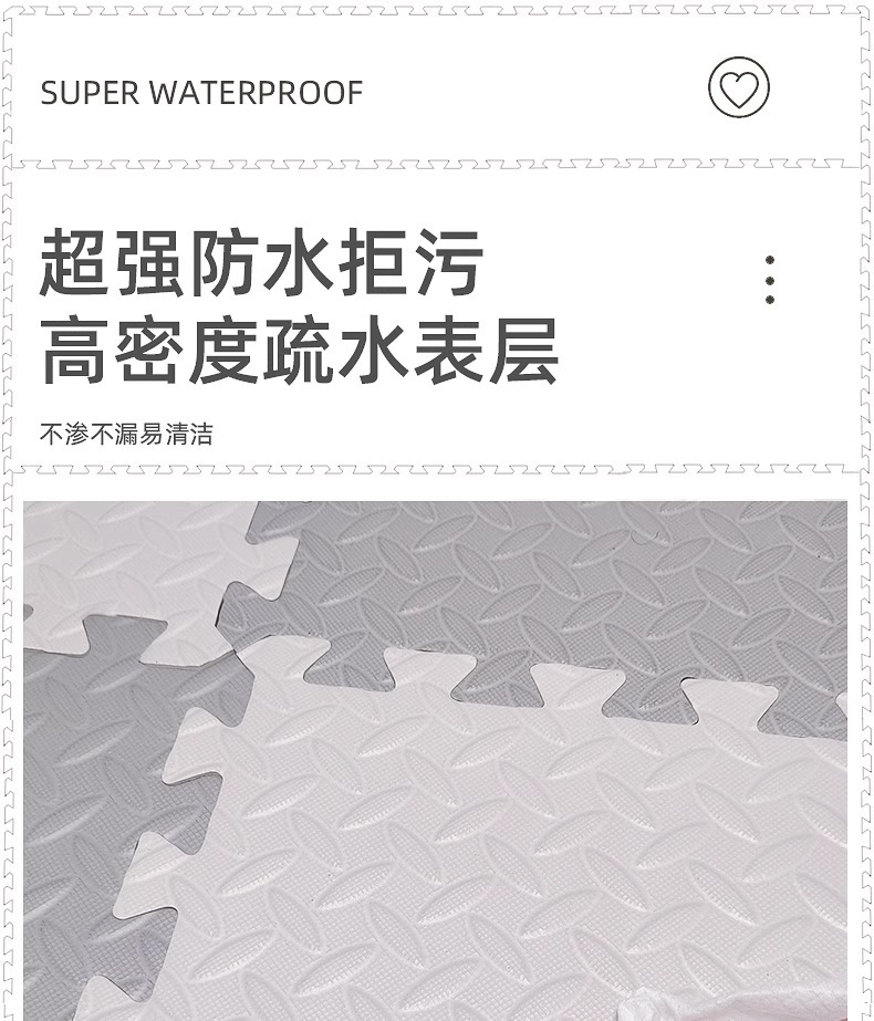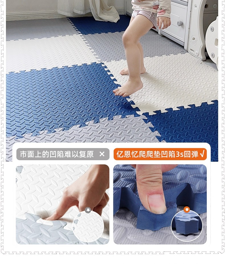 关于尺寸:地垫高温发泡一次成型,厚度会有1-2mm的工业误差,没法避免,用直尺或者卷尺测量建议把地垫摞起来测10个取平均厚度较为准确;长宽尺寸由于手工测量可能存在1-3cm的误差;对尺寸要求精准的亲慎拍。