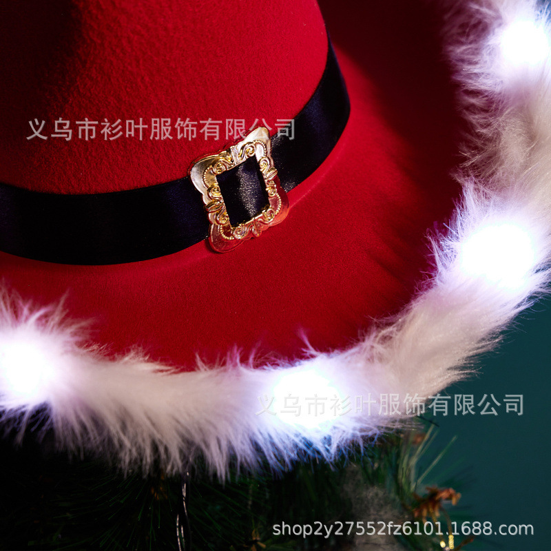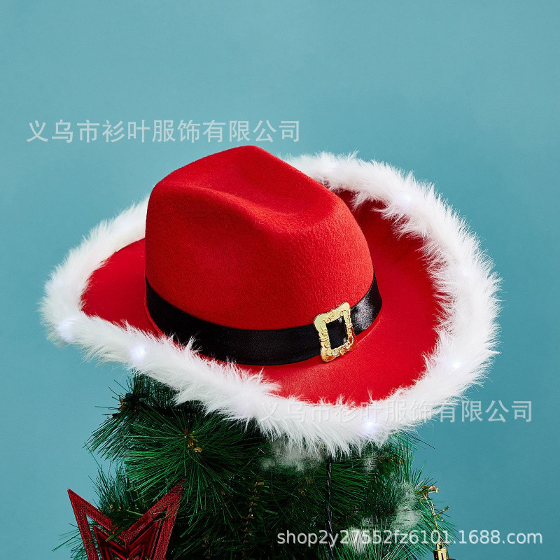 Рождественская ковбойская шляпа с перьями и подсветкой, красная ковбойская шляпа в стиле вестерн, шляпа Санта-Клауса с необработанным краем и фонариком