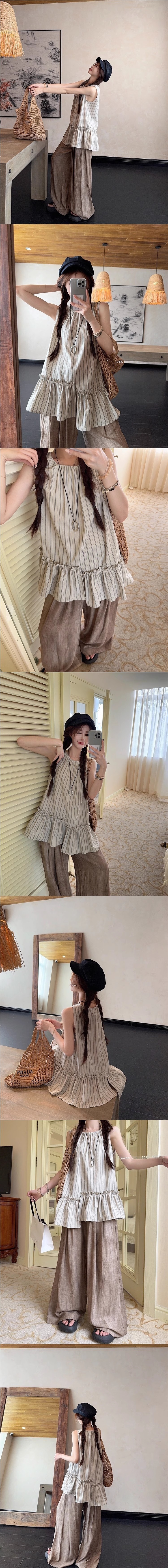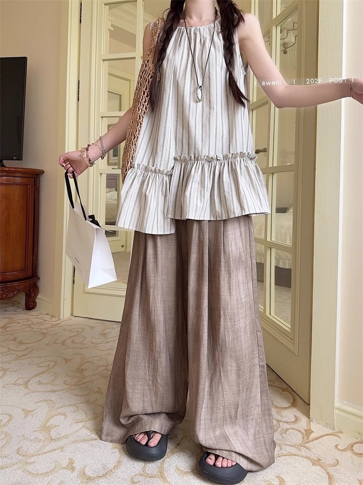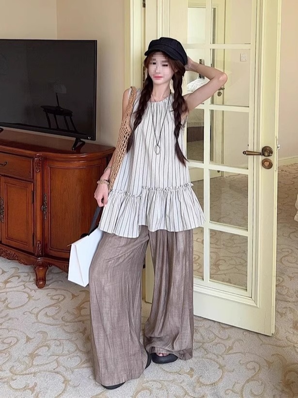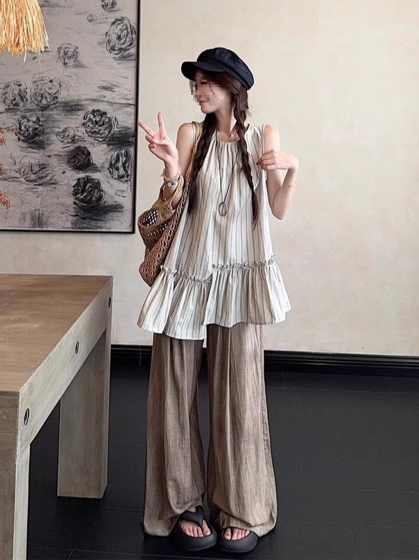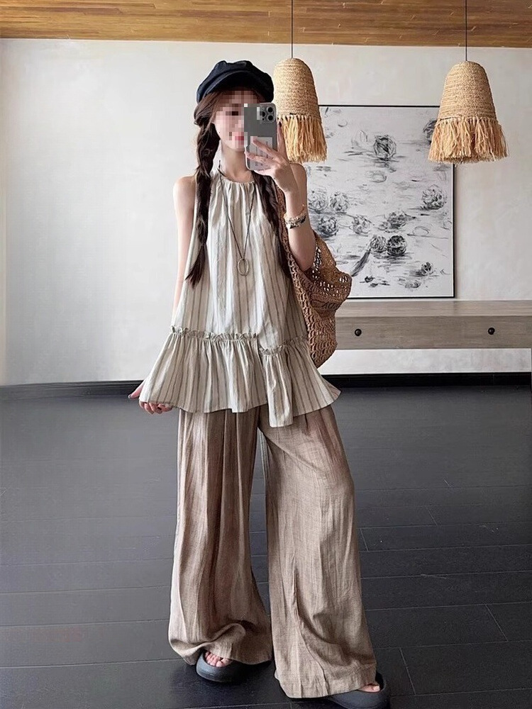 Летний наряд: полный комплект женской одежды с элегантным и шикарным топом без рукавов в полоску и широкими брюками в стиле «чернильный принт».
