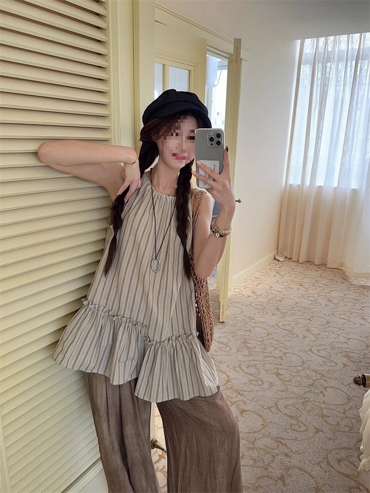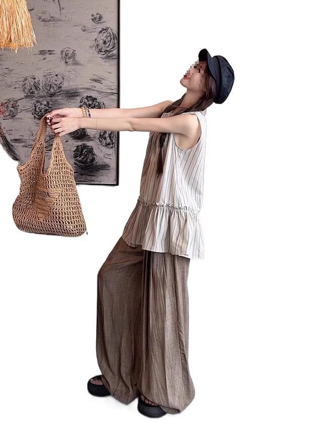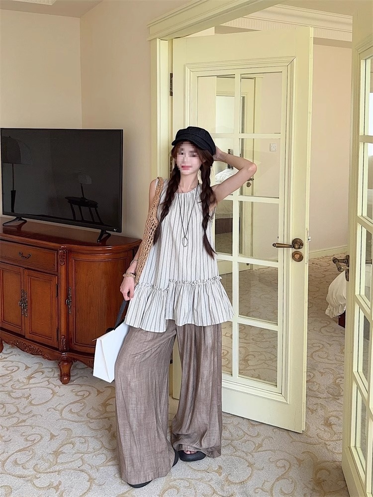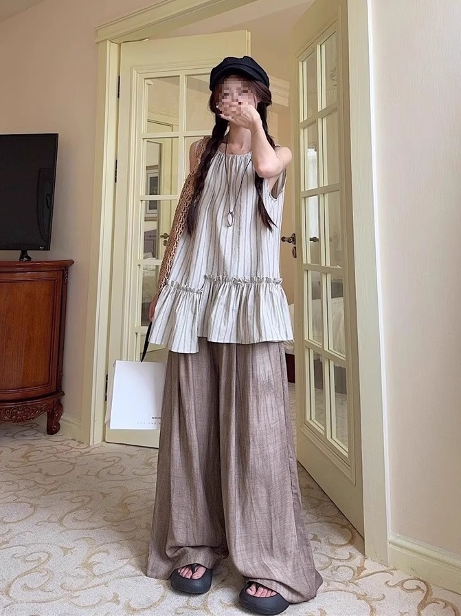Летний наряд: полный комплект женской одежды с элегантным и шикарным топом без рукавов в полоску и широкими брюками в стиле «чернильный принт».