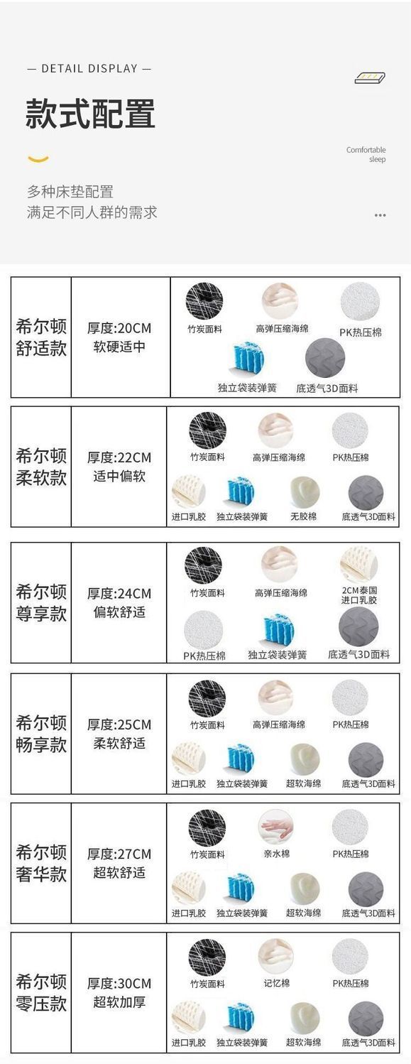 20 см (умеренная мягкость и твердость) Hilton черный удобный стиль; 22 см (от умеренного до мягкого) Модель Hilton black soft; 24 см (мягкая и удобная) Эксклюзивная модель Hilton черного цвета.; 27 см (пятизвездочное удовольствие) Роскошная модель Hilton черного цвета; 30 см (Hotel Enjoyment) Модель Hilton Black Zero Pressure
