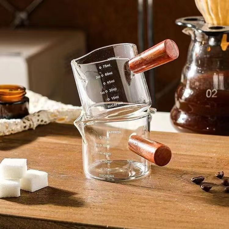 Оптовая продажа от производителя: мерный стакан для экстракции эспрессо с мерной шкалой, кувшин для молока с деревянной ручкой, мерный стаканчик для дозирования с двойным носиком и шкалой.